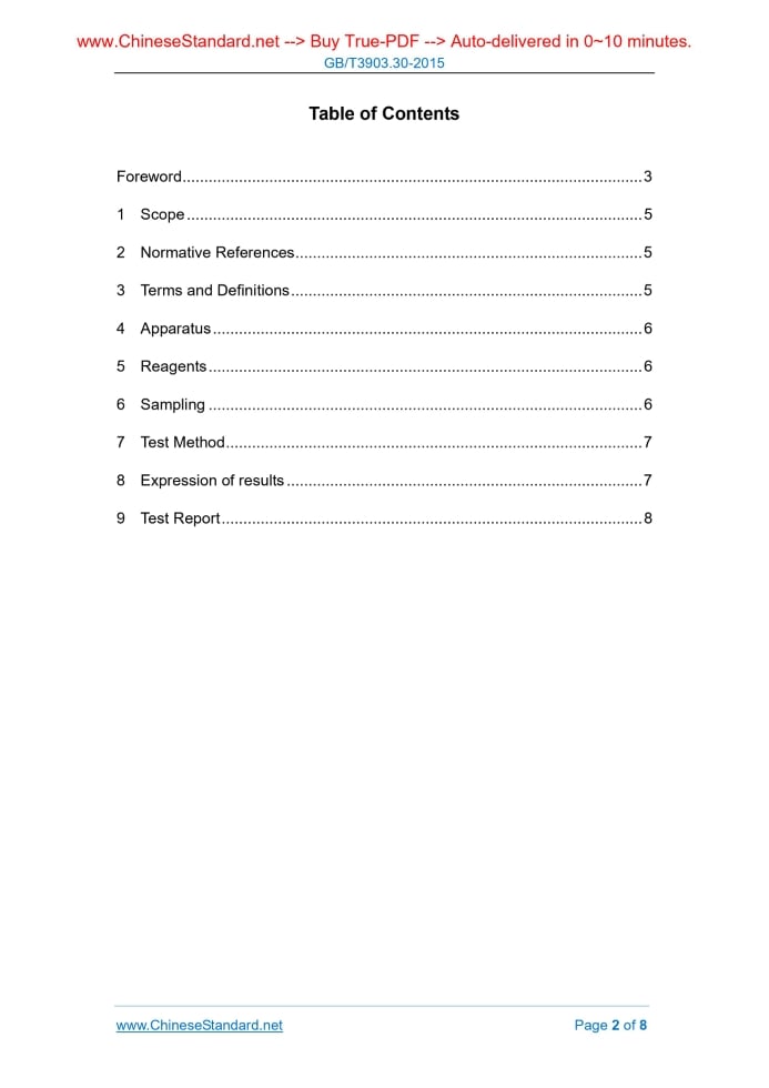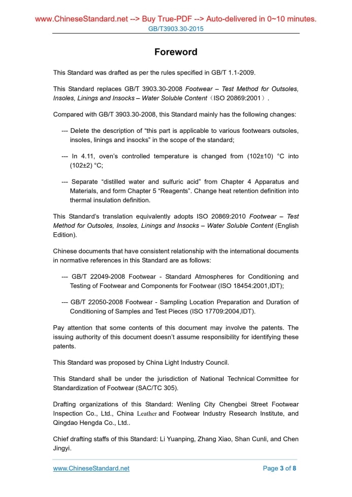 Similar standardsGB/T 3903.30-2015: Footwear -- Test method for outsoles, insoles, linings and insocks -- Water soluble content---This is an excerpt. Full copy of true-PDF in English version (including equations, symbols, images, flow-chart, tables, and figures etc.), auto-downloaded/delivered in 9 seconds, can be purchased online: https://www.ChineseStandard.net/PDF.aspx/GBT3903.30-2015 GB NATIONAL STANDARD OF THE PEOPLE’S REPUBLIC OF CHINA ICS 61.060 Y 78 GB/T 3903.30-2015 / ISO 20869.2010 Replacing GB/T 3903.30-2008 Footwear – Test Method for Outsoles, Insoles, Linings and Insocks – Water Soluble Content (ISO 20869.2010,IDT) Issued on: SEPTEMBER 11, 2015 Implemented on: APRIL 1, 2016 Issued by. General Administration of Quality Supervision, Inspection and Quarantine; Standardization Administration of PRC. Table of ContentsForeword ... 3 1 Scope ... 5 2 Normative References ... 5 3 Terms and Definitions ... 5 4 Apparatus ... 6 5 Reagents ... 6 6 Sampling ... 6 7 Test Method ... 7 8 Expression of results ... 7 9 Test Report ... 8ForewordThis Standard was drafted as per the rules specified in GB/T 1.1-2009. This Standard replaces GB/T 3903.30-2008 Footwear – Test Method for Outsoles, Insoles, Linings and Insocks – Water Soluble Content(ISO 20869.2001). Compared with GB/T 3903.30-2008, this Standard mainly has the following changes. --- Delete the description of “this part is applicable to various footwears outsoles, insoles, linings and insocks” in the scope of the standard; --- In 4.11, oven’s controlled temperature is changed from (102±10) °C into (102±2) °C; --- Separate “distilled water and sulfuric acid” from Chapter 4 Apparatus and Materials, and form Chapter 5 “Reagents”. Change heat retention definition into thermal insulation definition. This Standard’s translation equivalently adopts ISO 20869.2010 Footwear – Test Method for Outsoles, Insoles, Linings and Insocks – Water Soluble Content (English Edition). Chinese documents that have consistent relationship with the international documents in normative references in this Standard are as follows. --- GB/T 22049-2008 Footwear - Standard Atmospheres for Conditioning and Testing of Footwear and Components for Footwear (ISO 18454.2001,IDT); --- GB/T 22050-2008 Footwear - Sampling Location Preparation and Duration of Conditioning of Samples and Test Pieces (ISO 17709.2004,IDT). Pay attention that some contents of this document may involve the patents. The issuing authority of this document doesn’t assume responsibility for identifying these patents. This Standard was proposed by China Light Industry Council. This Standard shall be under the jurisdiction of National Technical Committee for Standardization of Footwear (SAC/TC 305). Drafting organizations of this Standard. Wenling City Chengbei Street Footwear Inspection Co., Ltd., China Leather and Footwear Industry Research Institute, and Qingdao Hengda Co., Ltd.. Chief drafting staffs of this Standard. Li Yuanping, Zhang Xiao, Shan Cunli, and Chen Jingyi. Footwear – Test Method for Outsoles, Insoles, Linings and Insocks – Water Soluble Content1 ScopeThis Standard specifies a method for the determination of the water soluble contents for outsoles, insoles, lining and insocks.2 Normative ReferencesThe following documents are essential to the application of this document. For the dated documents, only the versions with the dates indicated are applicable to this document; for the undated documents, only the latest version (including all the amendments) are applicable to this standard. ISO 17709 Footwear — Sampling Location, Preparation and Duration of Conditioning of Samples and Test Pieces ISO 18454 Footwear — Standard Atmospheres for Conditioning and Testing of Footwear and Components for Footwear3 Terms and DefinitionsFor the purposes of this document, the following terms and definitions apply. 3.1 Water soluble matter Quantity of all those substances that, under certain conditions, are dissolved out of the material by water. 3.2 Water soluble inorganic substances Sulfated ash of water soluble substances. 3.3 Water soluble organic substances Difference between total water solubles and sulfated ash of water solubles. ......Source: Above contents are excerpted from the full-copy PDF -- translated/reviewed by: www.ChineseStandard.net / Wayne Zheng et al. Tips & Frequently Asked Questions:Question 1: How long will the true-PDF of English version of GB/T 3903.30-2015 be delivered?Answer: The full copy PDF of English version of GB/T 3903.30-2015 can be downloaded in 9 seconds, and it will also be emailed to you in 9 seconds (double mechanisms to ensure the delivery reliably), with PDF-invoice.Question 2: Can I share the purchased PDF of GB/T 3903.30-2015_English with my colleagues?Answer: Yes. The purchased PDF of GB/T 3903.30-2015_English will be deemed to be sold to your employer/organization who actually paid for it, including your colleagues and your employer's intranet.Question 3: Does the price include tax/VAT?Answer: Yes. Our tax invoice, downloaded/delivered in 9 seconds, includes all tax/VAT and complies with 100+ countries' tax regulations (tax exempted in 100+ countries) -- See Avoidance of Double Taxation Agreements (DTAs): List of DTAs signed between Singapore and 100+ countriesQuestion 4: Do you accept my currency other than USD?Answer: Yes. www.ChineseStandard.us -- GB/T 3903.30-2015 -- Click this link and select your country/currency to pay, the exact amount in your currency will be printed on the invoice. Full PDF will also be downloaded/emailed in 9 seconds.Question 5: Should I purchase the latest version GB/T 3903.30-2015?Answer: Yes. Unless special scenarios such as technical constraints or academic study, you should always prioritize to purchase the latest version GB/T 3903.30-2015 even if the enforcement date is in future. Complying with the latest version means that, by default, it also complies with all the earlier versions,