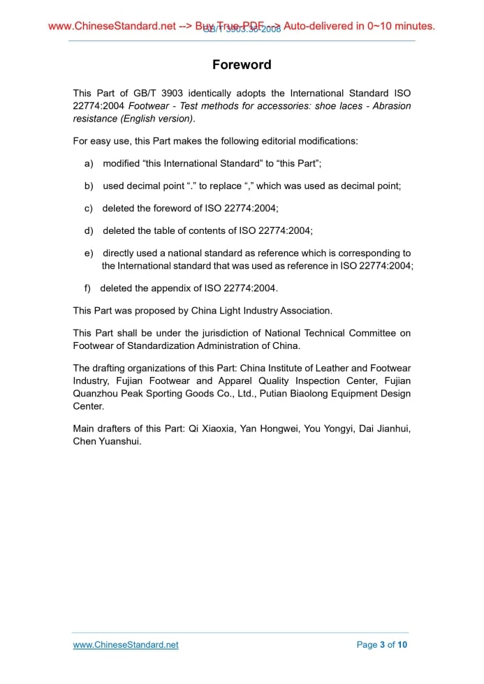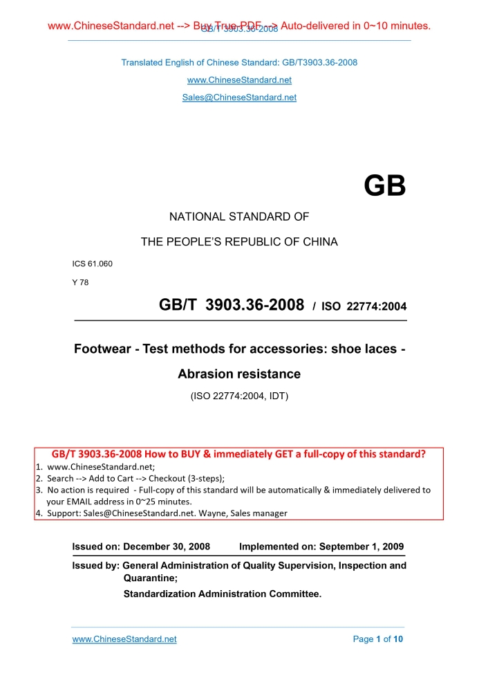 GB/T 3903.36-2008: Footwear -- Test methods for accessories: shoe laces -- Abrasion resistance Delivery: 9 seconds. True-PDF full-copy in English & invoice will be downloaded + auto-delivered via email. See step-by-step procedure Status: Valid