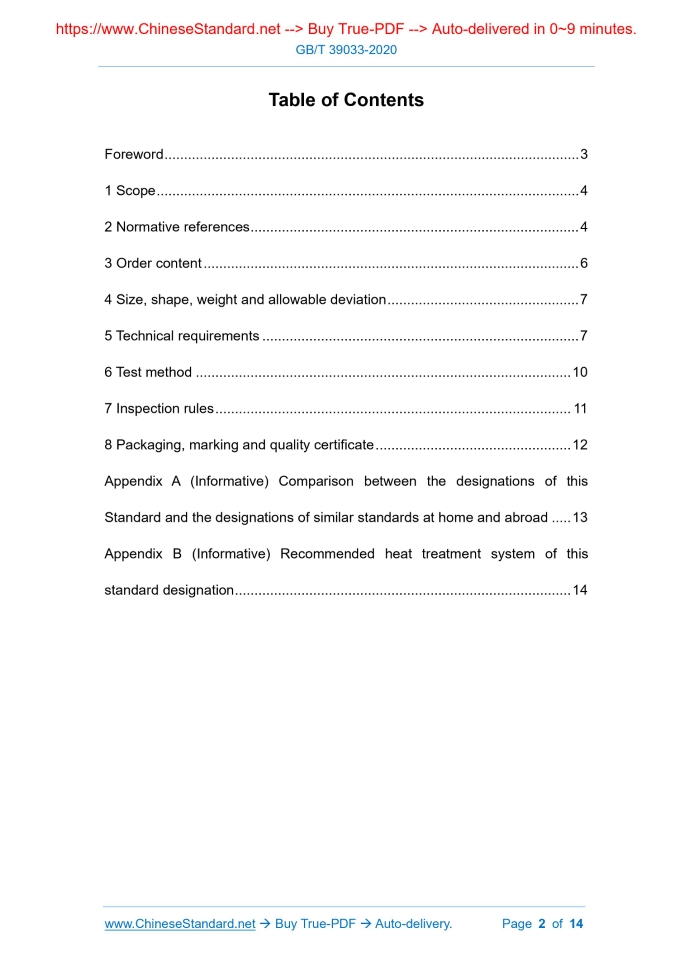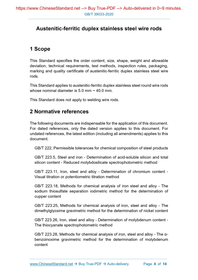 Similar standardsGB/T 39033-2020: Austenitic-ferritic duplex stainless steel wire rods---This is an excerpt. Full copy of true-PDF in English version (including equations, symbols, images, flow-chart, tables, and figures etc.), auto-downloaded/delivered in 9 seconds, can be purchased online: https://www.ChineseStandard.net/PDF.aspx/GBT39033-2020GB NATIONAL STANDARD OF THE PEOPLE’S REPUBLIC OF CHINA ICS 77.140.60 H 44 Austenitic-ferritic duplex stainless steel wire rods ISSUED ON: JULY 21, 2020 IMPLEMENTED ON: FEBRUARY 01, 2021 Issued by: State Administration for Market Regulation; Standardization Administration of the People’s Republic of China. Table of ContentsForeword ... 3 1 Scope ... 4 2 Normative references ... 4 3 Order content ... 6 4 Size, shape, weight and allowable deviation ... 7 5 Technical requirements ... 7 6 Test method ... 10 7 Inspection rules ... 11 8 Packaging, marking and quality certificate ... 12 Appendix A (Informative) Comparison between the designations of this Standard and the designations of similar standards at home and abroad ... 13 Appendix B (Informative) Recommended heat treatment system of this standard designation ... 14 Austenitic-ferritic duplex stainless steel wire rods1 ScopeThis Standard specifies the order content, size, shape, weight and allowable deviation, technical requirements, test methods, inspection rules, packaging, marking and quality certificate of austenitic-ferritic duplex stainless steel wire rods. This Standard applies to austenitic-ferritic duplex stainless steel round wire rods whose nominal diameter is 5.0 mm ~ 40.0 mm. This Standard does not apply to welding wire rods.2 Normative referencesThe following documents are indispensable for the application of this document. For dated references, only the dated version applies to this document. For undated references, the latest edition (including all amendments) applies to this document. GB/T 222, Permissible tolerances for chemical composition of steel products GB/T 223.5, Steel and iron - Determination of acid-soluble silicon and total silicon content - Reduced molybdosilicate spectrophotometric method GB/T 223.11, Iron, steel and alloy - Determination of chromium content - Visual titration or potentiometric titration method GB/T 223.18, Methods for chemical analysis of iron steel and alloy - The sodium thiosulfate separation iodimetric method for the determination of cupper content GB/T 223.25, Methods for chemical analysis of iron, steel and alloy - The dimethylglyoxime gravimetric method for the determination of nickel content GB/T 223.26, Iron, steel and alloy - Determination of molybdenum content - The thiocyanate spectrophotometric method GB/T 223.28, Methods for chemical analysis of iron, steel and alloy - The α- benzoinoxime gravimetric method for the determination of molybdenum content GB/T 13305, Micrographic method for determining area content of the α- phases in stainless steels GB/T 14981-2009, Dimension shape mass and tolerance for hot-rolled round wire rod GB/T 17505, Steel and steel products - General technical delivery requirements GB/T 20066, Steel and iron - Sampling and preparation of samples for the determination of chemical composition GB/T 20123, Steel and iron - Determination of total carbon and sulfur content Infrared absorption method after combustion in an induction furnace (routine method) GB/T 20124, Steel and iron - Determination of nitrogen content - Thermal conductimetric method after fusion in a current of inert gas GB/T 36164, High alloy steel - Determination of multi-element contents - X- ray fluorescence spectrometry (routine method) YB/T 081, Rule for rounding off of numerical values and judgment of testing values for technical standards of metallurgy3 Order contentContracts which order in accordance with this Standard shall at least contain the following contents: a) reference to this Standard; b) product name: c) designation or unified digital code; d) delivery weight (or quantity); e) size and shape; f) delivery status; g) other special requirements. a When electroslag steels are batched according to the sub-heat number, except that the surface and size are sampled one by one, the sampling quantity for other inspection items is 1. When it is batched according to the electroslag electrode's smelting master heat number, except that, for chemical composition, 1 is taken for each electroslag furnace number, the sampling quantity for other inspection items is the same as that specified in the table. 6.2 The chemical analysis method is carried out in accordance with GB/T 223.5, GB/T 223.11, GB/T 223.18, GB/T 223.25, GB/T 223.26, GB/T 223.28, GB/T 223.43, GB/T 223 .53, GB/T 223.62, GB/T 223.63, GB/T 223.79, GB/T 223.85, GB/T 223.86 or GB/T 11170, GB/T 20123, GB/T 20124, GB/T 36164. The arbitration is carried out according to GB/T 223.5, GB/T 223.11, GB/T 223.18, GB/T 223.25, GB/T 223.26, GB/T 223.28, GB/T 223.43, GB/T 223.53, GB/T 223.62, GB/T 223.63, GB/T 223.79, GB/T 223.85, GB/T 223.86, GB/T 20124.7 Inspection rules7.1 Inspection and acceptance The quality of the wire rod is inspected by the quality supervision department of the supplier; the buyer has the right to inspect and accept in accordance with the provisions of this Standard. 7.2 Batch rules Wire rods shall be inspected and accepted in batches; each batch shall be composed of wire rods of the same designation, the same heat number, the same specification, the same rolling system and the same heat treatment furnace. Electroslag steels, under the stable process conditions, are allowed to be batched according to the electroslag electrode smelting master furnace number. 7.3 Re-inspection and determination rules The re-inspection and determination rules of the wire rods are performed according to the provisions of GB/T 17505. 7.4 Numerical rounding The numerical rounding of the test results shall be performed according to the rounding-off value comparison method to a value that is consis