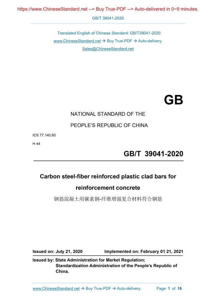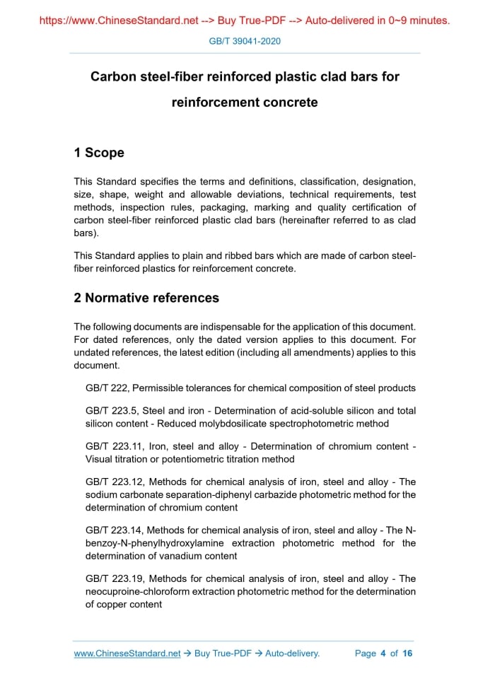 Similar standardsGB/T 39041-2020: Carbon steel-fiber reinforced plastic clad bars for reinforcement concrete---This is an excerpt. Full copy of true-PDF in English version (including equations, symbols, images, flow-chart, tables, and figures etc.), auto-downloaded/delivered in 9 seconds, can be purchased online: https://www.ChineseStandard.net/PDF.aspx/GBT39041-2020GB NATIONAL STANDARD OF THE PEOPLE’S REPUBLIC OF CHINA ICS 77.140.60 H 44 Carbon steel-fiber reinforced plastic clad bars for reinforcement concrete ISSUED ON: JULY 21, 2020 IMPLEMENTED ON: FEBRUARY 01 21, 2021 Issued by: State Administration for Market Regulation; Standardization Administration of the People’s Republic of China. Table of ContentsForeword ... 3 1 Scope ... 4 2 Normative references ... 4 3 Terms and definitions ... 6 4 Classification and designation... 7 5 Size, shape, weight and allowable deviation ... 9 6 Technical requirements ... 9 7 Test method ... 12 8 Inspection rules ... 14 9 Packaging, marking and quality certificate ... 15 Carbon steel-fiber reinforced plastic clad bars for reinforcement concrete1 ScopeThis Standard specifies the terms and definitions, classification, designation, size, shape, weight and allowable deviations, technical requirements, test methods, inspection rules, packaging, marking and quality certification of carbon steel-fiber reinforced plastic clad bars (hereinafter referred to as clad bars). This Standard applies to plain and ribbed bars which are made of carbon steel- fiber reinforced plastics for reinforcement concrete.2 Normative referencesThe following documents are indispensable for the application of this document. For dated references, only the dated version applies to this document. For undated references, the latest edition (including all amendments) applies to this document. GB/T 222, Permissible tolerances for chemical composition of steel products GB/T 223.5, Steel and iron - Determination of acid-soluble silicon and total silicon content - Reduced molybdosilicate spectrophotometric method GB/T 223.11, Iron, steel and alloy - Determination of chromium content - Visual titration or potentiometric titration method GB/T 223.12, Methods for chemical analysis of iron, steel and alloy - The sodium carbonate separation-diphenyl carbazide photometric method for the determination of chromium content GB/T 223.14, Methods for chemical analysis of iron, steel and alloy - The N- benzoy-N-phenylhydroxylamine extraction photometric method for the determination of vanadium content GB/T 223.19, Methods for chemical analysis of iron, steel and alloy - The neocuproine-chloroform extraction photometric method for the determination of copper content GB/T 17505, Steel and steel products - General technical delivery requirements GB/T 20018, Metallic and non-metallic coatings - Measurement of thickness - Beta backscatter methods GB/T 20123, Steel and iron - Determination of total carbon and sulfur content Infrared absorption method after combustion in an induction furnace (routine method) GB/T 20124, Steel and iron - Determination of nitrogen content - Thermal conductimetric method after fusion in a current of inert gas GB/T 20125, Low-alloy steel. Determination of multi-element contents. Inductively coupled plasma atomic emission spectrometric method GB/T 25826-2010, Epoxy-coated steel for the reinforcement of concrete GB/T 26743, Fiber reinforced composite bars for civil engineering GB/T 28900, Test methods of steel for reinforcement of concrete JGJ 18, Specification for welding and acceptance of reinforcing steel bars JGJ 107, Technical specification for mechanical splicing of steel reinforcing bars YB/T 081, Rule for rounding off of numerical values and judgment of testing values for technical standards of metallurgy3 Terms and definitionsTerms and definitions determined by GB/T 1499.1, GB/T 1499.2, GB/T 26743 and the following ones are applicable to this document. 3.1 Carbon steel-fiber reinforced plastic clad bars Clad bars, whose surface layer is fiber reinforced plastics and core is hot-rolled steel bars, which is compounded through processes such as compression molding, bonding, high-pressure injection, high-temperature treatment. 3.2 Base metal The base metal of clad bars is mainly the hot-rolled steel bar that is used to withstand the structural strength, which is divided into plain bars and ribbed bars. c) Clad bar designation (including the cladding designation); d) Clad bar nominal diameter, length (or disk diameter) and weight (or quantity, or disk weight); e) Special requirements.5 Size, shape, weight and allowable deviation5.1 Nominal diameter range and recommended diameter The nominal diameter of hot-rolled plain-fiber reinforced plastic clad bars is 6 mm ~ 22 mm; the nominal diameter of hot-rolled ribbed-fiber reinforced plastic clad bars is 6 mm ~ 50 mm; the recommended nominal diameters of clad bars are 6 mm, 8 mm, 10 mm, 12 mm, 14 mm, 16 mm, 18 mm, 20 mm, 22 mm, 25 mm, 28 mm, 32 mm, 36 mm, 40 mm and 50 mm. 5.2 Size, shape and allowable deviation The size, shape and allowable deviation of the base metal of hot-rolled plain- fiber reinforced plastic clad bars shall meet the requirements of GB/T 1499.1. The size, shape and allowable deviation of the base metal of hot-rolled ribbed- fiber reinforced plastic clad bars shall meet the requirements of GB/T 1499.2. Special requirements shall be negotiated by both parties. 5.3 Cladding thickness The cladding thickness size range is 0.07 mm ~ 1.0 mm. 5.4 Weight It is delivered at actual weight.6 Technical requirements6.1 Materials 6.1.1 The chemical composition and carbon equivalent of the base metal of clad bars shall comply with the relevant regulations of GB/T 1499.1 and GB/T 1499.2. 6.1.2 The chemical composition of the base metal of clad bars shall be indicated in the quality certificate. 6.1.3 The steel base metal which is used to make clad bars shall avoid oil, grease or paint pollution. Before compounding, it shall b