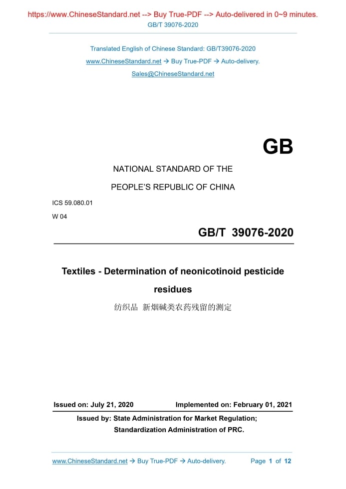 GB/T 39076-2020: Textiles - Determination of neonicotinoid pesticide residues Delivery: 9 seconds. True-PDF full-copy in English & invoice will be downloaded + auto-delivered via email. See step-by-step procedure Status: Valid