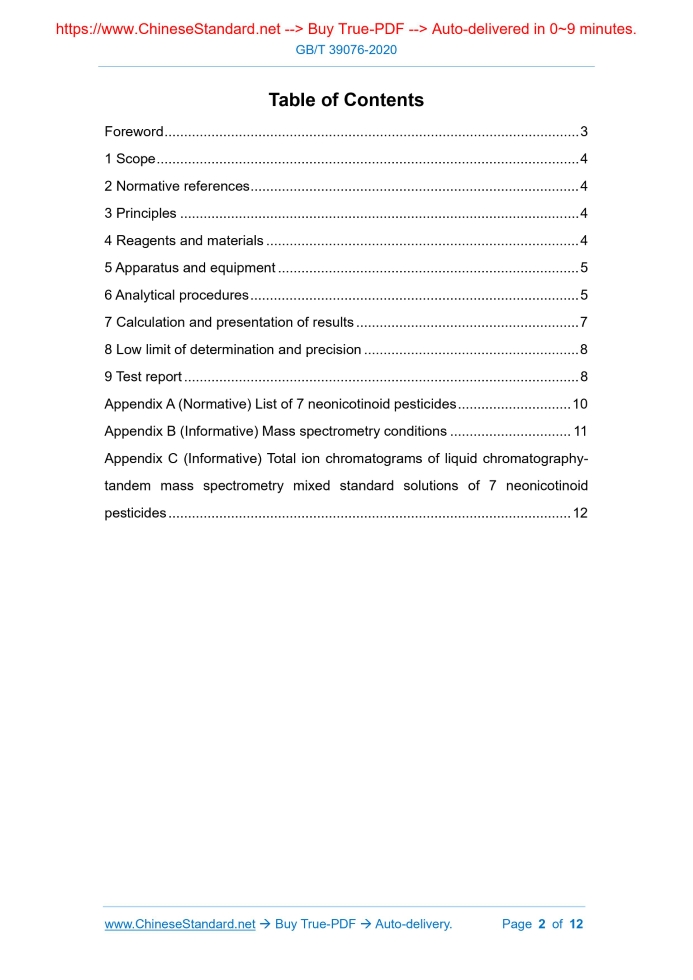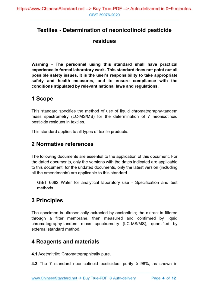 Similar standardsGB/T 39076-2020: Textiles - Determination of neonicotinoid pesticide residues---This is an excerpt. Full copy of true-PDF in English version (including equations, symbols, images, flow-chart, tables, and figures etc.), auto-downloaded/delivered in 9 seconds, can be purchased online: https://www.ChineseStandard.net/PDF.aspx/GBT39076-2020GB NATIONAL STANDARD OF THE PEOPLE’S REPUBLIC OF CHINA ICS 59.080.01 W 04 Textiles - Determination of neonicotinoid pesticide residues ISSUED ON: JULY 21, 2020 IMPLEMENTED ON: FEBRUARY 01, 2021 Issued by: State Administration for Market Regulation; Standardization Administration of PRC. Table of ContentsForeword ... 3 1 Scope ... 4 2 Normative references ... 4 3 Principles ... 4 4 Reagents and materials ... 4 5 Apparatus and equipment ... 5 6 Analytical procedures ... 5 7 Calculation and presentation of results ... 7 8 Low limit of determination and precision ... 8 9 Test report ... 8 Appendix A (Normative) List of 7 neonicotinoid pesticides ... 10 Appendix B (Informative) Mass spectrometry conditions ... 11 Appendix C (Informative) Total ion chromatograms of liquid chromatography- tandem mass spectrometry mixed standard solutions of 7 neonicotinoid pesticides ... 12 Textiles - Determination of neonicotinoid pesticide residues Warning - The personnel using this standard shall have practical experience in formal laboratory work. This standard does not point out all possible safety issues. It is the user's responsibility to take appropriate safety and health measures, and to ensure compliance with the conditions stipulated by relevant national laws and regulations.1 ScopeThis standard specifies the method of use of liquid chromatography-tandem mass spectrometry (LC-MS/MS) for the determination of 7 neonicotinoid pesticide residues in textiles. This standard applies to all types of textile products.2 Normative referencesThe following documents are essential to the application of this document. For the dated documents, only the versions with the dates indicated are applicable to this document; for the undated documents, only the latest version (including all the amendments) are applicable to this standard. GB/T 6682 Water for analytical laboratory use - Specification and test methods3 PrinciplesThe specimen is ultrasonically extracted by acetonitrile; the extract is filtered through a filter membrane, then measured and confirmed by liquid chromatography-tandem mass spectrometry (LC-MS/MS), quantified by external standard method.4 Reagents and materials4.1 Acetonitrile: Chromatographically pure. 4.2 The 7 standard neonicotinoid pesticides: purity ≥ 98%, as shown in Appendix A. 4.3 Standard stock solution (approximately 1000 mg/L): Respectively accurately weigh appropriate amounts of neonicotinoid pesticide standard products (accurate to 0.0001 g). Use acetonitrile (4.1) to prepare each substance to the standard stock solution which has a mass concentration of approximately 1000 mg/L. Note: When stored at 0 °C ~ 4 °C in the dark, the validity period of the standard stock solution is 12 months. 4.4 Mixed standard working solution (approximately 10 mg/L): Accurately pipette an appropriate amount of standard stock solution (4.3). Use acetonitrile (4.1) to prepare a mixed standard working solution which has a concentration of approximately 10 mg/L. Then, prepare the standard working solution of other concentrations as needed. Note: When stored at 0 °C ~ 4 °C in the dark, the validity period of the mixed standard working solution is 3 months. 4.5 Water: Class II water that meets the requirements of GB/T 6682.5 Apparatus and equipment5.1 Liquid chromatography-tandem mass spectrometer (LC-MS/MS): It is equipped with electrospray ionization source (ESI). 5.2 Ultrasonic generator: The working frequency is 40 kHz. 5.3 Balance: Sensitivity is 0.0001 g and 0.01 g, respectively. 5.4 Conical flask: It has a ground stopper; the capacity is 100 mL. 5.5 Polytetrafluoroethylene filter membrane: The pore size is 0.22 μm.6 Analytical procedures6.1 Extraction Take a representative sample. Cut it into small pieces below 5 mm × 5 mm. Mix well. Weigh 1.0 g (accurate to 0.01 g) and mix the specimen uniformly. Place it in a conical flask (5.4). Accurately add 20 mL of acetonitrile (4.1). Close the stopper. Place the conical flask in the ultrasonic generator (5.2). Extract it at room temperature for 60 minutes. Use polytetrafluoroethylene filter membrane (5.5) to filter the sample solution into a sample bottle, which is used for LC- MS/MS analysis. Where: Xi - The content of neonicotinoid pesticide i in the specimen, in milligrams per kilogram (mg/kg); ci - The concentration of neonicotinoid pesticide i in the sample as calculated from the standard curve, the unit is milligrams per liter (mg/L); V - Volume of sample liquid, the unit is milliliters (mL); F - Dilution factor; m - The mass of the specimen, in grams (g). 7.2 Results presentation The test results are represented by the test results of various neonicotinoid pesticides. The calculation results are kept to one decimal place. When it is below the lower limit of determination, the test result is "not detected".8 Low limit of determination and precision8.1 Lower limit of determination The lower limit of determination is 0.2 mg/kg. 8.2 Precision In the same laboratory, when the same operator uses the same equipment, according to the same test method, to carry out tests of same tested object independently in a short time, at the 95% confidence level, the absolute difference of the two independent test results obtained is not more than 20% of the arithmetic mean of the two measured values.9 Test reportThe test report shall give at least the following contents: a) Sample description; b) Number of this standard; c) Test results; ......Source: Above contents are excerpted from the full-copy PDF -- translated/reviewed by: www.ChineseStandard.net / Wayne Zheng et al. Tips & Frequently Asked Questions:Question 1: H
