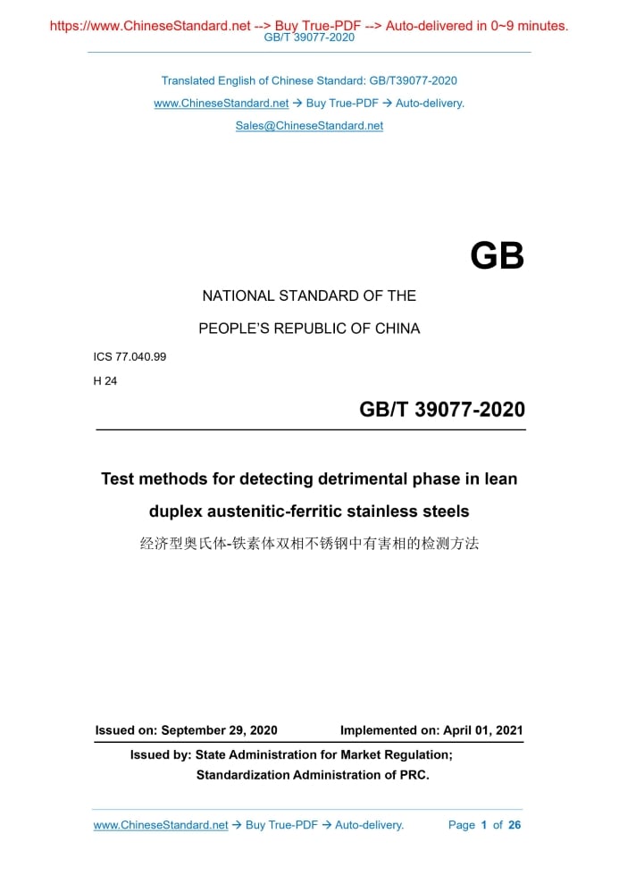 GB/T 39077-2020: Test methods for detecting detrimental phase in lean duplex austenitic-ferritic stainless steels Delivery: 9 seconds. True-PDF full-copy in English & invoice will be downloaded + auto-delivered via email. See step-by-step procedure Status: Valid GB/T 39077: Historical versions
