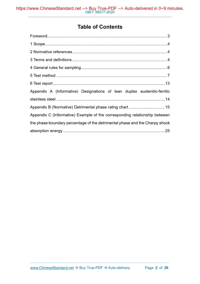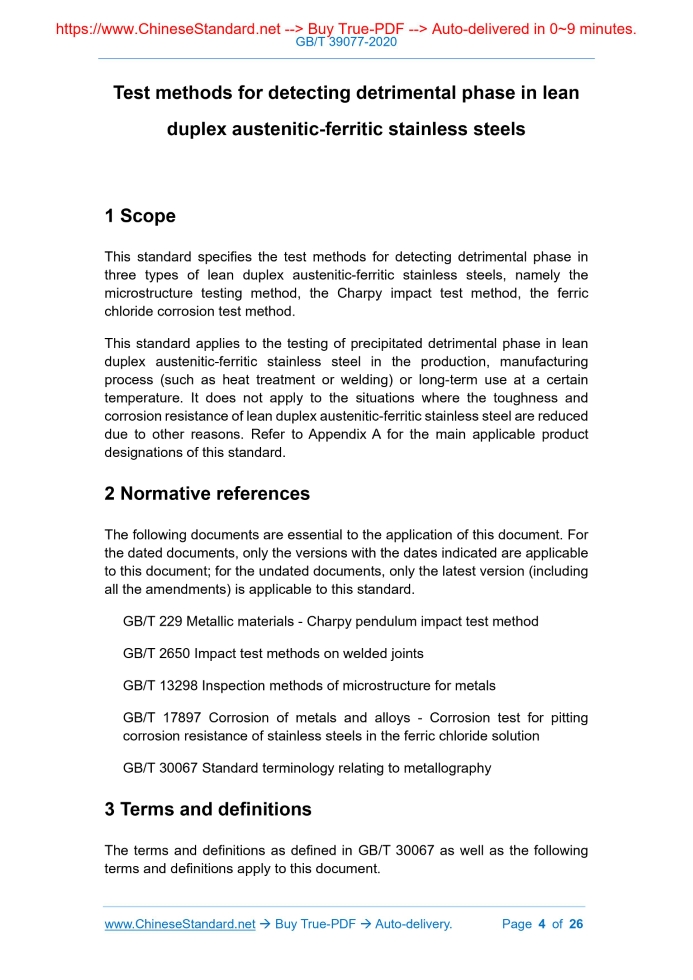 Similar standardsGB/T 39077-2020: Test methods for detecting detrimental phase in lean duplex austenitic-ferritic stainless steels---This is an excerpt. Full copy of true-PDF in English version (including equations, symbols, images, flow-chart, tables, and figures etc.), auto-downloaded/delivered in 9 seconds, can be purchased online: https://www.ChineseStandard.net/PDF.aspx/GBT39077-2020 GB NATIONAL STANDARD OF THE PEOPLE’S REPUBLIC OF CHINA ICS 77.040.99 H 24 Test methods for detecting detrimental phase in lean duplex austenitic-ferritic stainless steels Issued on: SEPTEMBER 29, 2020 Implemented on: APRIL 01, 2021 Issued by. State Administration for Market Regulation; Standardization Administration of PRC. Table of ContentsForeword... 3 1 Scope... 4 2 Normative references... 4 3 Terms and definitions... 4 4 General rules for sampling... 6 5 Test method... 7 6 Test report... 13 Appendix A (Informative) Designations of lean duplex austenitic-ferritic stainless steel... 14 Appendix B (Normative) Detrimental phase rating chart... 15 Appendix C (Informative) Example of the corresponding relationship between the phase boundary percentage of the detrimental phase and the Charpy shock absorption energy... 25 Test methods for detecting detrimental phase in lean duplex austenitic-ferritic stainless steels1 ScopeThis standard specifies the test methods for detecting detrimental phase in three types of lean duplex austenitic-ferritic stainless steels, namely the microstructure testing method, the Charpy impact test method, the ferric chloride corrosion test method. This standard applies to the testing of precipitated detrimental phase in lean duplex austenitic-ferritic stainless steel in the production, manufacturing process (such as heat treatment or welding) or long-term use at a certain temperature. It does not apply to the situations where the toughness and corrosion resistance of lean duplex austenitic-ferritic stainless steel are reduced due to other reasons. Refer to Appendix A for the main applicable product designations of this standard.2 Normative referencesThe following documents are essential to the application of this document. For the dated documents, only the versions with the dates indicated are applicable to this document; for the undated documents, only the latest version (including all the amendments) is applicable to this standard. GB/T 229 Metallic materials - Charpy pendulum impact test method GB/T 2650 Impact test methods on welded joints GB/T 13298 Inspection methods of microstructure for metals GB/T 17897 Corrosion of metals and alloys - Corrosion test for pitting corrosion resistance of stainless steels in the ferric chloride solution GB/T 30067 Standard terminology relating to metallography3 Terms and definitionsThe terms and definitions as defined in GB/T 30067 as well as the following terms and definitions apply to this document. 3.1 Lean duplex austenitic-ferritic stainless steel A low-cost duplex austenitic-ferritic stainless steel which has a ferrite content of 35% ~ 65%, a typical composition of low carbon, low molybdenum (Mo < 2%), high chromium (Cr > 17%), is added with nickel, manganese, nitrogen alloy elements. Note. Lean duplex stainless steel has excellent toughness, weldability, high strength and resistance to chloride stress corrosion. 3.2 Detrimental phase The nitride (Cr2N), carbide (Cr23C6), χ phase and a small amount of σ phase as formed in lean duplex austenitic-ferritic stainless steel at a certain temperature. 3.3 Boundary percentage content of the detrimental phases The percentage content of phase boundary area of the detrimental phase accounting for the total phase boundary area. Note. The P value reflects the degree of precipitation of detrimental phases on the phase boundary; it directly affects the toughness and corrosion resistance of duplex stainless steel. 3.4 Pitting resistance equivalent number PREN The parameters that comprehensively characterize the corrosion resistance of stainless steel, which are related to the chemical composition and expressed in% (mass fraction). Note. PREN = %Cr + 3.3%Mo + 16%N. 3.5 20Cr type group A b) Charpy impact test method. Used to detect the presence of detrimental phases in duplex stainless steel and their influence on impact performance; c) Ferric chloride corrosion test method. Used to detect the presence of detrimental phases in duplex stainless steel and its influence on corrosion resistance. 5.1.2 The three test methods are only used to detect the presence of detrimental phases and their influence on the impact performance and corrosion resistance of duplex stainless steel; they cannot specifically determine the specific structure of the detrimental phase. The microstructure testing method is suitable for various occasions and samples of various shapes, especially for the evaluation of the performance of special profiles and in- service components. 5.2 Microstructure testing method 5.2.1 Specimen preparation The test surface of the specimen shall not be less than 400 mm2.The preparation and etching of the specimen shall be carried out in accordance with the provisions of GB/T 13298.The specimens should be electrolytically etched; the recommended etchant and electrolytic parameters are as shown in Table 2. 5.2.2 Magnification The magnification is 500 x; if necessary, it can be combined with 1000 x for evaluation. Table 2 -- Electrolytic etching reagents and electrolytic parameters 5.2.3 Testing method 5.2.3.1 Comparison method 5.2.3.1.1 Select the most serious field of view on the testing surface and compare it with the rating chart in Appendix B, to evaluate the amount of detrimental phase precipitation. The detrimental phase's rating chart is divided into two series, I and II. The 20Cr type Group A uses the I series chart and the 20Cr type Group B uses the II series chart. When the amount of detrimental phase precipitation is between the two evaluation charts, choose the closest temperature shall 