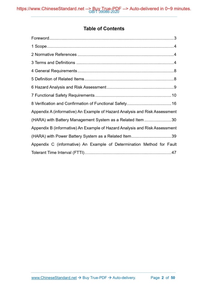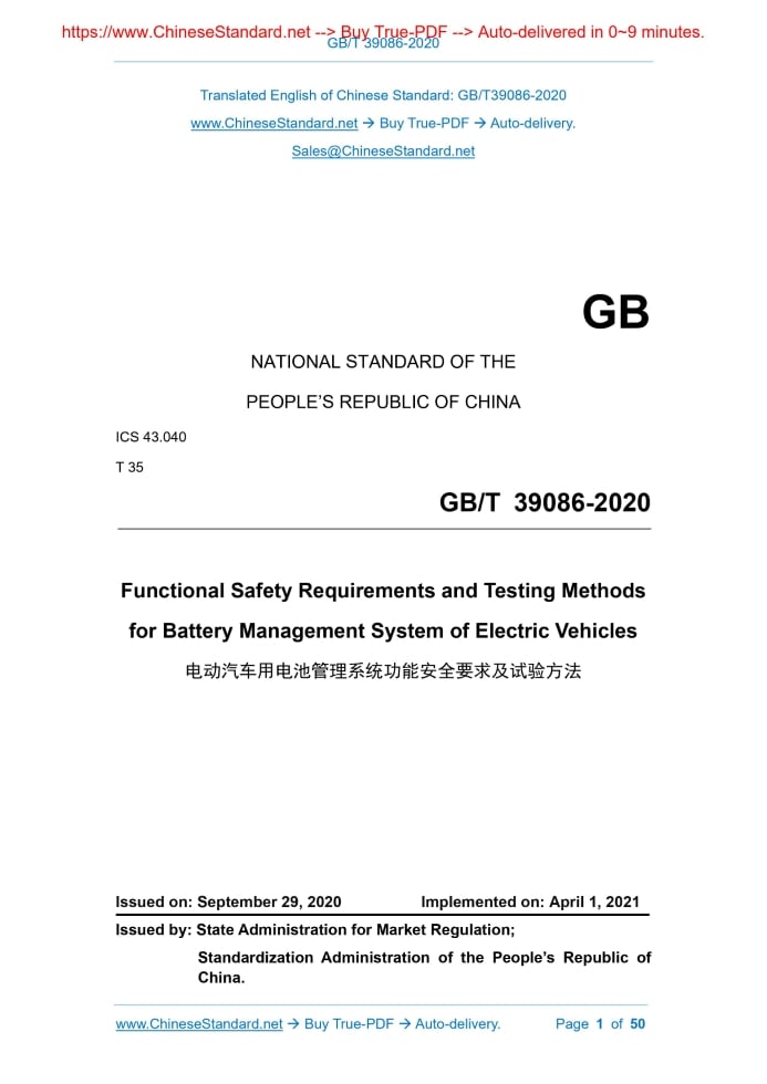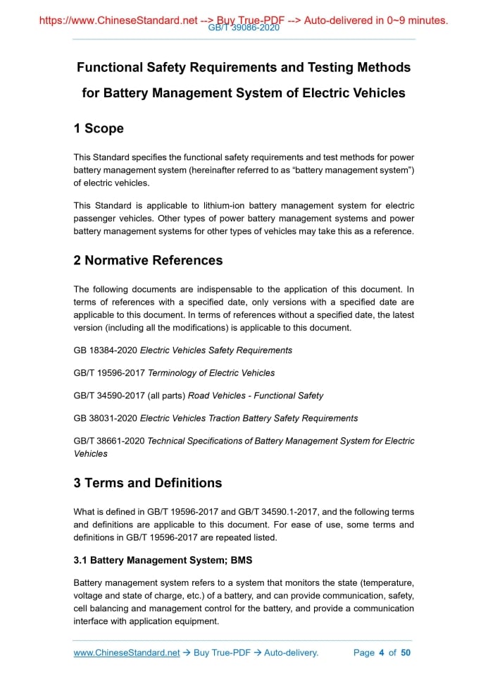 Similar standardsGB/T 39086-2020: Functional Safety Requirements and Testing Methods for Battery Management System of Electric Vehicles---This is an excerpt. Full copy of true-PDF in English version (including equations, symbols, images, flow-chart, tables, and figures etc.), auto-downloaded/delivered in 9 seconds, can be purchased online: https://www.ChineseStandard.net/PDF.aspx/GBT39086-2020 GB NATIONAL STANDARD OF THE PEOPLE’S REPUBLIC OF CHINA ICS 43.040 T 35 Functional Safety Requirements and Testing Methods for Battery Management System of Electric Vehicles Issued on. SEPTEMBER 29, 2020 Implemented on. APRIL 1, 2021 Issued by. State Administration for Market Regulation; Standardization Administration of the People’s Republic of China. Table of ContentsForeword... 3 1 Scope... 4 2 Normative References... 4 3 Terms and Definitions... 4 4 General Requirements... 8 5 Definition of Related Items... 8 6 Hazard Analysis and Risk Assessment... 9 7 Functional Safety Requirements... 10 8 Verification and Confirmation of Functional Safety... 16 Appendix A (informative) An Example of Hazard Analysis and Risk Assessment (HARA) with Battery Management System as a Related Item... 30 Appendix B (informative) An Example of Hazard Analysis and Risk Assessment (HARA) with Power Battery System as a Related Item... 39 Appendix C (informative) An Example of Determination Method for Fault Tolerant Time Interval (FTTI)... 471 ScopeThis Standard specifies the functional safety requirements and test methods for power battery management system (hereinafter referred to as “battery management system”) of electric vehicles. This Standard is applicable to lithium-ion battery management system for electric passenger vehicles. Other types of power battery management systems and power battery management systems for other types of vehicles may take this as a reference.2 Normative ReferencesThe following documents are indispensable to the application of this document. In terms of references with a specified date, only versions with a specified date are applicable to this document. In terms of references without a specified date, the latest version (including all the modifications) is applicable to this document. GB 18384-2020 Electric Vehicles Safety Requirements GB/T 19596-2017 Terminology of Electric Vehicles GB/T 34590-2017 (all parts) Road Vehicles - Functional Safety GB 38031-2020 Electric Vehicles Traction Battery Safety Requirements GB/T 38661-2020 Technical Specifications of Battery Management System for Electric Vehicles3 Terms and DefinitionsWhat is defined in GB/T 19596-2017 and GB/T 34590.1-2017, and the following terms and definitions are applicable to this document. For ease of use, some terms and definitions in GB/T 19596-2017 are repeated listed. 3.1 Battery Management System; BMS Battery management system refers to a system that monitors the state (temperature, voltage and state of charge, etc.) of a battery, and can provide communication, safety, cell balancing and management control for the battery, and provide a communication interface with application equipment. 3.2 Secondary Cell Secondary cell refers to a basic unit device that mutually converts chemical energy and electrical energy. Secondary cell usually includes electrodes, diaphragms, electrolytes, shells and terminals, and is designed to be rechargeable. 3.4 Power Battery System Power battery system refers to an energy storage device consisted of one or more battery packs and corresponding accessories (battery management systems, high- voltage circuits, low-voltage circuits, thermal management equipment and mechanical assembly) to provide electrical energy for the driving of electric vehicles. 3.5 Fault Tolerant Time Interval; FTTI Fault tolerant time interval refers to the shortest time interval from the occurrence of an internal failure of a related item to the occurrence of a hazardous event under the circumstance where the safety mechanism is not activated.4 General RequirementsUnless it is otherwise specified, the requirements for the functional safety technology development and process development of battery management system shall be implemented in accordance with GB/T 34590-2017 (all parts).5 Definition of Related Items5.1 General Rules In accordance with the requirements of GB/T 34590.3-2017, related items shall be defined. Related items refer to systems or system groups that implement vehicle-level functions or partial functions. 5.2 Functional Concept In order to satisfy the safe operation of a vehicle and ensure the safety of the internal and external personnel of the vehicle, and the vehicle environment, the battery management system shall monitor and protect the safe operation of the power battery. 5.3 Operating Conditions and Environmental Constraints In order to satisfy the safe operation of a vehicle, the operating conditions and environmental constraints of related items need to be clarified, which may include (if applicable).6 Hazard Analysis and Risk Assessment6.1 General Rules In accordance with the definition of related items in Chapter 5, and GB/T 34590.3-2017, based on the scenario of vehicle usage, analyze and identify hazards caused by faults of the related items; classify the hazards; define the corresponding automatic safety integrity level (ASIL); formulate safety goals to prevent the occurrence of hazardous events or relieve the degree of hazards, so as to avoid unreasonable risks. 6.2 Safety Goals The safety goals and their attributes of the battery management system determined through hazard analysis and risk assessment shall at least include the content listed in Table 1.7 Functional Safety Requirements7.1 Prevent Thermal Runaway Caused by Overcharging of Secondary Cell 7.1.1 General requirements The battery management system shall monitor the voltage of secondary cell. When the voltage of secondary cell exceeds the safety threshold, the power battery system shall be put into a safe state within FTT