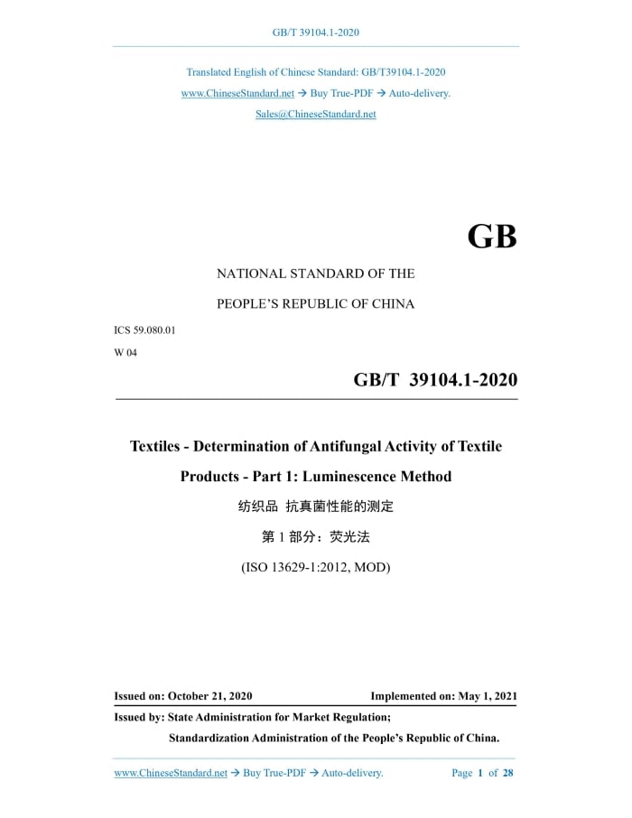 GB/T 39104.1-2020: Textiles - Determination of antifungal activity of textile products - Part 1: Luminescence method Delivery: 9 seconds. True-PDF full-copy in English & invoice will be downloaded + auto-delivered via email. See step-by-step procedure Status: Valid