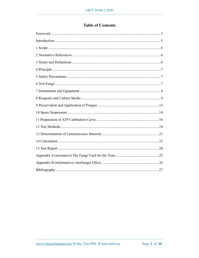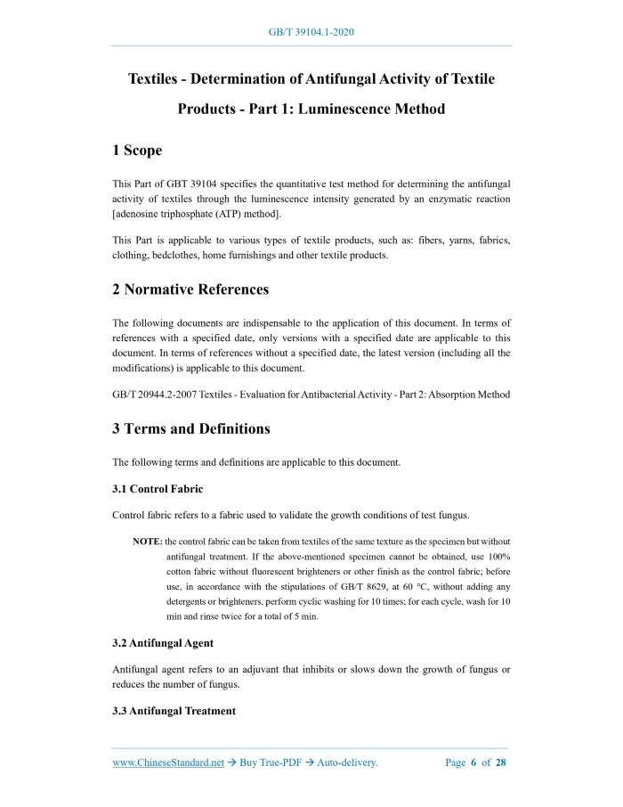 Similar standardsGB/T 39104.1-2020: Textiles - Determination of antifungal activity of textile products - Part 1: Luminescence method---This is an excerpt. Full copy of true-PDF in English version (including equations, symbols, images, flow-chart, tables, and figures etc.), auto-downloaded/delivered in 9 seconds, can be purchased online: https://www.ChineseStandard.net/PDF.aspx/GBT39104.1-2020 GB NATIONAL STANDARD OF THE PEOPLE’S REPUBLIC OF CHINA ICS 59.080.01 W 04 Textiles - Determination of Antifungal Activity of Textile Products - Part 1: Luminescence Method (ISO 13629-1:2012, MOD) ISSUED ON: OCTOBER 21, 2020 IMPLEMENTED ON: MAY 1, 2021 Issued by: State Administration for Market Regulation; Standardization Administration of the People’s Republic of China. Table of ContentsForeword ... 3 Introduction ... 5 1 Scope ... 6 2 Normative References ... 6 3 Terms and Definitions ... 6 4 Principle ... 7 5 Safety Precautions ... 7 6 Test Fungi ... 7 7 Instruments and Equipment ... 8 8 Reagents and Culture Media ... 9 9 Preservation and Application of Fungus ... 13 10 Spore Suspension ... 14 11 Preparation of ATP Calibration Curve ... 16 12 Test Methods ... 18 13 Determination of Luminescence Intensity ... 21 14 Calculation ... 23 15 Test Report ... 24 Appendix A (normative) The Fungi Used for the Tests ... 25 Appendix B (informative) Antifungal Effect ... 26 Bibliography ... 27 Textiles - Determination of Antifungal Activity of Textile Products - Part 1: Luminescence Method1 ScopeThis Part of GBT 39104 specifies the quantitative test method for determining the antifungal activity of textiles through the luminescence intensity generated by an enzymatic reaction [adenosine triphosphate (ATP) method]. This Part is applicable to various types of textile products, such as: fibers, yarns, fabrics, clothing, bedclothes, home furnishings and other textile products.2 Normative ReferencesThe following documents are indispensable to the application of this document. In terms of references with a specified date, only versions with a specified date are applicable to this document. In terms of references without a specified date, the latest version (including all the modifications) is applicable to this document. GB/T 20944.2-2007 Textiles - Evaluation for Antibacterial Activity - Part 2: Absorption Method3 Terms and DefinitionsThe following terms and definitions are applicable to this document. 3.1 Control Fabric Control fabric refers to a fabric used to validate the growth conditions of test fungus. NOTE: the control fabric can be taken from textiles of the same texture as the specimen but without antifungal treatment. If the above-mentioned specimen cannot be obtained, use 100% cotton fabric without fluorescent brighteners or other finish as the control fabric; before use, in accordance with the stipulations of GB/T 8629, at 60 C, without adding any detergents or brighteners, perform cyclic washing for 10 times; for each cycle, wash for 10 min and rinse twice for a total of 5 min. 3.2 Antifungal Agent Antifungal agent refers to an adjuvant that inhibits or slows down the growth of fungus or reduces the number of fungus. 3.3 Antifungal Treatment Antifungal treatment refers to a treatment that inhibits or mitigates the growth of fungus or reduces the number of fungus. 3.4 Spore Suspension Spore suspension refers to a liquid, in which fungal spores are uniformly dispersed in sterilized water containing an anionic surfactant. 3.5 Adenosine Triphosphate; ATP Adenosine triphosphate refers to a multi-functional nucleotide present in living fungi. 3.6 Antifungal Activity Antifungal activity refers to an activity of inhibiting or slowing down the growth of fungus, which is characterized by the difference between the growth values expressed by the logarithm of ATP in the control fabric and the test specimen. 3.7 Luminescence Method Luminescence method refers to a method of determining the amount of ATP in fungal cells. NOTE: the result is expressed in moles of ATP.4 PrincipleRespectively use the spore suspension of the test fungus to inoculate the test specimen and the control fabric. In addition, under the condition of 25 C, incubate it for 42 h. By comparing the determination results of the luminescence intensity of intracellular ATP of the fungus on the test specimen and the control fabric, quantitatively determine the fungal growth value or antifungal activity.5 Safety PrecautionsThis Method requires the use of fungi. The test shall be performed by personnel trained and experienced in microbiological techniques. National laws, regulations and recommended norms related to appropriate safety precautions shall be followed.6 Test FungiThe test fungal strains shall be selected from Table A.1 of Appendix A. With the consent of the related sides, equivalent fungal strains provided by other culture collection institutions affiliated to the World Federation for Culture Collection (WFCC) may be taken as a replacement. 7.21 Microscope: with a magnification of 200. 7.22 Ultrasonic cleaner: the compact type for experiments, with a frequency of approximately 30 kHz ~ 50 kHz. 7.23 Luminometer: the test wavelength is 300 nm ~ 650 nm. Under the analytical conditions specified in 8.4 and Chapter 11, it is capable of ATP measurement at the concentration of 1 10-8 mol/L ~ 1 10-5 mol/L. 7.24 pH meter: at 25 C, the accuracy is 0.1. 7.25 Refrigerator: capable of maintaining the temperature at 2 C ~ 10 C. 7.26 Freezers: one capable of adjusting the temperature to below 80 C, and the other capable of adjusting the temperature to below 20 C. Test tubes, glass vials, flasks, pipettes and tweezers shall be carefully washed with an alkaline or neutral detergent, rinsed and dried; before use, they shall be processed through dry sterilization or high-pressure steam sterilization.8 Reagents and Culture Media8.1 General The reagents used for the test shall be analytically pure and / or suitable for microbiological testing. The existing co