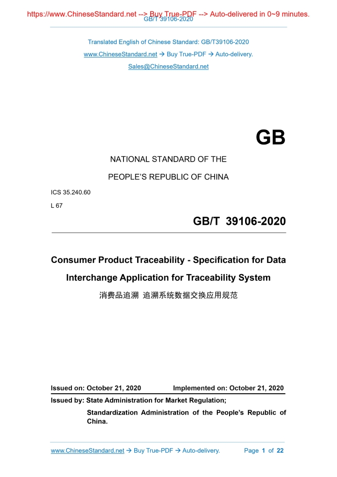 GB/T 39106-2020: Consumer Product Traceability - Specification for Data Interchange Application for Traceability System Delivery: 9 seconds. True-PDF full-copy in English & invoice will be downloaded + auto-delivered via email. See step-by-step procedure Status: Valid