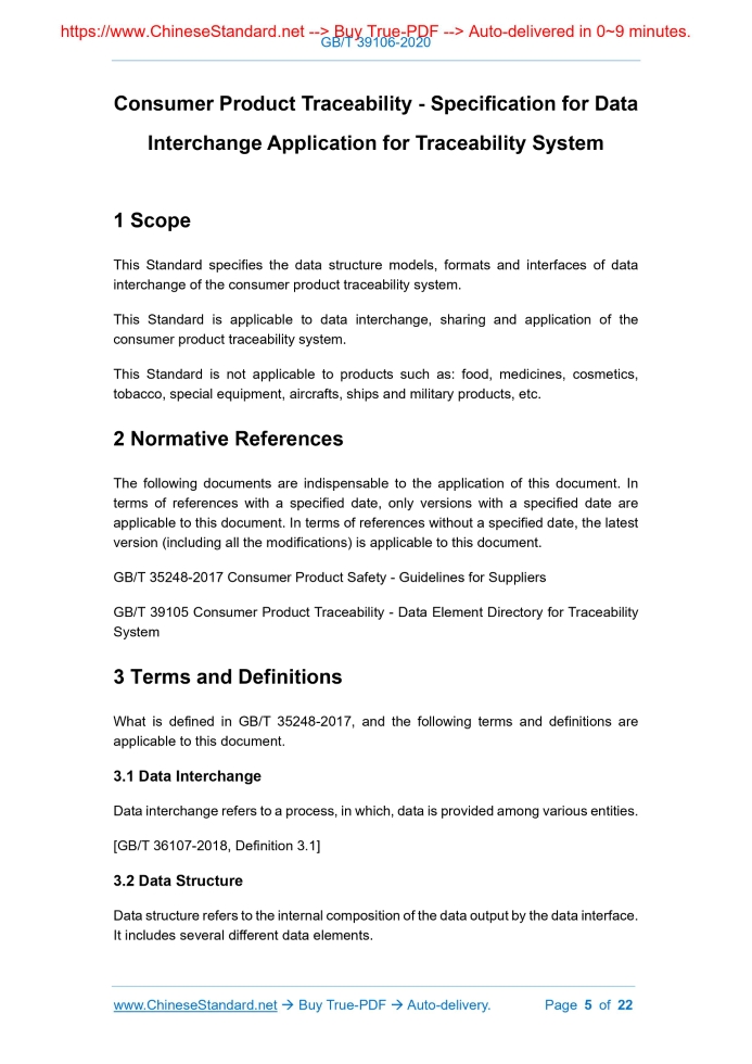 Similar standardsGB/T 39106-2020: Consumer Product Traceability - Specification for Data Interchange Application for Traceability System---This is an excerpt. Full copy of true-PDF in English version (including equations, symbols, images, flow-chart, tables, and figures etc.), auto-downloaded/delivered in 9 seconds, can be purchased online: https://www.ChineseStandard.net/PDF.aspx/GBT39106-2020 GB NATIONAL STANDARD OF THE PEOPLE’S REPUBLIC OF CHINA ICS 35.240.60 L 67 Consumer Product Traceability - Specification for Data Interchange Application for Traceability System ISSUED ON: OCTOBER 21, 2020 IMPLEMENTED ON: OCTOBER 21, 2020 Issued by: State Administration for Market Regulation; Standardization Administration of the People’s Republic of China. Table of ContentsForeword ... 3 Introduction ... 4 1 Scope ... 5 2 Normative References ... 5 3 Terms and Definitions ... 5 4 Overview ... 6 5 Data Structure Models ... 7 6 Data Interchange Formats ... 15 7 Data Interchange Interfaces ... 15 Appendix A (informative) Examples of Data Interchange Interface Modes ... 16 Bibliography ... 21 Consumer Product Traceability - Specification for Data Interchange Application for Traceability System1 ScopeThis Standard specifies the data structure models, formats and interfaces of data interchange of the consumer product traceability system. This Standard is applicable to data interchange, sharing and application of the consumer product traceability system. This Standard is not applicable to products such as: food, medicines, cosmetics, tobacco, special equipment, aircrafts, ships and military products, etc.2 Normative ReferencesThe following documents are indispensable to the application of this document. In terms of references with a specified date, only versions with a specified date are applicable to this document. In terms of references without a specified date, the latest version (including all the modifications) is applicable to this document. GB/T 35248-2017 Consumer Product Safety - Guidelines for Suppliers GB/T 39105 Consumer Product Traceability - Data Element Directory for Traceability System3 Terms and DefinitionsWhat is defined in GB/T 35248-2017, and the following terms and definitions are applicable to this document. 3.1 Data Interchange Data interchange refers to a process, in which, data is provided among various entities. [GB/T 36107-2018, Definition 3.1] 3.2 Data Structure Data structure refers to the internal composition of the data output by the data interface. It includes several different data elements. NOTE: GB/T 19581-2004, Definition 3.8 is modified.4 Overview4.1 The consumer product traceability data interchange mainly includes data interchange among the consumer product design link traceability system, the consumer product manufacturing link traceability system, the consumer product market link traceability system and the supervision platform, etc. 4.2 The logical relationship of consumer product traceability data interchange: a) The consumer product design link traceability system provides design link traceability information to the consumer product manufacturing link traceability system and the supervision platform. An example of the interchange data structure model is shown in 5.1; b) The consumer product manufacturing link traceability system provides manufacturing link traceability information to the consumer product market link traceability system and the supervision platform. An example of the interchange data structure model is shown in 5.2; c) The consumer product market link traceability system provides market link traceability information to the supervision platform. An example of the interchange data structure model is shown in 5.3; d) The consumer product manufacturing link traceability system provides feedback information to the consumer product design link traceability system; the consumer product market link traceability system provides feedback information to the consumer product manufacturing link traceability system; the supervision platform provides feedback information to the consumer product design, manufacturing and market link traceability systems. The feedback information includes feedback business information and feedback prompt information. An example of the interchange data structure model is shown in 5.4. The logical relationship of the consumer product traceability data interchange is shown in Figure 1.Appendix A(informative) Examples of Data Interchange Interface Modes A.1 Service Interface Mode A.1.1 Overview The service interface mode is often used in real-time data transmission. A.1.2 Technical agreement Before the interchange, both parties of the data interchange make an agreement on the technical details, such as: ---Character encoding set: UTF-8; ---Digest algorithm: SHA-256; ---Picture encoding format: BASE64 encoding. A.1.3 Example of interface An example of interface is as follows: a) Interface address: http://serverurl/design/search. b) Name of interface: design traceability information query interface. c) Interface description: in accordance with the request, call and return the relevant traceability information of the product design link. d) Interface mode: webservice. e) Request format: 1) method: post. 2) Content-Type: application/json. 3) Request parameters are shown in Table A.1. ......Source: Above contents are excerpted from the full-copy PDF -- translated/reviewed by: www.ChineseStandard.net / Wayne Zheng et al. Tips & Frequently Asked Questions:Question 1: How long will the true-PDF of English version of GB/T 39106-2020 be delivered?Answer: The full copy PDF of English version of GB/T 39106-2020 can be downloaded in 9 seconds, and it will also be emailed to you in 9 seconds (double mechanisms to ensure the delivery reliably), with PDF-invoice.Question 2: Can I share the purchased PDF of GB/T 39106-2020_English with my colleagues?Answer: Yes. The purchased PDF of GB/T 39106-2020_English will be deemed to be sold to your emplo