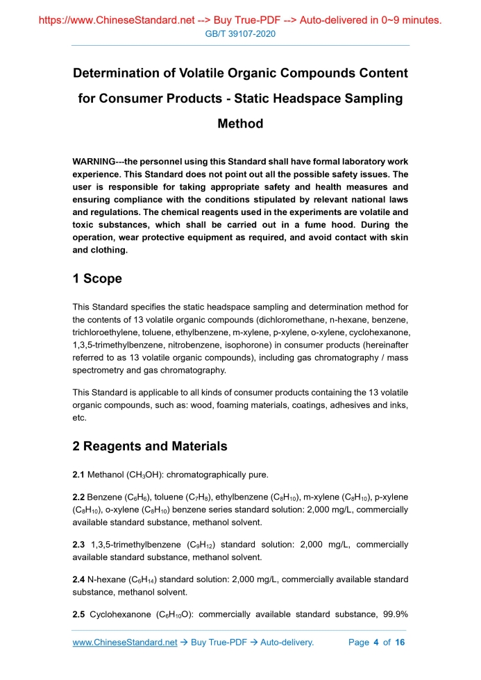 Similar standardsGB/T 39107-2020: Determination of Volatile Organic Compounds Content for Consumer Products - Static Headspace Sampling Method---This is an excerpt. Full copy of true-PDF in English version (including equations, symbols, images, flow-chart, tables, and figures etc.), auto-downloaded/delivered in 9 seconds, can be purchased online: https://www.ChineseStandard.net/PDF.aspx/GBT39107-2020 GB NATIONAL STANDARD OF THE PEOPLE’S REPUBLIC OF CHINA ICS 97.200 Y 57 Determination of Volatile Organic Compounds Content for Consumer Products - Static Headspace Sampling Method ISSUED ON: OCTOBER 21, 2020 IMPLEMENTED ON: OCTOBER 21, 2020 Issued by: State Administration for Market Regulation; Standardization Administration of the People’s Republic of China. Table of ContentsForeword ... 3 1 Scope ... 4 2 Reagents and Materials ... 4 3 Instruments and Equipment ... 5 4 Gas Chromatography / Mass Spectrometry ... 6 5 Gas Chromatography ... 10 Appendix A (informative) Information of 13 Volatile Organic Compounds ... 13 Appendix B (informative) Selected Ion Monitoring Chromatogram of Standard Substances ... 14 Appendix C (informative) Gas Chromatogram of Standard Substances ... 16 Determination of Volatile Organic Compounds Content for Consumer Products - Static Headspace Sampling Method WARNING---the personnel using this Standard shall have formal laboratory work experience. This Standard does not point out all the possible safety issues. The user is responsible for taking appropriate safety and health measures and ensuring compliance with the conditions stipulated by relevant national laws and regulations. The chemical reagents used in the experiments are volatile and toxic substances, which shall be carried out in a fume hood. During the operation, wear protective equipment as required, and avoid contact with skin and clothing.1 ScopeThis Standard specifies the static headspace sampling and determination method for the contents of 13 volatile organic compounds (dichloromethane, n-hexane, benzene, trichloroethylene, toluene, ethylbenzene, m-xylene, p-xylene, o-xylene, cyclohexanone, 1,3,5-trimethylbenzene, nitrobenzene, isophorone) in consumer products (hereinafter referred to as 13 volatile organic compounds), including gas chromatography / mass spectrometry and gas chromatography. This Standard is applicable to all kinds of consumer products containing the 13 volatile organic compounds, such as: wood, foaming materials, coatings, adhesives and inks, etc.2 Reagents and Materials2.1 Methanol (CH3OH): chromatographically pure. 2.2 Benzene (C6H6), toluene (C7H8), ethylbenzene (C8H10), m-xylene (C8H10), p-xylene (C8H10), o-xylene (C8H10) benzene series standard solution: 2,000 mg/L, commercially available standard substance, methanol solvent. 2.3 1,3,5-trimethylbenzene (C9H12) standard solution: 2,000 mg/L, commercially available standard substance, methanol solvent. 2.4 N-hexane (C6H14) standard solution: 2,000 mg/L, commercially available standard substance, methanol solvent. 2.5 Cyclohexanone (C6H10O): commercially available standard substance, 99.9% 3.4 Electronic balance: with a division value of 0.1 mg. 3.5 Micro syringe: 10 μL, 50 μL. 3.6 Headspace sampling bottle capper. 3.7 Headspace bottle: with a volume of 20 mL. 3.8 Brown glass volumetric flask: 5 mL, 10 mL.4 Gas Chromatography / Mass Spectrometry4.1 Principle The sample is placed in a closed headspace bottle and equilibrated at a specific temperature for a certain period of time, so that the target compound in the sample volatilizes and reaches dynamic equilibrium in the headspace bottle. Through the gas chromatograph - mass spectrometer, conduct separation and detection. Adopt the internal standard method for quantification. 4.2 Analytical Procedures 4.2.1 Sample processing In terms of solid samples like wood and foaming materials: freeze and crush the sample, or cut it to a particle size of less than 2 mm; accurately weigh-take 0.02 g of the sample, place it in a headspace bottle; add 10 μL of the internal standard working solution (2.14), then, quickly seal the headspace bottle; reserve it for later testing. In terms of samples like coatings, adhesives and inks: accurately weigh-take 0.02 g of the sample, place it in a headspace bottle; add 10 μL of the internal standard working solution (2.14), then, quickly seal the headspace bottle; reserve it for later testing. If the content of the compound under test is excessively high in the sample, the sampling size should be adjusted as appropriate. 4.2.2 Determination conditions 4.2.2.1 Conditions of headspace sampler The conditions of the headspace sampler include: a) Equilibrium temperature: 150 °C; b) Equilibrium time: 45 min; c) Transmission line temperature: 170 °C; d) Pressurization time: 1.0 min; e) Needle withdrawal time: 0.2 min; f) Injection volume: 1 mL; g) Temperature of sample injection needle: 160 °C. 4.2.2.2 Conditions of gas chromatograph and mass spectrometer Due to different instruments being used, the optimal analysis conditions might also be different. Hence, it is impossible to provide general parameters for instrument analysis. The set parameters should ensure effective separation and determination of the tested components. The following parameters have been proven to be feasible: a) Chromatographic column: DB-624 UI chromatographic column (60 m 0.25 mm 1.4 μm), or equivalent; b) Program temperature: 40 °C, maintain for 2 min, then, at the rate of 5 °C/min, raise the temperature to 120 °C, maintain for 3 min; at the rate of 10 °C/min, raise the temperature to 160 °C, maintain for 1 min; at the rate of 5 °C/min, raise the temperature to 210 °C, maintain for 0 min; in the end, at the rate of 15 °C/min, raise the temperature to 230 °C, maintain for 1 min; c) Carrier gas: high-purity helium, with a flow rate of 1 mL/min; d) Sample inlet temperature: 250 °C; e) Sample injection mode: split injection, with a split ratio of 1:1; f) Interface tempera
