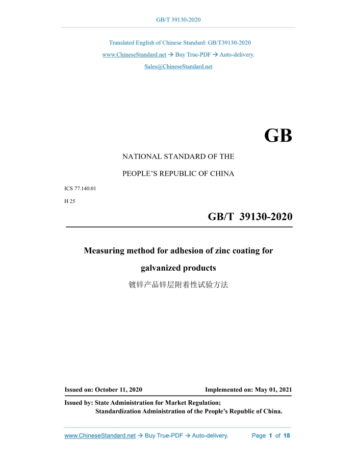 GB/T 39130-2020: Measuring method for adhesion of zinc coating for galvanized products Delivery: 9 seconds. True-PDF full-copy in English & invoice will be downloaded + auto-delivered via email. See step-by-step procedure Status: Valid
