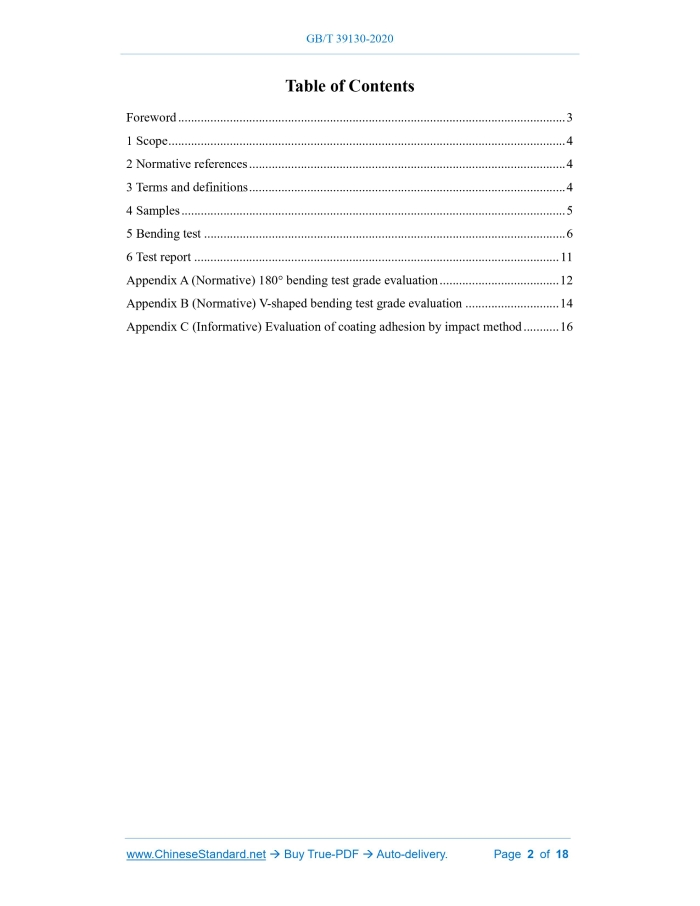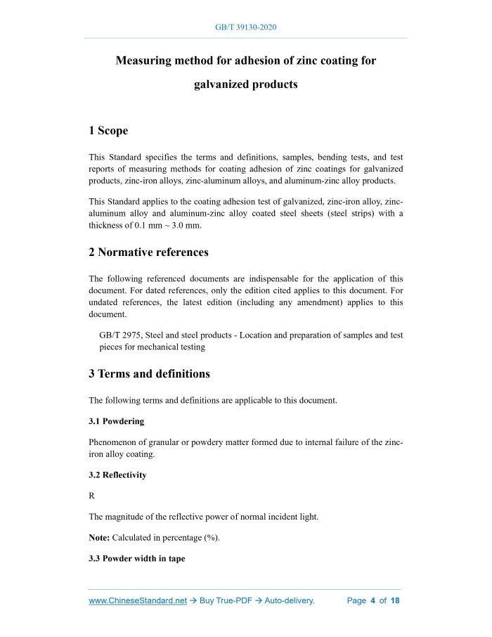 Similar standardsGB/T 39130-2020: Measuring method for adhesion of zinc coating for galvanized products---This is an excerpt. Full copy of true-PDF in English version (including equations, symbols, images, flow-chart, tables, and figures etc.), auto-downloaded/delivered in 9 seconds, can be purchased online: https://www.ChineseStandard.net/PDF.aspx/GBT39130-2020GB NATIONAL STANDARD OF THE PEOPLE’S REPUBLIC OF CHINA ICS 77.140.01 H 25 Measuring method for adhesion of zinc coating for galvanized products ISSUED ON: OCTOBER 11, 2020 IMPLEMENTED ON: MAY 01, 2021 Issued by: State Administration for Market Regulation; Standardization Administration of the People’s Republic of China. Table of ContentsForeword ... 3 1 Scope ... 4 2 Normative references ... 4 3 Terms and definitions ... 4 4 Samples ... 5 5 Bending test ... 6 6 Test report ... 11 Appendix A (Normative) 180° bending test grade evaluation ... 12 Appendix B (Normative) V-shaped bending test grade evaluation ... 14 Appendix C (Informative) Evaluation of coating adhesion by impact method ... 16 Measuring method for adhesion of zinc coating for galvanized products1 ScopeThis Standard specifies the terms and definitions, samples, bending tests, and test reports of measuring methods for coating adhesion of zinc coatings for galvanized products, zinc-iron alloys, zinc-aluminum alloys, and aluminum-zinc alloy products. This Standard applies to the coating adhesion test of galvanized, zinc-iron alloy, zinc- aluminum alloy and aluminum-zinc alloy coated steel sheets (steel strips) with a thickness of 0.1 mm ~ 3.0 mm.2 Normative referencesThe following referenced documents are indispensable for the application of this document. For dated references, only the edition cited applies to this document. For undated references, the latest edition (including any amendment) applies to this document. GB/T 2975, Steel and steel products - Location and preparation of samples and test pieces for mechanical testing3 Terms and definitionsThe following terms and definitions are applicable to this document. 3.1 Powdering Phenomenon of granular or powdery matter formed due to internal failure of the zinc- iron alloy coating. 3.2 Reflectivity The magnitude of the reflective power of normal incident light. Note: Calculated in percentage (%). 3.3 Powder width in tape The width of the ribbon-shaped powder spread on the tape during the powdering test. Note: in millimeters (mm).4 Samples4.1 General requirements During the test, square or rectangular samples shall be used. The cutting position, direction and quantity of sample blanks shall be in accordance with the requirements of GB/T 2975 or related product standards. Both sides of the double-sided-coated product shall be sampled for testing; if one sample is enough for the double-sided test, only one sample shall be taken. The sample shall be flat without deformation; the edges shall be free from burrs; the surface shall be clean and free of oil and corrosion. Before the test, any hammering, impact or cold or hot processing shall not be performed on the sample. The samples shall be free from transverse burrs, scars or scratches on the edge that would affect the test results. The test shall be carried out within the temperature range of 10 °C ~ 35 °C. When there are strict requirements on temperature control, the temperature shall be controlled within (23±5) °C. In case of dispute, the sample to be tested shall be placed in an environment where the temperature is (23±2) °C and the humidity is 50%±5% for at least 24 h before testing. 4.2 Sample size The sample size is shown in Figure 1. Key: a – sample thickness; D – bending indenter diameter; lv – V-shaped groove side length; r – indenter rounding radius; α – die angle; F – applied force. Figure 2 – Schematic diagram of bending device Note: The lower die in Figure 2b) generally has arcs or notches. The schematic symbols of the bending device are shown in Table 1. 5.2.2 Bending device The test device consists of a press and a support with sufficient hardness, which can provide sufficient pressure to ensure that the sample is bent and formed. The contact surfaces of the bending indenter and support with the sample shall be flat. When using a flat-pressing bending device, the side length of the indenter shall not be less than the width of the sample; when using a V-shaped bending device, the width of the bending indenter and the support shall not be less than the width of the sample. The bending indenter shall have sufficient rigidity, and there shall be no deformation during the test. 5.3 Test methods 5.3.1 180° bending test Firstly, preliminarily bend the sample; then, place the sample between the parallel platens in the flat-pressing bending device [Figure 2a)]. The built-in spacer can be added or not during the test, and the thickness of the spacer is equal to the diameter of the specified bending indenter, which is usually an integer multiple of the thickness of the sample. Unless otherwise specified in the product standard, built-in spacers are 5.4.2.3 Reflectance method Use a reflectometer to measure the reflectivity of the powder (powdering and peeling of the coating) adhered to the tape. The probe of the reflectance meter shall be rectangular. The recommended spot test area is 12 mm × 7 mm. It can be used after being calibrated by a standard white board. The standard reflectance of the standard white board shall be within (85±5) %, and the fluctuation shall not exceed ±1%. The reflectivity of the test white board shall be 80% ~ 95%; the color shall be uniform; the uniformity of reflectivity of the whole white board shall be within ±1%; there shall be no obvious cracks, impurities, bubbles and other defects. Quickly stick the tape to the test white board; move it at a constant speed along the length of the tape; find the area with the smallest powder reflectivity on the tape; measure this area several times; record the minimum va