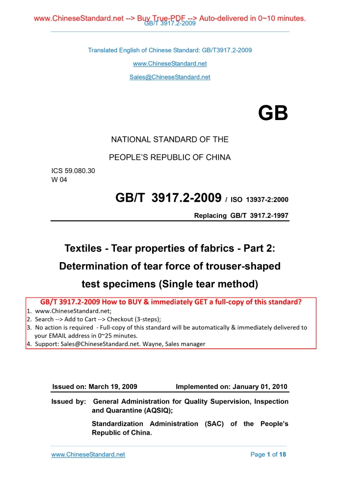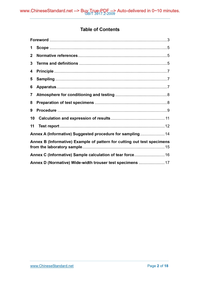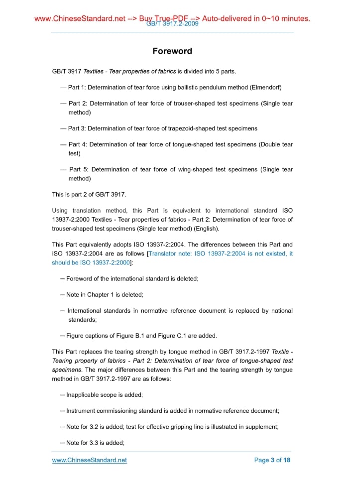 Similar standardsGB/T 3917.2-2009: Textile -- Tear properties of fabrics -- Part 2: Determination of tear force of trouser-shaped test specimens (Single tear method)---This is an excerpt. Full copy of true-PDF in English version (including equations, symbols, images, flow-chart, tables, and figures etc.), auto-downloaded/delivered in 9 seconds, can be purchased online: https://www.ChineseStandard.net/PDF.aspx/GBT3917.2-2009 Textile - Tear properties of fabrics - Part 2. Determination of tear force of trouser-shaped test specimens (Single tear method) ICS 59.080.30 W04 National Standards of People's Republic of China GB/T 3917.2-2009/ISO 13937-2.2000 Replace GB/T 3917.2-1997 Textile fabric tearing performance Part 2. Pants sample (single seam) Determination of tear strength (ISO 13937-2.2000, IDT) Released on.2009-03-19 2010-01-01 implementation General Administration of Quality Supervision, Inspection and Quarantine of the People's Republic of China China National Standardization Administration issued ForewordGB/T 3917 "Tattoo Performance of Textile Fabrics" includes the following five parts. --- Part 1. Determination of the tearing strength of the impact pendulum method; ---Part 2. Determination of the tear strength of the pants sample (single seam); ---Part 3. Determination of tear strength of trapezoidal specimens; --- Part 4. Determination of tear strength of tongue specimens (double seams); --- Part 5. Determination of tear strength of wing specimens (single seams). This part is the second part of GB/T 3917. This section uses the translation method equivalent to ISO 13937-2.2000 "Textile fabric tearing performance Part 2. Pants sample (single Sewing) Determination of tear strength (English version). This section is equivalent to ISO 13937-2.2004, which has the following differences compared to ISO 13937-2.2004. --- Removed the preface to international standards; --- Removed the note in Chapter 1; --- The normative reference documents replaced the corresponding international standards by Chinese standards; --- Added Figure B. 1 and Figure C. 1 picture title. This part replaces GB/T 3917.2-1997 "Tearing properties of textile fabrics - Part 2. Determination of tear strength of tongue-shaped specimens" Single tongue method. The main differences between this part and GB/T 3917.2-1997 single tongue method are. --- Increased the scope of inapplicability; --- Normative references increase the standard for instrument debugging; --- Added a note of 3.2 to supplement the test of the effective clamping line; --- Added a note of 3.3; --- Added a note of 3.4 to illustrate the method of selecting the effective peak; --- Added the specific standard for instrument commissioning in 6.1 General; ---The width of the clamp is modified from at least 50mm to 75mm; ---Added a wide sample with a width of.200mm and its operation method; --- Increased the ratio of the paper feed rate of the recording paper in 9.4 to the elongation rate of the instrument is 2.1; --- Edited changes to 10.1.1, and deleted note 2; --- Increased the calculation of the maximum peak average of 6 samples per sample; --- Appendix C adds an approximate calculation method for peak selection. Appendix D of this section is a normative appendix. Appendix A, Appendix B, and Appendix C are informative annexes. This part was proposed by the China Textile Industry Association. This part is under the jurisdiction of the Basic Standards Branch of the National Textile Standardization Technical Committee (SAC/TC209/SC1). This section is mainly drafted by. Suzhou Fiber Inspection Institute, China Textile Standard (Beijing) Inspection and Certification Center Co., Ltd. The main drafters of this section. Hang Zhiwei, Wang Ning, Wang Huan, Wang Haijuan, and Jing Jing. The previous versions of the standards replaced by this section are. ---GB/T 3917-1983, GB/T 3917.2-1997. GB/T 3917.2-2009/ISO 13937-2.2000 Textile fabric tearing performance Part 2. Determination of tear strength of pants-shaped specimens (single seams)1 ScopeThis part of GB/T 3917 specifies a method for determining the tear strength of a fabric using a single slit pant sample method. In the direction of tearing strength The force required to tear the fabric from the initial single slit slit to the specified length is measured. This section is mainly applicable to woven fabrics, and can also be applied to fabrics made by other technical methods, such as non-woven fabrics. This section does not apply to knitted fabrics, woven elastic fabrics, and sparse fabrics that have the potential to cause tear transfer and have higher anisotropy. Fabric. This section specifies the use of a constant velocity elongation (CRE) tester.2 Normative referencesThe terms in the following documents become the provisions of this part by reference to this part of GB/T 3917. Quotations with dated And all subsequent amendments (not including errata content) or revisions do not apply to this section, however, it is encouraged to The parties to the discussion use the latest version of these documents. For undated references, the latest edition applies to this section. GB/T 6529 Standard atmosphere for textile conditioning and testing (GB/T 6529-2008, ISO 139.2005, MOD) GB/T 16825.1 Inspection of static single-axis testing machines - Part 1 . Examination and calibration of force measuring systems for tension and/or pressure testing machines Standard (GB/T 16825.1-2008, ISO 7500-1..2004, IDT) GB/T 19022 Measurement management system measurement process and measurement equipment requirements (GB/T 19022-2003, ISO 10012. 2003, IDT)3 Terms and definitionsThe following terms and definitions apply to this part of GB/T 3917. 3.1 Throughout the test, one clamp was fixed and the other clamp was used as a tensile tester for constant speed motion. 3.2 The distance between the two effective clamping lines on the test device. Note. The effective clamping line of the chuck can be measured by simultaneously clamping the sample spe