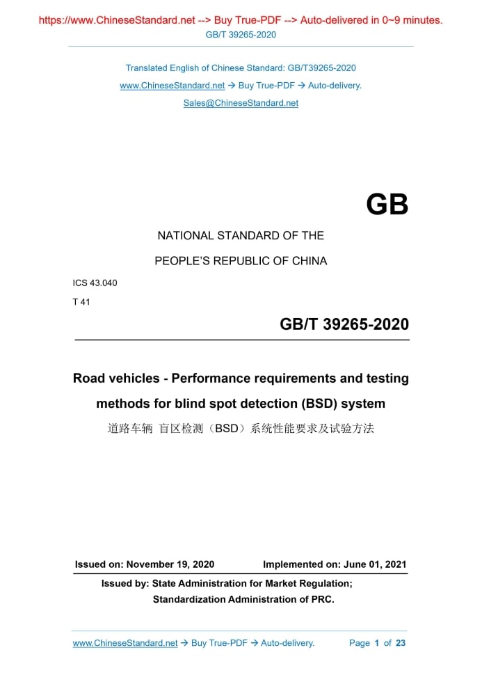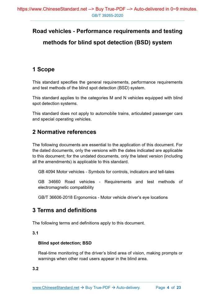 Similar standardsGB/T 39265-2020: Road vehicles - Performance requirements and testing methods for blind spot detection (BSD) system---This is an excerpt. Full copy of true-PDF in English version (including equations, symbols, images, flow-chart, tables, and figures etc.), auto-downloaded/delivered in 9 seconds, can be purchased online: https://www.ChineseStandard.net/PDF.aspx/GBT39265-2020 GB NATIONAL STANDARD OF THE PEOPLE’S REPUBLIC OF CHINA ICS 43.040 T 41 Road vehicles - Performance requirements and testing methods for blind spot detection (BSD) system Issued on. NOVEMBER 19, 2020 Implemented on. JUNE 01, 2021 Issued by. State Administration for Market Regulation; Standardization Administration of PRC. Table of ContentsForeword... 3 1 Scope... 4 2 Normative references... 4 3 Terms and definitions... 4 4 General requirements... 7 5 Performance requirements... 9 6 Test method... 15ForewordThis standard was drafted in accordance with the rules given in GB/T 1.1-2009. This standard was proposed by the Ministry of Industry and Information Technology of the People's Republic of China. This standard shall be under the jurisdiction of the National Automotive Standardization Technical Committee (SAC/TC 114). Drafting organizations of this standard. Shanghai Motor Vehicle Testing and Certification Technology Research Center Co., Ltd., China Automotive Technology Research Center Co., Ltd., China FAW Co., Ltd., Dongfeng Commercial Vehicle Co., Ltd., Chery Automobile Co., Ltd., Neusoft Reach Automotive Technology (Shenyang) Co., Ltd., Shanghai Hella Electronics Co., Ltd., SAIC Motor Technology Center, Bosch Automotive Parts (Suzhou) Co., Ltd., Shenlong Automobile Co., Ltd., General Motors (China) Investment Co., Ltd., Guangzhou Automobile Group Co., Ltd. Automotive Engineering Research Institute, Daimler Greater China Investment Co., Ltd., Beijing Automotive Group Off-road Vehicle Co., Ltd., SAIC Volkswagen Co., Ltd., Zhejiang Wanan Technology Co., Ltd. The main drafters of this standard. Yu Feng, Wang Zhao, Cao Jianyong, Sun Hang, Wu Hangzhe, Xie Hanguang, Qian Yarong, Shen Hongrong, Zhang Chunmin, Zhang Leilei, Hu Rui, Zhang Ao, Wang Peng, Hu Xuhui, Dong Yao, Li Yinan, Zhuang Yunlong, Zhou Jianxiong, Chen Feng. Road vehicles - Performance requirements and testing methods for blind spot detection (BSD) system1 ScopeThis standard specifies the general requirements, performance requirements and test methods of the blind spot detection (BSD) system. This standard applies to the categories M and N vehicles equipped with blind spot detection systems. This standard does not apply to automobile trains, articulated passenger cars and special operating vehicles.2 Normative referencesThe following documents are essential to the application of this document. For the dated documents, only the versions with the dates indicated are applicable to this document; for the undated documents, only the latest version (including all the amendments) is applicable to this standard. GB 4094 Motor vehicles - Symbols for controls, indicators and tell-tales GB 34660 Road vehicles - Requirements and test methods of electromagnetic compatibility GB/T 36606-2018 Ergonomics - Motor vehicle driver's eye locations3 Terms and definitionsThe following terms and definitions apply to this document. 3.1 Blind spot detection; BSD Real-time monitoring of the driver’s blind area of vision, making prompts or warnings when other road users appear in the blind area. 3.2 Subject vehicle In accordance with the requirements of this standard, the vehicle under test for the BSD system test. 3.3 Adjacent area The area located on and adjacent to the left and right sides of the subject vehicle. 3.8 Right turn blind spot detection When the vehicle turns right, the blind spot on the right side of the driver is monitored in real time, meanwhile a warning message is issued when other road users appear in the blind area. 3.9 Self-check The function of the system to check its own faults.4 General requirements4.1 Overview 4.1.1 When the subject vehicle is driving straight, the blind spot detection system for categories M and N vehicles shall be able to detect the target vehicle in the left and right adjacent areas of the subject vehicle and issue a warning when it enters the detection range. 4.2 System on and off The BSD system shall have the function of manual ON or OFF. When it is manually turned off, the status indication shall be given with an indication signal in accordance with 4.4.2. 4.3 Activation requirements When the BSD system is turned on and in an inactive state, the system can detect the target vehicle, but shall not warn the driver. When the BSD system is activated, the system can be activated by at least one of the following methods. 4.4 Human-computer interaction requirements 4.4.1 Warning method The system shall send out warning messages in a way that is easy to be perceived by the driver and can clearly indicate the side where the target vehicle appears. The warning indication information shall be clearly distinguished from the warning information of other systems in the vehicle. 4.4.2 On/off indication requirements The system shall have an indication of the on/off state. The indications shall be visible visually. 4.4.3 System failure indication requirements The system shall have a system failure indication reminder function. Its reminder status identification shall be clearly observed by the driver. 4.5 Self-check requirements The system shall have at least the following self-check functions. 4.6 Others The signs of the controls, indicators and tell-tales of the blind spot detection system shall meet the relevant requirements of GB 4094.5 Performance requirements5.1 Overview 5.1.1 Blind spot detection range for categories M1, N1 vehicles The blind spot detection range of categories M1 and N1 vehicles is as shown in Figure 4. 5.2 Technical requirements 5.2.1 Target vehicle test requirements The blind spot detection function shall 