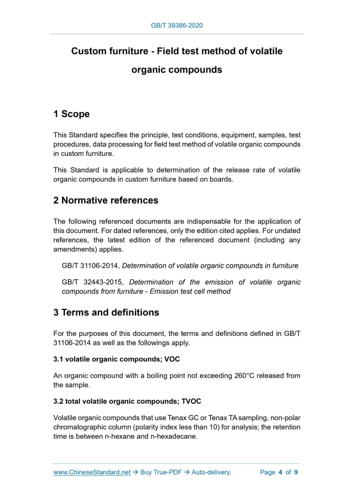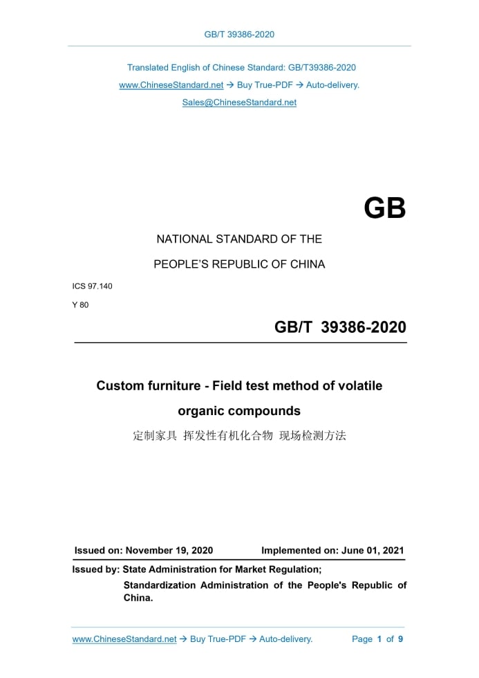 GB/T 39386-2020: Custom furniture. Field test method of volatile organic compounds Delivery: 9 seconds. True-PDF full-copy in English & invoice will be downloaded + auto-delivered via email. See step-by-step procedure Status: Valid