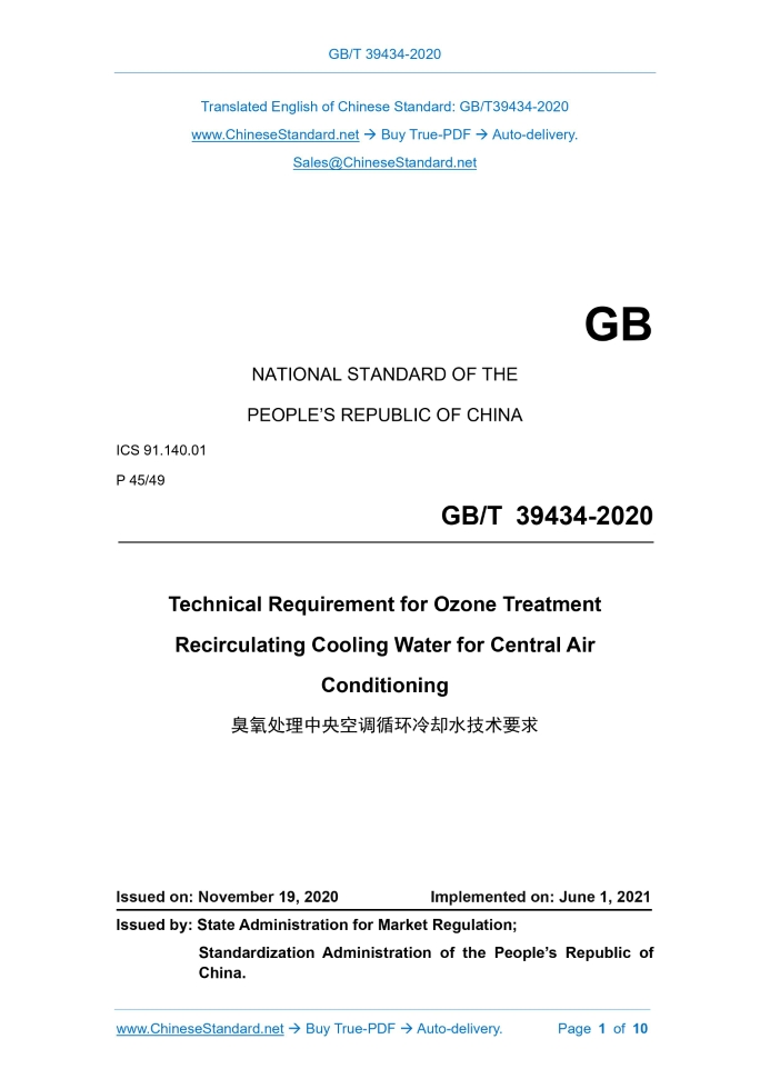 GB/T 39434-2020: Technical requirement for ozone treatment recirculating cooling water for central air conditioning Delivery: 9 seconds. True-PDF full-copy in English & invoice will be downloaded + auto-delivered via email. See step-by-step procedure Status: Valid