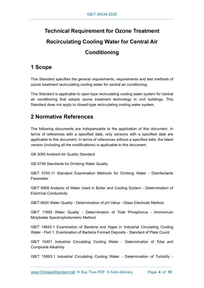 Similar standardsGB/T 39434-2020: Technical requirement for ozone treatment recirculating cooling water for central air conditioning---This is an excerpt. Full copy of true-PDF in English version (including equations, symbols, images, flow-chart, tables, and figures etc.), auto-downloaded/delivered in 9 seconds, can be purchased online: https://www.ChineseStandard.net/PDF.aspx/GBT39434-2020 GB NATIONAL STANDARD OF THE PEOPLE’S REPUBLIC OF CHINA ICS 91.140.01 P 45/49 Technical Requirement for Ozone Treatment Recirculating Cooling Water for Central Air Conditioning ISSUED ON: NOVEMBER 19, 2020 IMPLEMENTED ON: JUNE 1, 2021 Issued by: State Administration for Market Regulation; Standardization Administration of the People’s Republic of China. Table of ContentsForeword ... 3 1 Scope ... 4 2 Normative References ... 4 3 Terms and Definitions ... 5 4 General Requirements ... 7 5 Requirements ... 7 6 Test Methods ... 9 Technical Requirement for Ozone Treatment Recirculating Cooling Water for Central Air Conditioning1 ScopeThis Standard specifies the general requirements, requirements and test methods of ozone treatment recirculating cooling water for central air conditioning. This Standard is applicable to open-type recirculating cooling water system for central air conditioning that adopts ozone treatment technology in civil buildings. This Standard does not apply to closed-type recirculating cooling water system.2 Normative ReferencesThe following documents are indispensable to the application of this document. In terms of references with a specified date, only versions with a specified date are applicable to this document. In terms of references without a specified date, the latest version (including all the modifications) is applicable to this document. GB 3095 Ambient Air Quality Standard GB 5749 Standards for Drinking Water Quality GB/T 5750.11 Standard Examination Methods for Drinking Water - Disinfectants Parameter GB/T 6908 Analysis of Water Used in Boiler and Cooling System - Determination of Electrical Conductivity GB/T 6920 Water Quality - Determination of pH Value - Glass Electrode Method GB/T 11893 Water Quality - Determination of Total Phosphorus - Ammonium Molybdate Spectrophotometric Method GB/T 14643.1 Examination of Bacteria and Algae in Industrial Circulating Cooling Water - Part 1: Examination of Bacteria Formed Deposits - Standard of Plate Count GB/T 15451 Industrial Circulating Cooling Water - Determination of Total and Composite Alkalinity GB/T 15893.1 Industrial Circulating Cooling Water - Determination of Turbidity - transfer heat, and the recirculating cooling water directly contacts the atmosphere to dissipate heat. 3.2 Ozone Treatment Recirculating Cooling Water System for Central Air Conditioning Ozone treatment recirculating cooling water system for central air conditioning refers to a system that uses ozone as a water treatment agent to bypass or directly dissolve ozone into the recirculating cooling water of the central air conditioning for the treatment of the recirculating cooling water. NOTE: hereinafter referred to as recirculating cooling water system. 3.3 Nontraditional Water Source Nontraditional water source refers to a water source different from the traditional surface water supply and groundwater supply. It includes reclaimed water, rainwater and sea water, etc. 3.4 Slime Slime refers to a muddy substance, in which, microorganisms and their secreted mucus are mixed with other organic and inorganic impurities. 3.5 Slime Content Slime content refers to the volume of slime contained in the recirculating cooling water measured through the biological filter method. NOTE: it is expressed in (mL/m3). 3.6 Cycle of Concentration Cycle of concentration refers to the ratio of the salt concentration of the recirculating cooling water to the supplementary water. 3.7 Corrosion Rate Corrosion rate refers to the annual average corrosion depth calculated by metal corrosion weight loss. NOTE: it is expressed in (mm/a). 3.8 Fouling Resistance Fouling resistance refers to the value of the degree of decrease in the heat transfer efficiency due to deposits on the heat transfer surface of the heat exchange equipment. NOTE: it is expressed in (m2 K/W).4 General Requirements4.1 The design and safety measures of the recirculating cooling water system shall comply with the stipulations of GB/T 32107. 4.2 The supplementary water of the recirculating cooling water system should comply with the urban water supply requirements specified in GB 5749. Nontraditional water source may be used, and the water quality shall comply with the water quality requirements of supplementary water of indirect open recirculating cooling water system of central air conditioning in GB/T 29044-2012. The total phosphorus and the total number of bacteria shall comply with the water quality requirements of supplementary water of indirect open recirculating cooling water system used for reclaimed water in GB/T 50050-2017. 4.3 The water drainage quality of the recirculating cooling water system shall comply with the stipulations of GB/T 31962.5 Requirements5.1 Ozone Concentration 5.1.1 The ozone concentration in the recirculating cooling water of the recirculating cooling water system before entering the heat exchanger shall be 0.01 mg/L ~ 0.1 mg/L. 5.1.2 The ozone concentration in the air of the ozone generator room shall not be greater than 0.30 mg/m3 and shall comply with the stipulations of GBZ 2.1. 5.1.3 The ozone concentration in the air around the cooling tower shall not be greater than 0.20 mg/m3 and shall comply with the stipulations of GB 3095. 5.2 Cycle of Concentration 5.2.1 The cycle of concentration of the recirculating cooling water system shall be calculated in accordance with Formula (1): Where, N---the cycle of concentration; r---the conductivity in the recirculating cooling water or the concentration of relatively stable water quality indicators, such as: potassium, sodium and chlorine