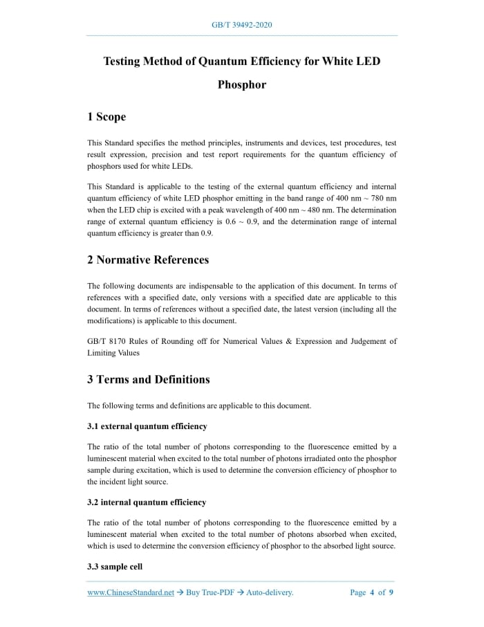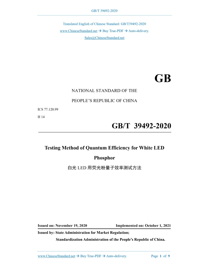 GB/T 39492-2020: Testing method of quantum efficiency for white LED phosphor Delivery: 9 seconds. True-PDF full-copy in English & invoice will be downloaded + auto-delivered via email. See step-by-step procedure Status: Valid