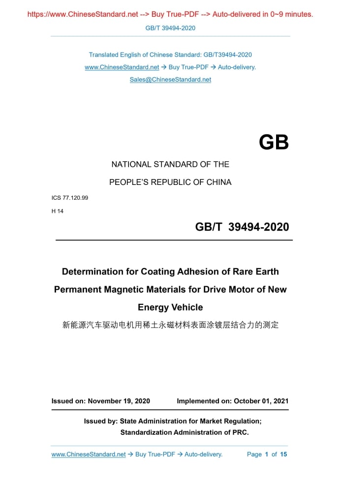 GB/T 39494-2020: Determination for Coating Adhesion of Rare Earth Permanent Magnetic Materials for Drive Motor of New Energy Vehicle Delivery: 9 seconds. True-PDF full-copy in English & invoice will be downloaded + auto-delivered via email. See step-by-step procedure Status: Valid