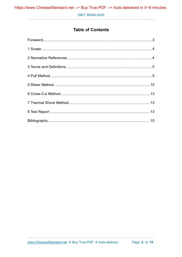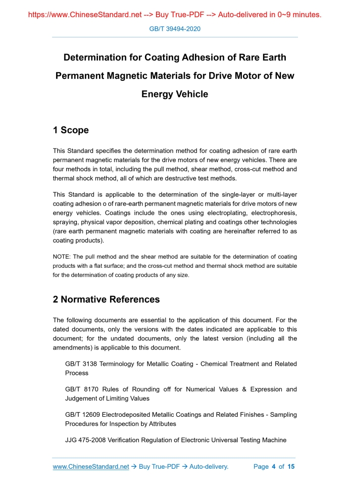 Similar standardsGB/T 39494-2020: Determination for Coating Adhesion of Rare Earth Permanent Magnetic Materials for Drive Motor of New Energy Vehicle---This is an excerpt. Full copy of true-PDF in English version (including equations, symbols, images, flow-chart, tables, and figures etc.), auto-downloaded/delivered in 9 seconds, can be purchased online: https://www.ChineseStandard.net/PDF.aspx/GBT39494-2020 GB NATIONAL STANDARD OF THE PEOPLE’S REPUBLIC OF CHINA ICS 77.120.99 H 14 Determination for Coating Adhesion of Rare Earth Permanent Magnetic Materials for Drive Motor of New Energy Vehicle ISSUED ON: NOVEMBER 19, 2020 IMPLEMENTED ON: OCTOBER 01, 2021 Issued by: State Administration for Market Regulation; Standardization Administration of PRC. Table of ContentsForeword ... 3 1 Scope ... 4 2 Normative References ... 4 3 Terms and Definitions ... 5 4 Pull Method ... 5 5 Shear Method ... 10 6 Cross-Cut Method ... 13 7 Thermal Shock Method ... 13 8 Test Report ... 13 Bibliography ... 15 Determination for Coating Adhesion of Rare Earth Permanent Magnetic Materials for Drive Motor of New Energy Vehicle1 ScopeThis Standard specifies the determination method for coating adhesion of rare earth permanent magnetic materials for the drive motors of new energy vehicles. There are four methods in total, including the pull method, shear method, cross-cut method and thermal shock method, all of which are destructive test methods. This Standard is applicable to the determination of the single-layer or multi-layer coating adhesion o of rare-earth permanent magnetic materials for drive motors of new energy vehicles. Coatings include the ones using electroplating, electrophoresis, spraying, physical vapor deposition, chemical plating and coatings other technologies (rare earth permanent magnetic materials with coating are hereinafter referred to as coating products). NOTE: The pull method and the shear method are suitable for the determination of coating products with a flat surface; and the cross-cut method and thermal shock method are suitable for the determination of coating products of any size.2 Normative ReferencesThe following documents are essential to the application of this document. For the dated documents, only the versions with the dates indicated are applicable to this document; for the undated documents, only the latest version (including all the amendments) is applicable to this document. GB/T 3138 Terminology for Metallic Coating - Chemical Treatment and Related Process GB/T 8170 Rules of Rounding off for Numerical Values & Expression and Judgement of Limiting Values GB/T 12609 Electrodeposited Metallic Coatings and Related Finishes - Sampling Procedures for Inspection by Attributes JJG 475-2008 Verification Regulation of Electronic Universal Testing Machine 4.2.3.2 Test column The test column is composed of a stainless-steel cylinder. One end of the test column is connected to the tensile testing machine; and the other end is bonded with the coating by adhesive. The bonding surface of the test column shall be perpendicular to the axis of the test column (90°±0.5°); and the edges shall be kept at a right angle without chamfering. The surface needs to be polished, and the surface roughness Rα value of the polished surface is in the range of 0.4μm~12.5μm, which may be adjusted appropriately according to the properties of the adhesive. The diameter of the bonding surface of the test column is 10mm~20mm, and the length of the test column is no less than its diameter. If the coating product is a non-planar product such as a tile shape, the bonding surface of the test column shall be processed to a corresponding arc according to the size of the coating product to ensure that the bonding surface of the test column may be closely attached to the bonding surface of the coating. 4.2.3.3 Steel sheet The thickness of the steel sheet is 5mm to ensure that no deformation occurs during the test. The area of the bonding surface of the steel sheet shall be greater than the area of the test surface of the coating product. The upper and lower surfaces shall be smooth, and the roughness Rα value shall be in the range of 0.4μm~12.5μm. 4.2.4 Adhesive 4.2.4.1 The bonding strength of the adhesive shall be greater than the adhesion between the coating and the substrate under test; and it cannot react with the coating. polyurethane methacrylate or epoxy resin adhesives may be used. If the measurement results of different adhesives are different, the measurement result with the lower acceptance value shall be adopted. In order to reduce the influence of the adhesive itself on the measurement results, the same adhesive shall be used as much as possible. 4.2.4.2 The use and curing of the adhesive shall be carried out in accordance with the technical requirements of its manufacturer. Since heating may change the adhesion of the coating, the curing temperature should be no higher than 100°C, and the heating time should not exceed 30min. 4.3 Sampling Sampling according to the sampling plan specified in GB/T 12609; 5 or more pieces of each batch of products shall be randomly sampled. 4.4 Specimen The test surface of the coating product shall be regular, without deformation such as deflection or skew; and the area of the test surface shall be larger than the area of the selected test column. Due to the particularity of rare earth permanent magnetic materials, the specimens shall not be replaced by standard sample boards or products of other specifications. 4.5 Test environment temperature The test shall be carried out in an environment with a temperature of 10°C~30°C and a relative humidity of 30%~70%. 4.6 Test procedure 4.6.1 Pre-treatment of the sample Refer to the test Na in GB/T 2423.22: the rapid temperature change part of the specified conversion time conducts the high and low temperature alternating treatment against the coating products. Expose the coating product to a low temperature of (-40 ± 5) 