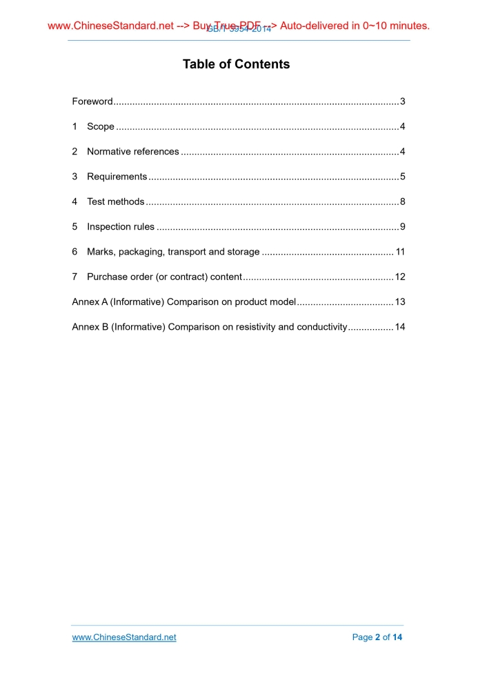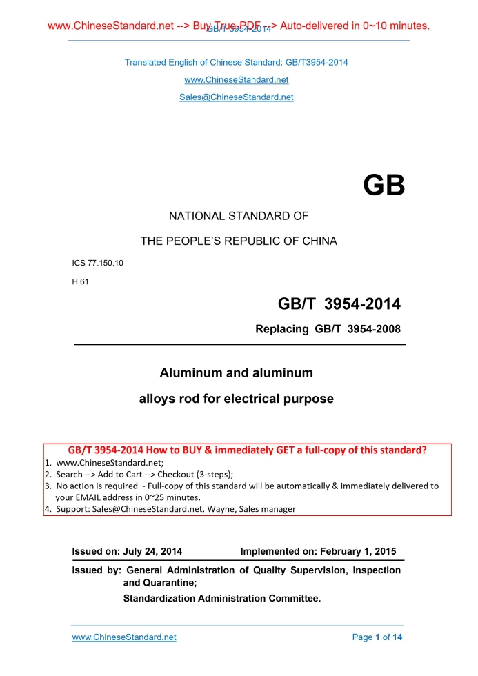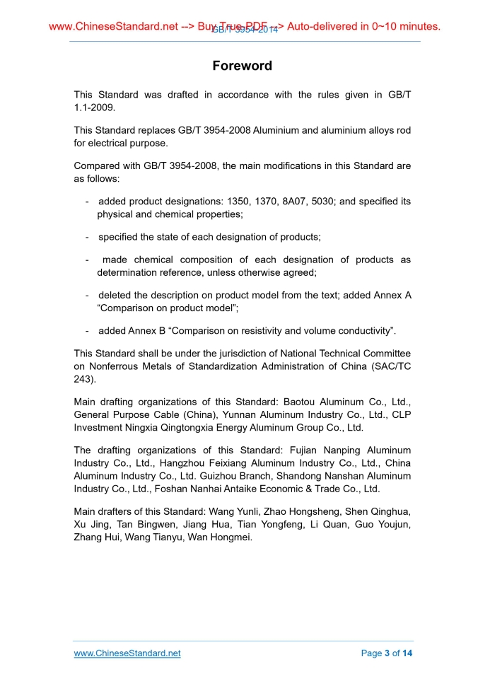 Similar standardsGB/T 3954-2014: Aluminium and aluminium alloys rod for electrical purpose---This is an excerpt. Full copy of true-PDF in English version (including equations, symbols, images, flow-chart, tables, and figures etc.), auto-downloaded/delivered in 9 seconds, can be purchased online: https://www.ChineseStandard.net/PDF.aspx/GBT3954-2014GB NATIONAL STANDARD OF THE PEOPLE’S REPUBLIC OF CHINA ICS 77.150.10 H 61 Replacing GB/T 3954-2008 Aluminum and aluminum alloys rod for electrical purpose Issued on: JULY 24, 2014 Implemented on: FEBRUARY 1, 2015 Issued by. General Administration of Quality Supervision, Inspection and Quarantine; Standardization Administration Committee. Table of ContentsForeword... 3 1 Scope... 4 2 Normative references... 4 3 Requirements... 5 4 Test methods... 8 5 Inspection rules... 9 6 Marks, packaging, transport and storage... 11 7 Purchase order (or contract) content... 12 Annex A (Informative) Comparison on product model... 13 Annex B (Informative) Comparison on resistivity and conductivity... 14ForewordThis Standard was drafted in accordance with the rules given in GB/T 1.1-2009. This Standard replaces GB/T 3954-2008 Aluminium and aluminium alloys rod for electrical purpose. Compared with GB/T 3954-2008, the main modifications in this Standard are as follows. - added product designations. 1350, 1370, 8A07, 5030; and specified its physical and chemical properties; - specified the state of each designation of products; - made chemical composition of each designation of products as determination reference, unless otherwise agreed; - deleted the description on product model from the text; added Annex A “Comparison on product model”; - added Annex B “Comparison on resistivity and volume conductivity”. This Standard shall be under the jurisdiction of National Technical Committee on Nonferrous Metals of Standardization Administration of China (SAC/TC 243). Main drafting organizations of this Standard. Baotou Aluminum Co., Ltd., General Purpose Cable (China), Yunnan Aluminum Industry Co., Ltd., CLP Investment Ningxia Qingtongxia Energy Aluminum Group Co., Ltd. The drafting organizations of this Standard. Fujian Nanping Aluminum Industry Co., Ltd., Hangzhou Feixiang Aluminum Industry Co., Ltd., China Aluminum Industry Co., Ltd. Guizhou Branch, Shandong Nanshan Aluminum Industry Co., Ltd., Foshan Nanhai Antaike Economic & Trade Co., Ltd. Main drafters of this Standard. Wang Yunli, Zhao Hongsheng, Shen Qinghua, Xu Jing, Tan Bingwen, Jiang Hua, Tian Yongfeng, Li Quan, Guo Youjun, Zhang Hui, Wang Tianyu, Wan Hongmei. Aluminum and aluminum alloys rod for electrical purpose1 ScopeThis Standard specifies the requirements, test methods, inspection rules, marks, packaging, storage, quality certificate and purchase order (or contract) of aluminum and aluminum alloys rod for electrical purpose. This Standard is applicable to continuous casting and rolling electric aluminum and aluminum alloys rod for electrical purpose of drawn wire, cable conductive wire with round aluminum wire, aluminum wire and other electrical aluminum conductor.2 Normative referencesThe following referenced documents are indispensable for the application of this document. For dated references, only the edition cited applies. For undated references, the latest edition of the referenced document (including any amendments) applies. GB/T 3048.2, Test methods for electrical properties of electric cables and wires - Part 2.Test of electrical resistivity of metallic materials GB/T 3190, Wrought aluminium and aluminium alloy - Chemical composition GB/T 4909.2, Test methods for bare wires - Part 2.Measurement of dimensions GB/T 4909.3, Test methods for bare wires - Part 3.Tensile test GB/T 7999, Optical emission spectrometric analysis method of aluminum and aluminum alloys GB/T 8170, Rules of rounding off for numerical values & expression and judgement of limiting values GB/T 17432, Methods for sampling for analyzing the chemical composition of wrought aluminum and aluminum alloys GB/T 20975 (all parts), Methods for chemical analysis of aluminium and The measurements of tensile strength and elongation rate shall comply with the provisions of GB/T 4909.3. 4.4 Resistivity The resistivity test shall be carried out according to the provisions of GB/T 3048.2. 4.5 Heat resistance The heat resistance inspection method of aluminum and aluminum alloys rod for electrical purpose with designation of 8A07 shall be carried out according to the following steps. a) insulate the 8A07 aluminum alloy rod in the insulation furnace for 1h according to the requirements of Table 5; b) inspect the tensile strength after naturally cooling the insulated aluminum alloy rod to room temperature; c) 8A07 aluminum alloy rod heat resistance (tensile strength residual rate). the same designation shall be in accordance with the ratio BETWEEN tensile strength after method a) insulation treatment AND un-insulated tensile strength under natural state after production. 4.6 Appearance quality The appearance quality shall be visually inspected. 4.7 Numerical value rounding and determination The numerical value rounding and determination shall be carried out according to the provisions of GB/T 8170.5 Inspection rules5.1 Inspection and acceptance 5.1.1 The aluminum and aluminum alloys rod for electrical purpose shall be inspected by the supplier’s technical supervision department to ensure that the product quality shall be in accordance with the provisions of this Standard (or purchase contract). And fill in the quality certificate. 5.1.2 The purchaser shall inspect the product received according to the provisions of this Standard. If the inspection results do not comply with the provisions of this Standard and purchase order, the purchaser shall put forward to the supplier within one month since the date of receipt of the 5.5.2 If any indicator in tensile strength, elongation, resistivity and 8A07 aluminum alloy rod heat resistance fail