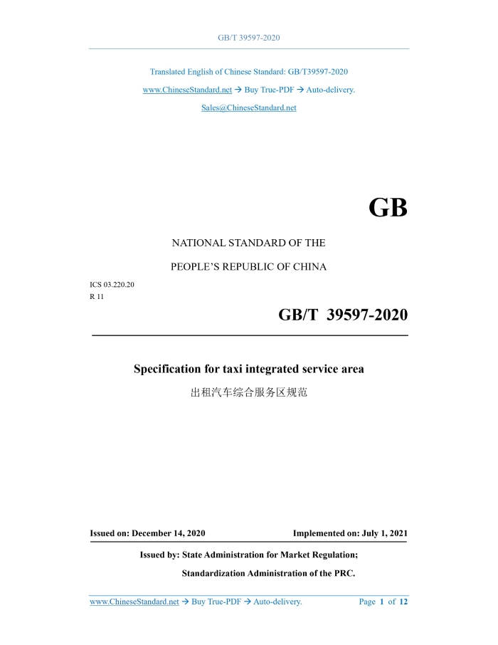 GB/T 39597-2020: Specification for taxi integrated service area Delivery: 9 seconds. True-PDF full-copy in English & invoice will be downloaded + auto-delivered via email. See step-by-step procedure Status: Valid