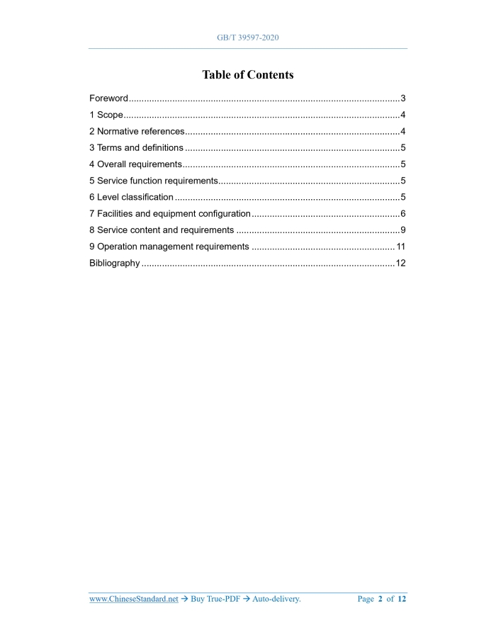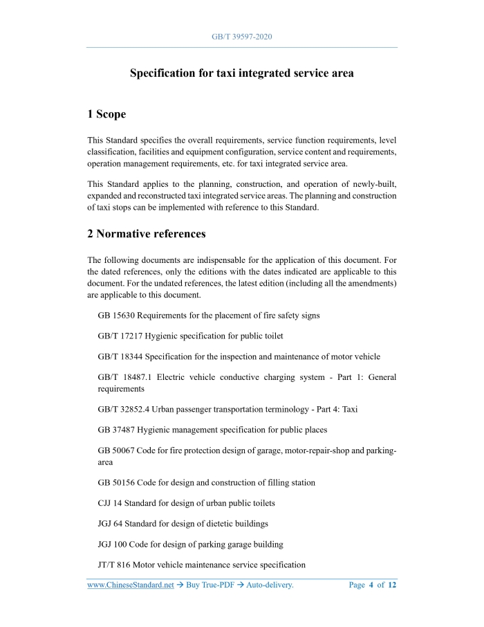 Similar standardsGB/T 39597-2020: Specification for taxi integrated service area---This is an excerpt. Full copy of true-PDF in English version (including equations, symbols, images, flow-chart, tables, and figures etc.), auto-downloaded/delivered in 9 seconds, can be purchased online: https://www.ChineseStandard.net/PDF.aspx/GBT39597-2020GB NATIONAL STANDARD OF THE PEOPLE’S REPUBLIC OF CHINA ICS 03.220.20 R 11 Specification for taxi integrated service area ISSUED ON: DECEMBER 14, 2020 IMPLEMENTED ON: JULY 1, 2021 Issued by: State Administration for Market Regulation; Standardization Administration of the PRC. Table of ContentsForeword ... 3 1 Scope ... 4 2 Normative references ... 4 3 Terms and definitions ... 5 4 Overall requirements ... 5 5 Service function requirements ... 5 6 Level classification ... 5 7 Facilities and equipment configuration ... 6 8 Service content and requirements ... 9 9 Operation management requirements ... 11 Bibliography ... 12 Specification for taxi integrated service area1 ScopeThis Standard specifies the overall requirements, service function requirements, level classification, facilities and equipment configuration, service content and requirements, operation management requirements, etc. for taxi integrated service area. This Standard applies to the planning, construction, and operation of newly-built, expanded and reconstructed taxi integrated service areas. The planning and construction of taxi stops can be implemented with reference to this Standard.2 Normative referencesThe following documents are indispensable for the application of this document. For the dated references, only the editions with the dates indicated are applicable to this document. For the undated references, the latest edition (including all the amendments) are applicable to this document. GB 15630 Requirements for the placement of fire safety signs GB/T 17217 Hygienic specification for public toilet GB/T 18344 Specification for the inspection and maintenance of motor vehicle GB/T 18487.1 Electric vehicle conductive charging system - Part 1: General requirements GB/T 32852.4 Urban passenger transportation terminology - Part 4: Taxi GB 37487 Hygienic management specification for public places GB 50067 Code for fire protection design of garage, motor-repair-shop and parking- area GB 50156 Code for design and construction of filling station CJJ 14 Standard for design of urban public toilets JGJ 64 Standard for design of dietetic buildings JGJ 100 Code for design of parking garage building JT/T 816 Motor vehicle maintenance service specification3 Terms and definitionsThe terms and definitions defined in GB/T 32852.4 are applicable to this document.4 Overall requirements4.1 The setting of taxi integrated service areas shall be combined with the urban comprehensive transportation system planning AND the development planning of the taxi industry, to determine the overall layout and functional positioning. 4.2 The planning of taxi integrated service areas shall be coordinated with land use; reasonably solve the contradiction between land demand and supply; meet the land requirements of taxi integrated service areas. 4.3 Taxi integrated service areas shall choose the location with strong traffic gathering and distribution conditions. It shall also consider the accessibility and convenience of the location. It is advisable to fully utilize existing resources. 4.4 The design of taxi integrated service areas shall reflect the concepts of economy and practicality, reasonable layout, complete facilities, safety, and reliability. 4.5 The construction of taxi integrated service areas shall meet the requirements of relevant national laws and regulations on fire protection, sanitation, energy conservation, and environmental protection.5 Service function requirements5.1 Basic services The taxi integrated service area shall provide basic service functions such as parking, toileting, and rest. 5.2 Extended services Qualified taxi integrated service areas can choose to provide extended services such as catering, related government services, information services, health care, vehicle maintenance, vehicle cleaning, taxi special service facilities and equipment maintenance, and energy supply.6 Level classification6.1 According to different service functions and service scales, taxi integrated service areas are divided into level 1 service area, level 2 service area, and level 3 service area. provisions of GB 37487. 8.4.3 It shall formulate and implement food and beverage service standards and kitchen operation standards. 8.4.4 It shall provide 24 h hot water supply service. 8.5 Related government services Government services related to taxi operation, such as document processing and traffic administrative penalties, can be provided. 8.6 Information service 8.6.1 Related information - such as real-time road conditions, weather and emergencies - can be released. 8.6.2 Relevant passenger flow information - such as airports, train stations and passenger stations - can be released. 8.7 Health care service Basic health care services - such as temperature measurement, blood pressure measurement and first aid - can be provided. 8.8 Vehicle maintenance service 8.8.1 Vehicle maintenance services shall comply with the relevant provisions of GB/T 18344 and JT/T 816. 8.8.2 In a prominent position, it shall announce relevant certificates, maintenance items, service procedures, and fee prices, etc. 8.9 Vehicle cleaning service 8.9.1 Services - such as vehicle cleaning, interior disinfection, seat cover replacement and cleaning - can be provided. 8.9.2 In a prominent position, it shall announce service prices for vehicle cleaning, interior disinfection, and seat cover replacement and cleaning. 8.10 Taxi special service facilities and equipment maintenance 8.10.1 Maintenance services for taxi dome lights, metering-pricing equipment, and onboard intelligent terminal equipment can be provided. 8.10.2 In a prominent position,