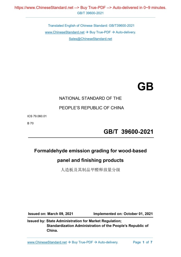 GB/T 39600-2021: Formaldehyde emission grading for wood-based panel and finishing products Delivery: 9 seconds. True-PDF full-copy in English & invoice will be downloaded + auto-delivered via email. See step-by-step procedure Status: Valid