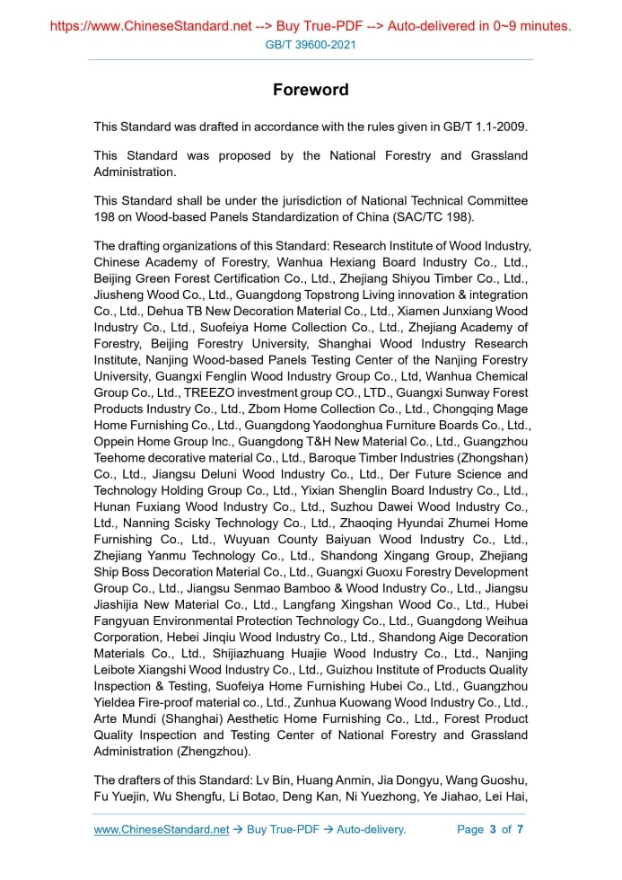 Similar standardsGB/T 39600-2021: Formaldehyde emission grading for wood-based panel and finishing products---This is an excerpt. Full copy of true-PDF in English version (including equations, symbols, images, flow-chart, tables, and figures etc.), auto-downloaded/delivered in 9 seconds, can be purchased online: https://www.ChineseStandard.net/PDF.aspx/GBT39600-2021GB NATIONAL STANDARD OF THE PEOPLE’S REPUBLIC OF CHINA ICS 79.060.01 B 70 Formaldehyde emission grading for wood-based panel and finishing products ISSUED ON: MARCH 09, 2021 IMPLEMENTED ON: OCTOBER 01, 2021 Issued by: State Administration for Market Regulation; Standardization Administration of the People’s Republic of China. Table of ContentsForeword ... 3 1 Scope ... 5 2 Normative references ... 5 3 Terms and definitions ... 5 4 Formaldehyde emission grading requirements ... 5 5 Test methods ... 6 6 Determination rules ... 7ForewordThis Standard was drafted in accordance with the rules given in GB/T 1.1-2009. This Standard was proposed by the National Forestry and Grassland Administration. This Standard shall be under the jurisdiction of National Technical Committee 198 on Wood-based Panels Standardization of China (SAC/TC 198). The drafting organizations of this Standard: Research Institute of Wood Industry, Chinese Academy of Forestry, Wanhua Hexiang Board Industry Co., Ltd., Beijing Green Forest Certification Co., Ltd., Zhejiang Shiyou Timber Co., Ltd., Jiusheng Wood Co., Ltd., Guangdong Topstrong Living innovation & integration Co., Ltd., Dehua TB New Decoration Material Co., Ltd., Xiamen Junxiang Wood Industry Co., Ltd., Suofeiya Home Collection Co., Ltd., Zhejiang Academy of Forestry, Beijing Forestry University, Shanghai Wood Industry Research Institute, Nanjing Wood-based Panels Testing Center of the Nanjing Forestry University, Guangxi Fenglin Wood Industry Group Co., Ltd, Wanhua Chemical Group Co., Ltd., TREEZO investment group CO., LTD., Guangxi Sunway Forest Products Industry Co., Ltd., Zbom Home Collection Co., Ltd., Chongqing Mage Home Furnishing Co., Ltd., Guangdong Yaodonghua Furniture Boards Co., Ltd., Oppein Home Group Inc., Guangdong T&H New Material Co., Ltd., Guangzhou Teehome decorative material Co., Ltd., Baroque Timber Industries (Zhongshan) Co., Ltd., Jiangsu Deluni Wood Industry Co., Ltd., Der Future Science and Technology Holding Group Co., Ltd., Yixian Shenglin Board Industry Co., Ltd., Hunan Fuxiang Wood Industry Co., Ltd., Suzhou Dawei Wood Industry Co., Ltd., Nanning Scisky Technology Co., Ltd., Zhaoqing Hyundai Zhumei Home Furnishing Co., Ltd., Wuyuan County Baiyuan Wood Industry Co., Ltd., Zhejiang Yanmu Technology Co., Ltd., Shandong Xingang Group, Zhejiang Ship Boss Decoration Material Co., Ltd., Guangxi Guoxu Forestry Development Group Co., Ltd., Jiangsu Senmao Bamboo & Wood Industry Co., Ltd., Jiangsu Jiashijia New Material Co., Ltd., Langfang Xingshan Wood Co., Ltd., Hubei Fangyuan Environmental Protection Technology Co., Ltd., Guangdong Weihua Corporation, Hebei Jinqiu Wood Industry Co., Ltd., Shandong Aige Decoration Materials Co., Ltd., Shijiazhuang Huajie Wood Industry Co., Ltd., Nanjing Leibote Xiangshi Wood Industry Co., Ltd., Guizhou Institute of Products Quality Inspection & Testing, Suofeiya Home Furnishing Hubei Co., Ltd., Guangzhou Yieldea Fire-proof material co., Ltd., Zunhua Kuowang Wood Industry Co., Ltd., Arte Mundi (Shanghai) Aesthetic Home Furnishing Co., Ltd., Forest Product Quality Inspection and Testing Center of National Forestry and Grassland Administration (Zhengzhou). The drafters of this Standard: Lv Bin, Huang Anmin, Jia Dongyu, Wang Guoshu, Fu Yuejin, Wu Shengfu, Li Botao, Deng Kan, Ni Yuezhong, Ye Jiahao, Lei Hai, Formaldehyde emission grading for wood-based panel and finishing products1 ScopeThis Standard specifies the formaldehyde emission grading requirements, test methods and determination rules. This Standard applies to formaldehyde emission grading for fiberboard, chipboard, plywood, core-board, reconstituted decorative material, laminated veneer lumber, laminated wood, surface decorated wood-based panel, wooden floor, wooden wall panel, wooden door and other indoor wood-based panel and finishing products.2 Normative referencesThe following documents are indispensable for the application of this document. For dated references, only the dated version applies to this document. For undated references, the latest edition (including all amendments) applies to this document. GB/T 17657-2013, Test Methods of Evaluating the Properties of Wood-based Panels and Surface Decorated Wood-based Panels GB/T 18259-2018, Terminology for wood-based panels and their surface decoration GB 18580-2017, Indoor decorating and refurbishing materials - Limit of formaldehyde emission of wood-based panels and finishing products3 Terms and definitionsTerms and definitions determined by GB/T 18259-2018 are applicable to this document.4 Formaldehyde emission grading requirementsThe formaldehyde emission of indoor wood-based panel and finishing products is divided into three grades according to the limit value. The specific grading requirements shall comply with Table 1. ......Source: Above contents are excerpted from the full-copy PDF -- translated/reviewed by: www.ChineseStandard.net / Wayne Zheng et al. Tips & Frequently Asked Questions:Question 1: How long will the true-PDF of English version of GB/T 39600-2021 be delivered?Answer: The full copy PDF of English version of GB/T 39600-2021 can be downloaded in 9 seconds, and it will also be emailed to you in 9 seconds (double mechanisms to ensure the delivery reliably), with PDF-invoice.Question 2: Can I share the purchased PDF of GB/T 39600-2021_English with my colleagues?Answer: Yes. The purchased PDF of GB/T 39600-2021_English will be deemed to be sold to your employer/organization who actually paid for it, including your colleagues and your employer's intranet.Question 3: Does the price include tax/VAT?Answer: Yes. Our tax invo