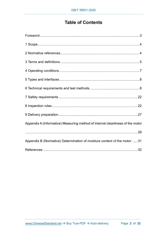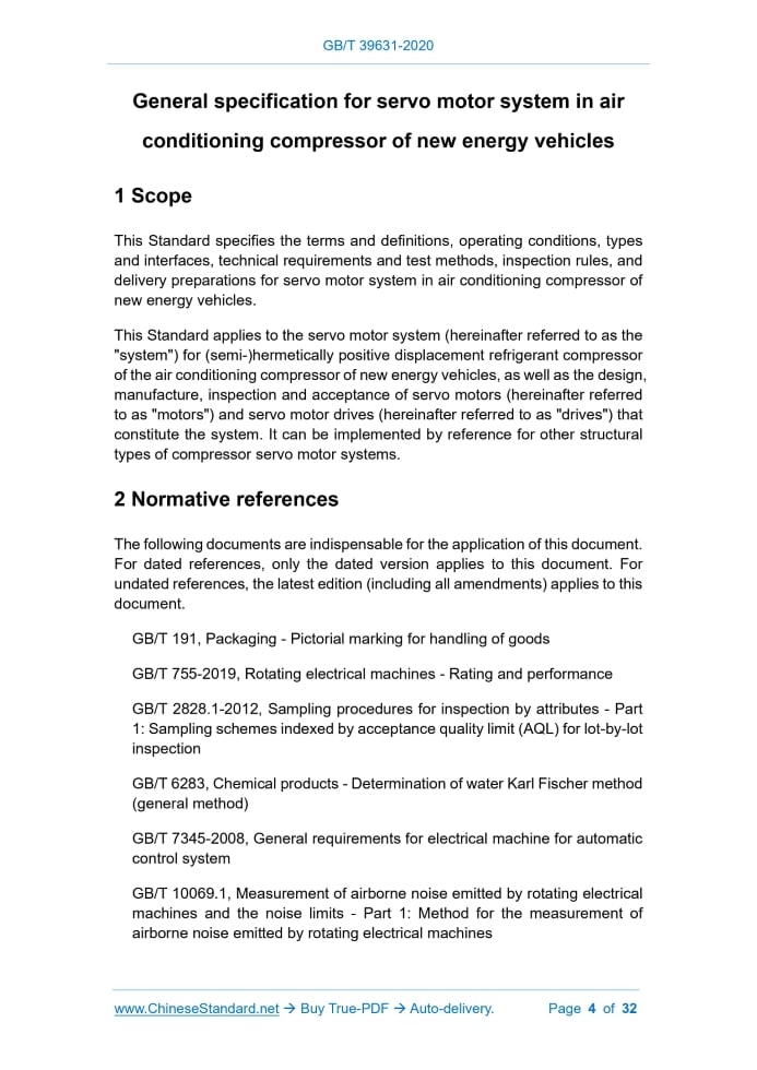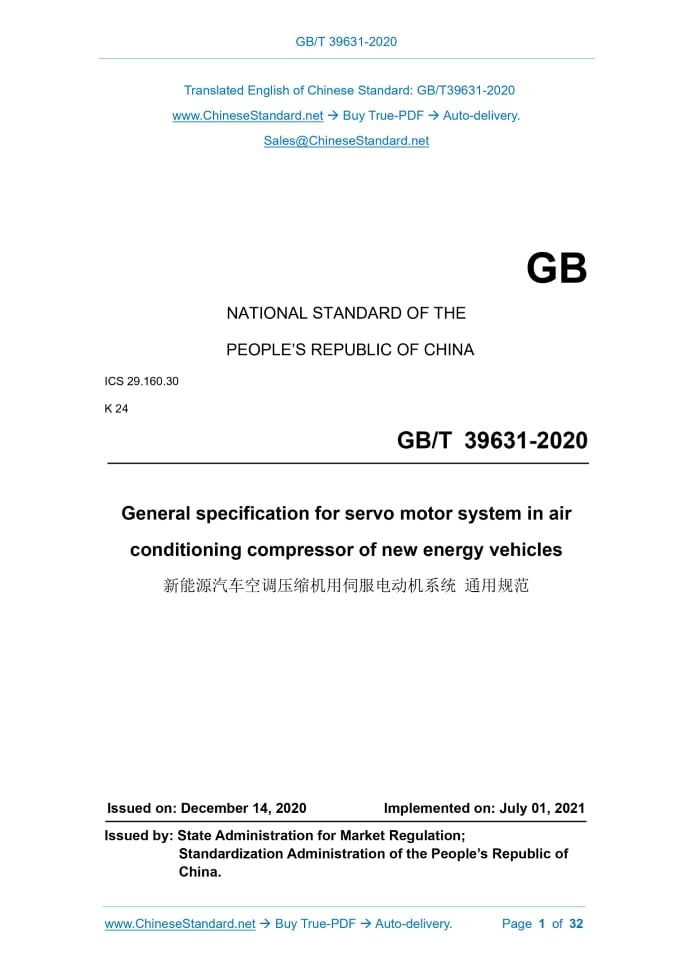 Similar standardsGB/T 39631-2020: General specification for servo motor system in air conditioning compressor of new energy vehicles---This is an excerpt. Full copy of true-PDF in English version (including equations, symbols, images, flow-chart, tables, and figures etc.), auto-downloaded/delivered in 9 seconds, can be purchased online: https://www.ChineseStandard.net/PDF.aspx/GBT39631-2020 GB NATIONAL STANDARD OF THE PEOPLE’S REPUBLIC OF CHINA ICS 29.160.30 K 24 General specification for servo motor system in air conditioning compressor of new energy vehicles ISSUED ON: DECEMBER 14, 2020 IMPLEMENTED ON: JULY 01, 2021 Issued by: State Administration for Market Regulation; Standardization Administration of the People’s Republic of China. Table of ContentsForeword ... 3 1 Scope ... 4 2 Normative references ... 4 3 Terms and definitions ... 5 4 Operating conditions ... 7 5 Types and interfaces ... 8 6 Technical requirements and test methods ... 8 7 Safety requirements ... 22 8 Inspection rules ... 22 9 Delivery preparation ... 27 Appendix A (Informative) Measuring method of internal cleanliness of the motor ... 29 Appendix B (Normative) Determination of moisture content of the motor ... 31 References ... 32 General specification for servo motor system in air conditioning compressor of new energy vehicles1 ScopeThis Standard specifies the terms and definitions, operating conditions, types and interfaces, technical requirements and test methods, inspection rules, and delivery preparations for servo motor system in air conditioning compressor of new energy vehicles. This Standard applies to the servo motor system (hereinafter referred to as the "system") for (semi-)hermetically positive displacement refrigerant compressor of the air conditioning compressor of new energy vehicles, as well as the design, manufacture, inspection and acceptance of servo motors (hereinafter referred to as "motors") and servo motor drives (hereinafter referred to as "drives") that constitute the system. It can be implemented by reference for other structural types of compressor servo motor systems.2 Normative referencesThe following documents are indispensable for the application of this document. For dated references, only the dated version applies to this document. For undated references, the latest edition (including all amendments) applies to this document. GB/T 191, Packaging - Pictorial marking for handling of goods GB/T 755-2019, Rotating electrical machines - Rating and performance GB/T 2828.1-2012, Sampling procedures for inspection by attributes - Part 1: Sampling schemes indexed by acceptance quality limit (AQL) for lot-by-lot inspection GB/T 6283, Chemical products - Determination of water Karl Fischer method (general method) GB/T 7345-2008, General requirements for electrical machine for automatic control system GB/T 10069.1, Measurement of airborne noise emitted by rotating electrical machines and the noise limits - Part 1: Method for the measurement of airborne noise emitted by rotating electrical machines The fluid medium that realizes the refrigeration cycle in the refrigeration system. Note: Usually, it also includes changes in the state of the fluid. It absorbs heat at low temperature and low pressure, and discharges heat at higher temperature and pressure. 3.9 Compatibility The character that when two or more materials and the test working medium (refrigerant + refrigerating machine oil) are used together in a hermetically refrigerant compressor, they will not have harmful effects on each other.4 Operating conditions4.1 Electrical operating conditions Unless otherwise specified, the input rated DC voltage is preferably 24 V, 48 V, 60 V, 72 V, 120 V, 192 V, 240 V, 288 V, 320 V, 336 V, 360 V, 380 V, 442 V, 480 V, 500 V, 580 V, 600 V. 4.2 Environmental conditions 4.2.1 Environmental conditions for use Unless otherwise specified, the environmental conditions for the use of the system shall comply with: -- Environmental medium: refrigerant and lubricating oil (refrigerant shall be R134a, R407C, R410A, R1234yf or as specified by product-specific technical conditions; lubricating oil shall be POE, PAG, PVE, FVC or as specified by product-specific technical conditions); -- Operating environment temperature: it is -15 °C ~ 85 °C for common type, -25 °C ~ 85 °C for low temperature type, and -35 °C ~ 85 °C for ultra-low temperature type. 4.2.2 Storage environmental conditions The temperature of the storage environment is -40 °C ~ 35 °C; there shall be measures to prevent moisture and vibration; the storage environment shall be well ventilated, and no corrosive gas is allowed around. 4.2.3 Test environmental conditions If there are no other regulations, each test shall be carried out under the following climatic conditions: The test shall not be repeated. When it is required, a test is allowed after installation and before operation, and the test voltage value shall not exceed 80% of the specified voltage. The inspection test points of the drive shall conform to: a) The main circuit and the control circuit share the same reference ground. The inspection test point is the power input terminal of the main circuit. Short-circuit the power input terminal during the test; b) The main circuit and the control circuit do not share the same reference ground. The inspection test point includes the power input terminal and the control signal terminal of the main circuit. Short-circuit the power input terminal and the control signal terminal respectively during the test. 6.5 Insulation resistance 6.5.1 Technical requirements Under normal test conditions and the extreme low temperature conditions which are specified in the product-specific technical conditions, the insulation resistance between the motor stator winding and the shell, and between the inspection test point of the driver and the protective ground terminal (the exposed part of the shell) shall not be less than 50 MΩ; under extreme high temperatu