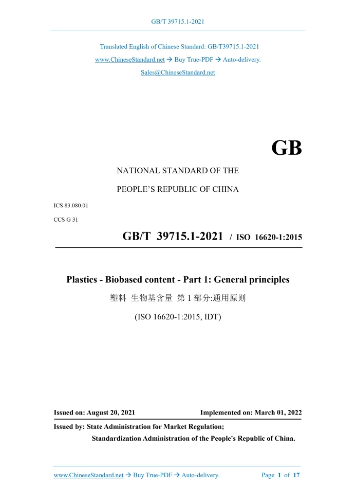 GB/T 39715.1-2021: Plastics - Biobased content - Part 1: General principles Delivery: 9 seconds. True-PDF full-copy in English & invoice will be downloaded + auto-delivered via email. See step-by-step procedure Status: Valid