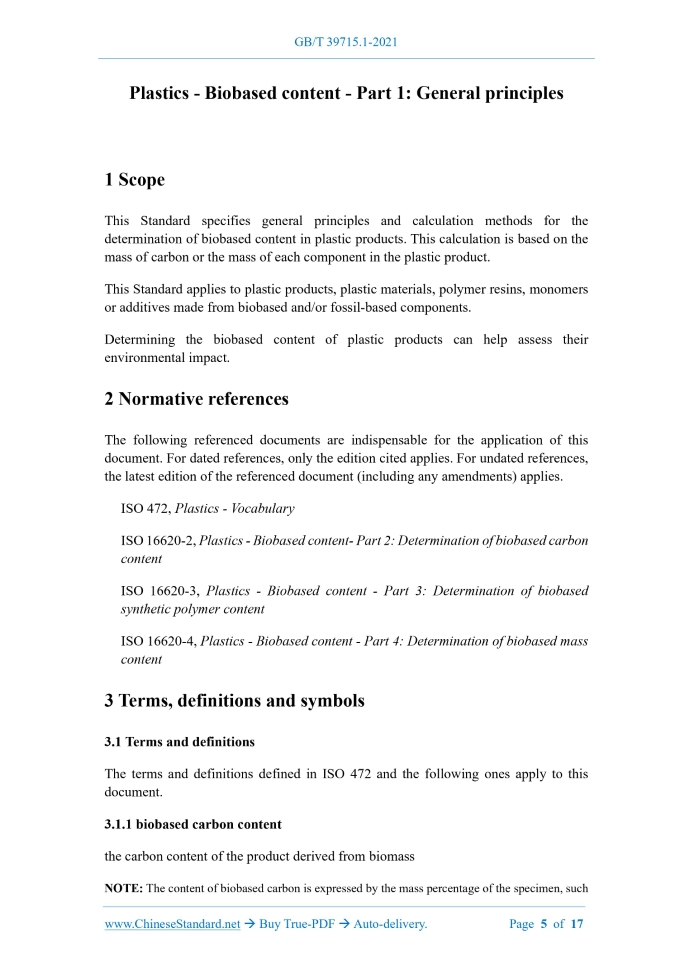 Similar standardsGB/T 39715.1-2021: Plastics - Biobased content - Part 1: General principles---This is an excerpt. Full copy of true-PDF in English version (including equations, symbols, images, flow-chart, tables, and figures etc.), auto-downloaded/delivered in 9 seconds, can be purchased online: https://www.ChineseStandard.net/PDF.aspx/GBT39715.1-2021NATIONAL STANDARD OF THE PEOPLE’S REPUBLIC OF CHINA ICS 83.080.01 CCS G 31 GB/T 39715.1-2021 / ISO 16620-1:2015 Plastics - Biobased content - Part 1: General principles (ISO 16620-1:2015, IDT) ISSUED ON: AUGUST 20, 2021 IMPLEMENTED ON: MARCH 01, 2022 Issued by: State Administration for Market Regulation; Standardization Administration of the People's Republic of China. Table of ContentsForeword ... 3 Introduction ... 4 1 Scope ... 5 2 Normative references ... 5 3 Terms, definitions and symbols ... 5 4 Principle ... 7 5 Calculation method of biobased content ... 10 Annex A (informative) Calculation examples for biobased carbon content ... 14 Annex B (informative) Calculation examples for biobased synthetic polymer content and biobased mass content ... 15 Bibliography... 17 Plastics - Biobased content - Part 1: General principles1 ScopeThis Standard specifies general principles and calculation methods for the determination of biobased content in plastic products. This calculation is based on the mass of carbon or the mass of each component in the plastic product. This Standard applies to plastic products, plastic materials, polymer resins, monomers or additives made from biobased and/or fossil-based components. Determining the biobased content of plastic products can help assess their environmental impact.2 Normative referencesThe following referenced documents are indispensable for the application of this document. For dated references, only the edition cited applies. For undated references, the latest edition of the referenced document (including any amendments) applies. ISO 472, Plastics - Vocabulary ISO 16620-2, Plastics - Biobased content- Part 2: Determination of biobased carbon content ISO 16620-3, Plastics - Biobased content - Part 3: Determination of biobased synthetic polymer content ISO 16620-4, Plastics - Biobased content - Part 4: Determination of biobased mass content3 Terms, definitions and symbols3.1 Terms and definitions The terms and definitions defined in ISO 472 and the following ones apply to this document. 3.1.1 biobased carbon content the carbon content of the product derived from biomass NOTE: The content of biobased carbon is expressed by the mass percentage of the specimen, such as the percentage of total carbon content, or the percentage of total organic carbon content. 3.1.2 biomass materials of biological origin, excluding mineral and/or fossil materials 3.1.3 synthetic polymer polymers obtained by chemical and/or bioindustrial processes 3.1.4 biobased synthetic polymer polymers obtained by chemical and/or bioindustrial processes, the raw materials of which are wholly or partly derived from biomass NOTE: Natural polymers (see 3.1.7) are not biobased synthetic polymers. 3.1.5 biobased synthetic polymer content; mBSP the content of biobased synthetic polymers in the product NOTE: The content of biobased synthetic polymer in the product is expressed as the percentage or fraction of the mass of biobased synthetic polymer and the total mass of the product. 3.1.6 carbon content carbon content in a component, material or product, expressed as a mass percent 3.1.7 natural polymer a polymer obtained from biomass, where the polymer retains the original chemical structure and components in the biomass Example: Starch, cellulose, lignin or lignocellulose. 3.1.8 product a resin, material, article or article resulting from a manufacturing process NOTE: Products can be materials, semi-finished products or final products, such as polyethylene resins obtained from petroleum or biomass, biobased PE films, PET resins, PET bottles, monomers and plasticizers. 3.1.9 total carbon; TC the total amount of carbon present in the specimen in the form of organic carbon, inorganic carbon and elemental carbon 3.1.10 total organic carbon; TOC the amount of carbon converted to carbon dioxide by combustion, excluding the amount of carbon released by acid treatment 3.1.11 biobased mass content; mB the total amount of biobased synthetic polymers, natural polymers, and biobased additives in the product NOTE: The total content of biobased substances in the product is expressed in terms of the mass percentage or fraction of biobased synthetic polymers, natural polymers and biobased additives relative to the total mass of the product. 3.2 Symbols : The percentage of biobased carbon content relative to the total carbon content. : The percentage of biobased carbon content relative to the total organic carbon content. Mx - The carbon mass of component x. Wx - The mass of component x.4 PrincipleAs shown in Figure 1a), plastic products usually contain the following six categories of components: a) Biobased synthetic polymers (component A) and fossil-based synthetic polymers (component B); b) Natural polymer (component C); c) Biobased additives (organic and/or inorganic) (component D), fossil-based organic additives (component E) and inorganic additives (component F). In ISO 16620, additives also include fillers. The biobased content of plastic products can be divided into the following categories: 1) Biobased carbon content [see Figure 1 b1), Figure 1 b2), see 5.1 for the calculation method]. The biobased carbon content in Part 2 of ISO 16620 can be expressed as the mass percentage of biobased carbon relative to total organic carbon , or the mass percentage of biobased carbon relative to total carbon ratio . In plastic products, inorganic compounds such as calcium carbonate are added for D - Biobased additive (organic and inorganic); E - Fossil-based additive; F - Non-biobased inorganic additive; M1 - Biobased carbon; M2 - Fossil-based carbon; M3 - Inorga