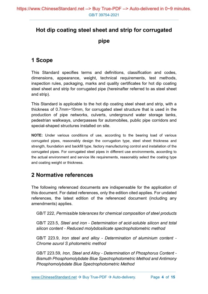 Similar standardsGB/T 39754-2021: Hot dip coating steel sheet and strip for corrugated pipe---This is an excerpt. Full copy of true-PDF in English version (including equations, symbols, images, flow-chart, tables, and figures etc.), auto-downloaded/delivered in 9 seconds, can be purchased online: https://www.ChineseStandard.net/PDF.aspx/GBT39754-2021GB NATIONAL STANDARD OF THE PEOPLE’S REPUBLIC OF CHINA ICS 77.140.50 H 46 Hot dip coating steel sheet and strip for corrugated pipe ISSUED ON: MARCH 09, 2021 IMPLEMENTED ON: OCTOBER 01, 2021 Issued by: State Administration for Market Regulation; Standardization Administration of the People's Republic of China. Table of ContentsForeword ... 3 1 Scope ... 4 2 Normative references ... 4 3 Terms and definitions ... 6 4 Classification and codes ... 7 5 Order content ... 8 6 Dimensions, appearance and weight ... 9 7 Technical requirements ... 9 8 Test methods ... 13 9 Inspection rules ... 14 10 Packaging, marks and quality certificate ... 15 Hot dip coating steel sheet and strip for corrugated pipe1 ScopeThis Standard specifies terms and definitions, classification and codes, dimensions, appearance, weight, technical requirements, test methods, inspection rules, packaging, marks and quality certificates for hot dip coating steel sheet and strip for corrugated pipe (hereinafter referred to as steel sheet and strip). This Standard is applicable to the hot dip coating steel sheet and strip, with a thickness of 0.7mm~10mm, for corrugated steel structure that is used in the production of pipe networks, culverts, underground water storage tanks, pedestrian walkways, underpasses for automobiles, public pipe corridors and special-shaped structures installed on site. NOTE: Under various conditions of use, according to the bearing load of various corrugated pipes, reasonably design the corrugation type, steel sheet thickness and strength, foundation and backfill type, factory manufacturing control and installation of the corrugated pipes. For corrugated steel pipes in different use environments, according to the actual environment and service life requirements, reasonably select the coating type and coating weight or thickness.2 Normative referencesThe following referenced documents are indispensable for the application of this document. For dated references, only the edition cited applies. For undated references, the latest edition of the referenced document (including any amendments) applies. GB/T 222, Permissible tolerances for chemical composition of steel products GB/T 223.5, Steel and iron - Determination of acid-soluble silicon and total silicon content - Reduced molybdosilicate spectrophotometric method GB/T 223.9, Iron steel and alloy - Determination of aluminium content - Chrome azurol S photometric method GB/T 223.59, Iron, Steel and Alloy - Determination of Phosphorus Content - Bismuth Phosphomolybdate Blue Spectrophotometric Method and Antimony Phosphomolybdate Blue Spectrophotometric Method on dimensions shape and weight3 Terms and definitionsFor the purposes of this document, the following terms and definitions apply. 3.1 hot-dip zinc coating; Z a coating that is obtained by immersing the pre-treated steel strip or steel sheet in a molten zinc solution of which the zinc content is not less than 99% 3.2 aluminum-silicon coating; AS a coating that is obtained by immersing the pretreated steel strip or steel sheet in a plating solution of which the aluminum content is 90%±2% and the silicon content is 10%±2% 3.3 aluminum-zinc alloy coating; AZ a coating that is obtained by immersing the treated steel strip or steel sheet in a plating solution of which the aluminum content is 55%±3%, the silicon content is 1.6%±0.3%, and the balance is zinc 3.4 base steel thickness the thickness of steel sheet substrate without metal coating or other coating 3.5 corrugated steel pipe; CSP a coated steel strip or steel sheet is processed into a corrugated steel pipe 3.6 corrugated steel pipe sheet a steel sheet or strip that is used to produce corrugated steel pipe (structural corrugated steel pipe, spiral corrugated steel pipe) with coating 3.7 corrugated steel pipe a large size steel pipe of which the hot-rolled steel sheet is pickled and then rolled into a corrugated sheet, which is hot-dip galvanized or hot-dipped with other coatings by the solvent method, and then assembled with these coated corrugated steel sheets NOTE: Hot-rolled steel sheet is usually used. 3.8 helical corrugated steel pipe a steel pipe that is made of coated steel strip through spiral winding process NOTE: Include various coated helical corrugated steel pipes, corrugated pipes of special material and corrugated pipes of various structures, such as carbon steel corrugated pipes, weather resistant corrugated pipe, stainless steel corrugated pipes.4 Classification and codes4.1 Codes 4.1.1 Usage code The usage code is the initial letter "B" of the Chinese pinyin of the word "Bo" (meaning corrugated in English) in "Bo Wen Guan" (meaning corrugated pipe). 4.1.2 Steel grade code If the second letter of the steel grade code is C, it represents that the base steel is specified as a cold-rolled base steel. If the second letter is D, it represents that the base steel is specified as a hot-rolled base steel. 4.1.3 Coating type code The pure zinc coating is expressed as Z. The aluminum-zinc coating is expressed as AZ. The aluminum-silicon coating is expressed as AS. 4.2 Expression method for designation The designation of steel sheet and strip is composed of four parts: product usage code, steel grade code, specified minimum tensile strength value and coating type code. The specified minimum tensile strength value and the coating type code are connected with a plus sign "+". Example 1: BC290+Z It means that the product is steel for corrugated pipes, the base steel is cold-rolled, the minimum tensile strength specified is 290MPa, and is a zinc-coated product. Example 2: BD380+AZ It means that the 