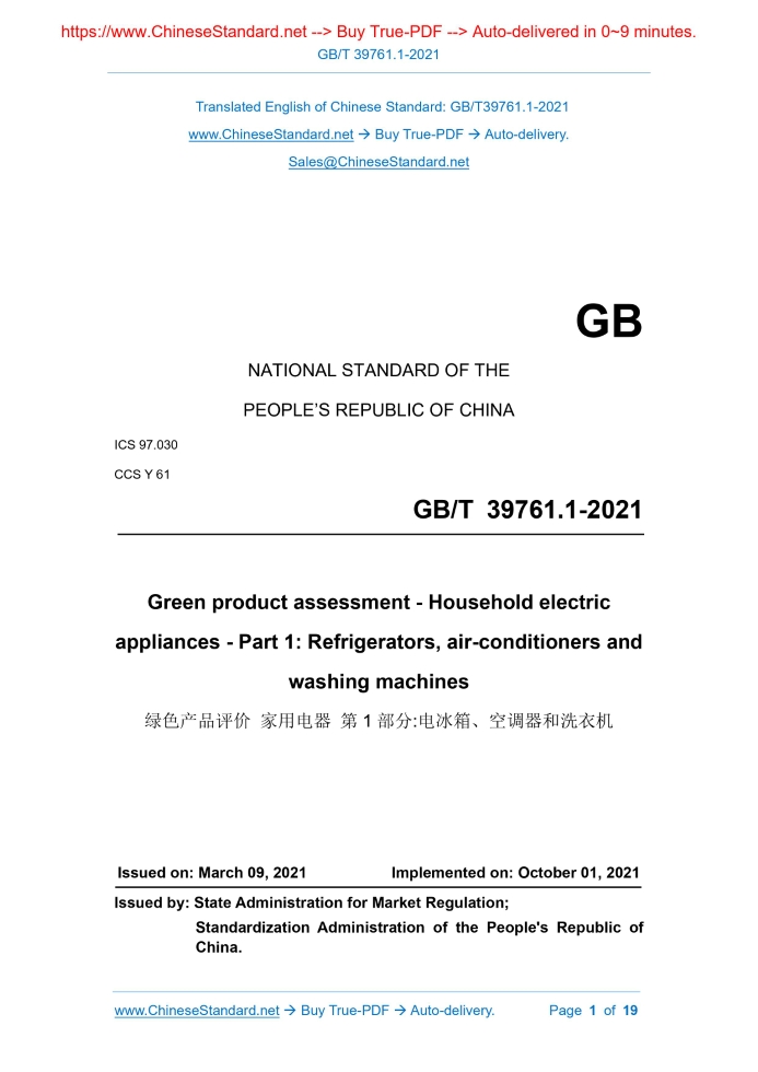 GB/T 39761.1-2021: Green product assessment - Household electric appliances - Part 1: Refrigerators, air-conditioners and washing machines Delivery: 9 seconds. True-PDF full-copy in English & invoice will be downloaded + auto-delivered via email. See step-by-step procedure Status: Valid