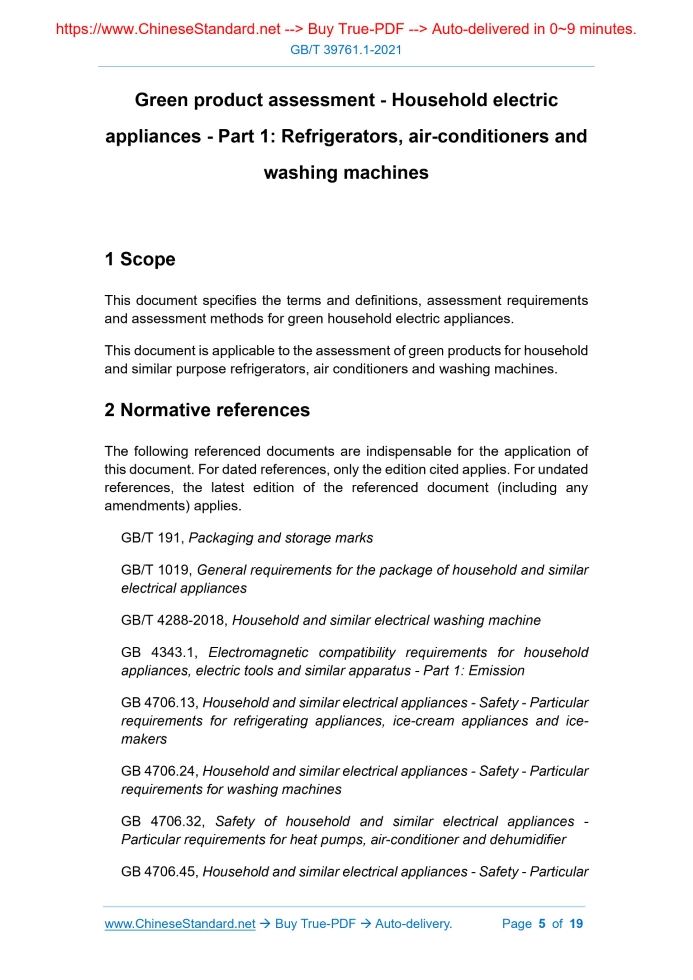 Similar standardsGB/T 39761.1-2021: Green product assessment - Household electric appliances - Part 1: Refrigerators, air-conditioners and washing machines---This is an excerpt. Full copy of true-PDF in English version (including equations, symbols, images, flow-chart, tables, and figures etc.), auto-downloaded/delivered in 9 seconds, can be purchased online: https://www.ChineseStandard.net/PDF.aspx/GBT39761.1-2021 GB NATIONAL STANDARD OF THE PEOPLE’S REPUBLIC OF CHINA ICS 97.030 CCS Y 61 Green product assessment - Household electric appliances - Part 1: Refrigerators, air-conditioners and washing machines ISSUED ON: MARCH 09, 2021 IMPLEMENTED ON: OCTOBER 01, 2021 Issued by: State Administration for Market Regulation; Standardization Administration of the People's Republic of China. Table of ContentsForeword ... 3 Introduction ... 4 1 Scope ... 5 2 Normative references ... 5 3 Terms and definitions ... 7 4 Assessment requirements ... 8 5 Assessment methods ... 15 Annex A (normative) Green assessment index tests and calculation methods ... 16 Green product assessment - Household electric appliances - Part 1: Refrigerators, air-conditioners and washing machines1 ScopeThis document specifies the terms and definitions, assessment requirements and assessment methods for green household electric appliances. This document is applicable to the assessment of green products for household and similar purpose refrigerators, air conditioners and washing machines.2 Normative referencesThe following referenced documents are indispensable for the application of this document. For dated references, only the edition cited applies. For undated references, the latest edition of the referenced document (including any amendments) applies. GB/T 191, Packaging and storage marks GB/T 1019, General requirements for the package of household and similar electrical appliances GB/T 4288-2018, Household and similar electrical washing machine GB 4343.1, Electromagnetic compatibility requirements for household appliances, electric tools and similar apparatus - Part 1: Emission GB 4706.13, Household and similar electrical appliances - Safety - Particular requirements for refrigerating appliances, ice-cream appliances and ice- makers GB 4706.24, Household and similar electrical appliances - Safety - Particular requirements for washing machines GB 4706.32, Safety of household and similar electrical appliances - Particular requirements for heat pumps, air-conditioner and dehumidifier GB 4706.45, Household and similar electrical appliances - Safety - Particular GB/T 31268, Restricting excessive packaging for commodity - General rule GB/T 32355.1-2015, Assessment values of recyclability rate for electrical and electronic products - Part 1: Room air conditioners and household refrigerators GB/T 32355.2-2015, Assessment values of recyclability rate for electrical and electronic products - Part 2: Washing machines, television sets and computers GB/T 33635, Green manufacturing - Green supply chain management in manufacturing enterprises - Guideline GB/T 33761-2017, General principles for green product assessment GB/T 35758-2017, Household electrical appliances - Measurement of standby power JB/T 5054.8, Drawing and design document of product - Management means of common part QB/T 4984, The limits and test methods of substances migrated from household and similar electrical appliances3 Terms and definitionsFor the purposes of this document, the terms and definitions defined in GB/T 4288-2018, GB/T 7725-2004, GB/T 8059-2016, GB/T 33761-2017 as well as the followings apply. 3.1 green household electric appliances high-quality household electric appliances that in the whole life cycle, meet the requirements of environmental protection, are harmless or minimally harmful to the ecological environment and human health, and consume less resources and energy NOTE 1: The whole life cycle includes the various stages of the product's raw material procurement, production, transportation, sales, use, recycling and scrap. NOTE 2: Hereinafter referred to as "green appliances". 3.2 reference value of assessment indicator the limit value of the index set for evaluating green household electric appliances (3.1) enterprise shall put forward relevant quality, environment, energy and safety management requirements for the main raw material suppliers, production partners, and related service parties of the product. 4.1.1.4 The production enterprise shall carry out product green design work in accordance with the relevant requirements of GB/T 24256. While considering environmental requirements, the design work shall consider the durability, reliability, maintainability, reusability, remanufacturing, modularization, intelligence, and easy disassembly (separation) and easy recycling of components that have an adverse effect on the environment throughout the product life cycle. 4.1.1.5 The production enterprise shall adopt advanced technology and technology, instead of the technology, technique, equipment and related materials restricted, eliminated or prohibited by the relevant departments of the state and local government. The following are examples that meet the requirements of this article (but not limited to the following situations): - In the production process of the product, substances such as hydrochlorofluorocarbon, 1,1,1-trichloroethane, trichloroethylene, dichloroethylene, methylene chloride, chloroform, carbon tetrachloride, bromopropane, etc. shall not be used as a cleaning solvent; - Lead-free soldering technology shall be used for soldering in the production process of electronic circuit boards and similar products; - Products that need to be charged with refrigerants or foaming agents during the production process shall not use refrigerants and foaming agents with an ozone depleting potential (ODP) greater than zero; - Products that need to be charged with refrigerant during the production process shall be equipped with and effectively u