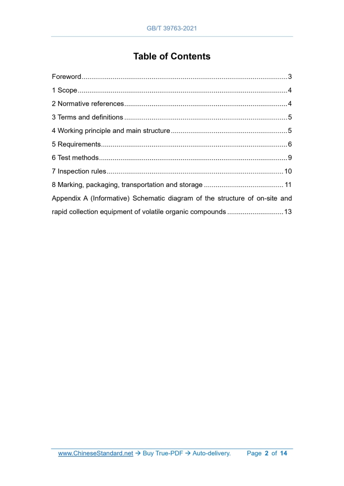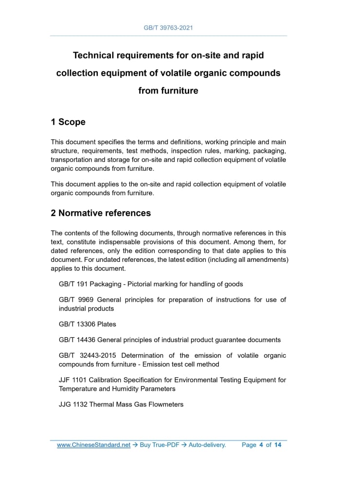 Similar standardsGB/T 39763-2021: Technical requirements for on-site and rapid collection equipment of volatile organic compounds from furniture---This is an excerpt. Full copy of true-PDF in English version (including equations, symbols, images, flow-chart, tables, and figures etc.), auto-downloaded/delivered in 9 seconds, can be purchased online: https://www.ChineseStandard.net/PDF.aspx/GBT39763-2021 GB NATIONAL STANDARD OF THE PEOPLE’S REPUBLIC OF CHINA ICS 97.140 CCS Y 80 Technical requirements for on-site and rapid collection equipment of volatile organic compounds from furniture ISSUED ON: MARCH 09, 2021 IMPLEMENTED ON: OCTOBER 01, 2021 Issued by: State Administration for Market Regulation; Standardization Administration of the PRC. Table of ContentsForeword ... 3 1 Scope ... 4 2 Normative references ... 4 3 Terms and definitions ... 5 4 Working principle and main structure ... 5 5 Requirements ... 6 6 Test methods ... 9 7 Inspection rules ... 10 8 Marking, packaging, transportation and storage ... 11 Appendix A (Informative) Schematic diagram of the structure of on-site and rapid collection equipment of volatile organic compounds ... 13 Technical requirements for on-site and rapid collection equipment of volatile organic compounds from furniture1 ScopeThis document specifies the terms and definitions, working principle and main structure, requirements, test methods, inspection rules, marking, packaging, transportation and storage for on-site and rapid collection equipment of volatile organic compounds from furniture. This document applies to the on-site and rapid collection equipment of volatile organic compounds from furniture.2 Normative referencesThe contents of the following documents, through normative references in this text, constitute indispensable provisions of this document. Among them, for dated references, only the edition corresponding to that date applies to this document. For undated references, the latest edition (including all amendments) applies to this document. GB/T 191 Packaging - Pictorial marking for handling of goods GB/T 9969 General principles for preparation of instructions for use of industrial products GB/T 13306 Plates GB/T 14436 General principles of industrial product guarantee documents GB/T 32443-2015 Determination of the emission of volatile organic compounds from furniture - Emission test cell method JJF 1101 Calibration Specification for Environmental Testing Equipment for Temperature and Humidity Parameters JJG 1132 Thermal Mass Gas Flowmeters The main structure of the on-site and rapid collection equipment of volatile organic compounds from wooden furniture includes an intake system and a pressing collector. The structure diagram is shown in Figure A.1 in Appendix A. The intake system includes a high-purity gas supply device (cylinder or gas generator, etc.), a thermostat, a flowmeter and a gas pipe. The pressing collector includes a collector and a sucker; is provided with an intake port, an exhaust port, and a gas sampling port. The main structure of the on-site and rapid collection equipment for volatile organic compounds from upholstered furniture includes an an intake system, a counterweight collector and a circulatory system. The structure diagram is shown in Figure A.2. The intake system includes a high-purity gas supply device (cylinder or gas generator, etc.), a thermostat, a flowmeter and a gas pipe. The counterweight collector includes a collector and a counterweight; is provided with an intake port (supply port), a gas sampling port (exhaust port), and a circulating gas interface. The circulatory system consists of a gas pipe, a flowmeter, a mixing filter pipe and a gas pump. 4.3 Working process Place the collector on the surface of the furniture; press the collector tightly. The intake system passes a certain temperature and volume of high-purity gas into the collector for replacement. After the replacement, keep the load for a certain time. The gas in the collector is uniformly mixed with the volatilized gas on the surface of the furniture, to form the gas to be measured.5 Requirements5.1 Materials The collector, pipelines, and gas flow parts shall be made of materials such as glass, stainless steel, polytetrafluoroethylene, which do not absorb and release volatile organic compounds. 5.2 Air tightness of equipment The flow rate of the exhaust port shall not be less than 95% of the flow rate of the intake port. 5.3 Intake system and circulatory system 5.3.1 Intake requirements It shall use high-purity gas which does not react with volatile organic compounds. High-purity nitrogen with a purity of not less than 99.999% can be 5.7 Recovery rate The average recovery rate of toluene and n-dodecane shall be greater than 80%.6 Test methods6.1 Test conditions The test temperature and relative humidity are set according to the furniture product standards. If the product standards do not stipulate, it should be carried out under the conditions of indoor temperature of (23±2)°C and relative humidity of (45±5)%. And it shall be indicated in the inspection report. Before the test, the equipment shall be cleaned. The gas pipe and connecting parts shall be checked, to ensure that the equipment can operate normally to meet the test requirements. 6.2 Materials Use the method of visual inspection, to check the consistency of the material and the product’s instructions for use. Through the background concentration determination (see 6.9), verify the performance that the material does not absorb and does not release volatile organic compounds. 6.3 Air tightness of equipment It shall be carried out according to the provisions of 8.4 in GB/T 32443-2015. 6.4 Intake requirements Check whether the gas identification on the high-purity gas supply device indicates a high-purity gas. 6.5 Flowmeter It shall be carried out according to the provisions of JJG 1132. 6.6 Thermostat It shall be carried out according to the provisions of JJF 1101. 6.7 Pressi