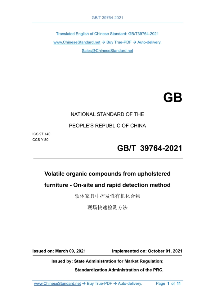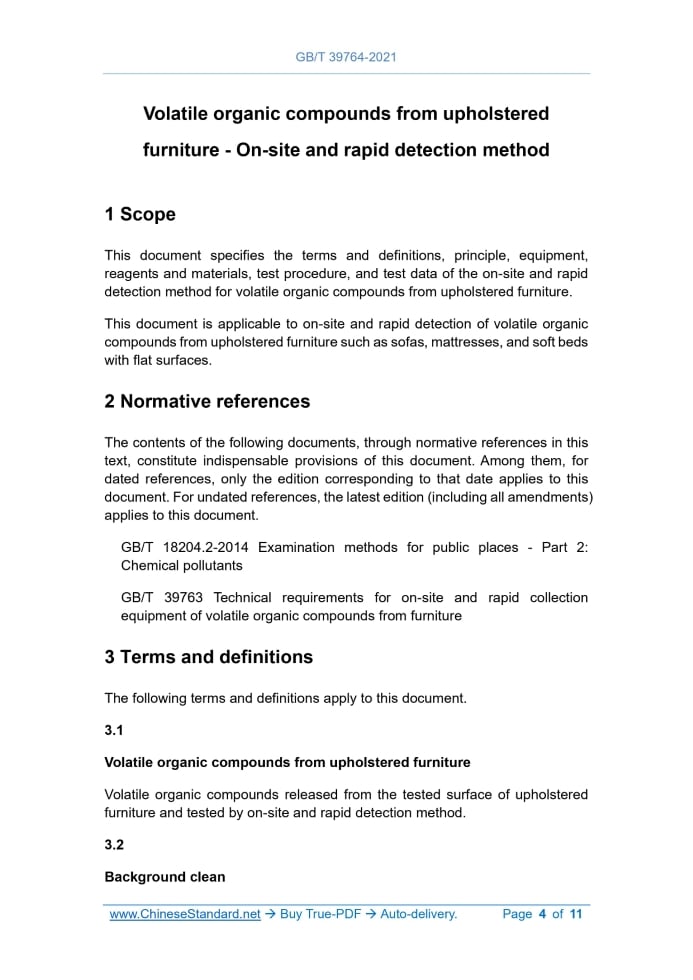 GB/T 39764-2021: Volatile organic compounds from upholstered furniture - On-site and rapid detection method Delivery: 9 seconds. True-PDF full-copy in English & invoice will be downloaded + auto-delivered via email. See step-by-step procedure Status: Valid