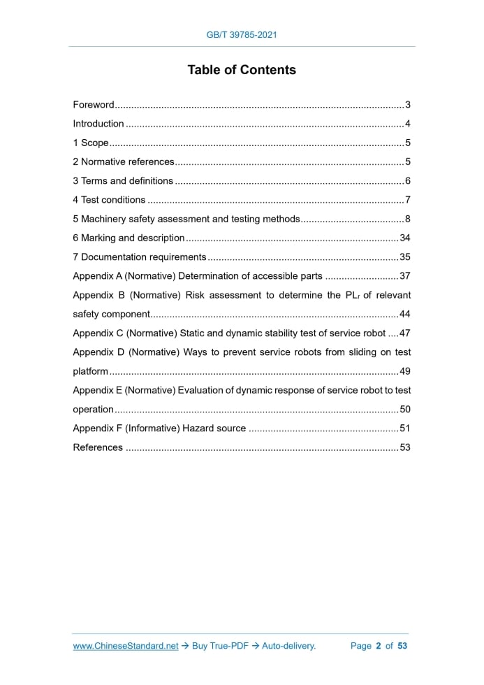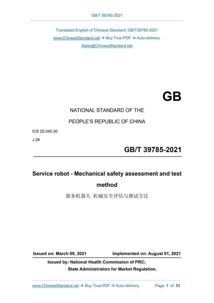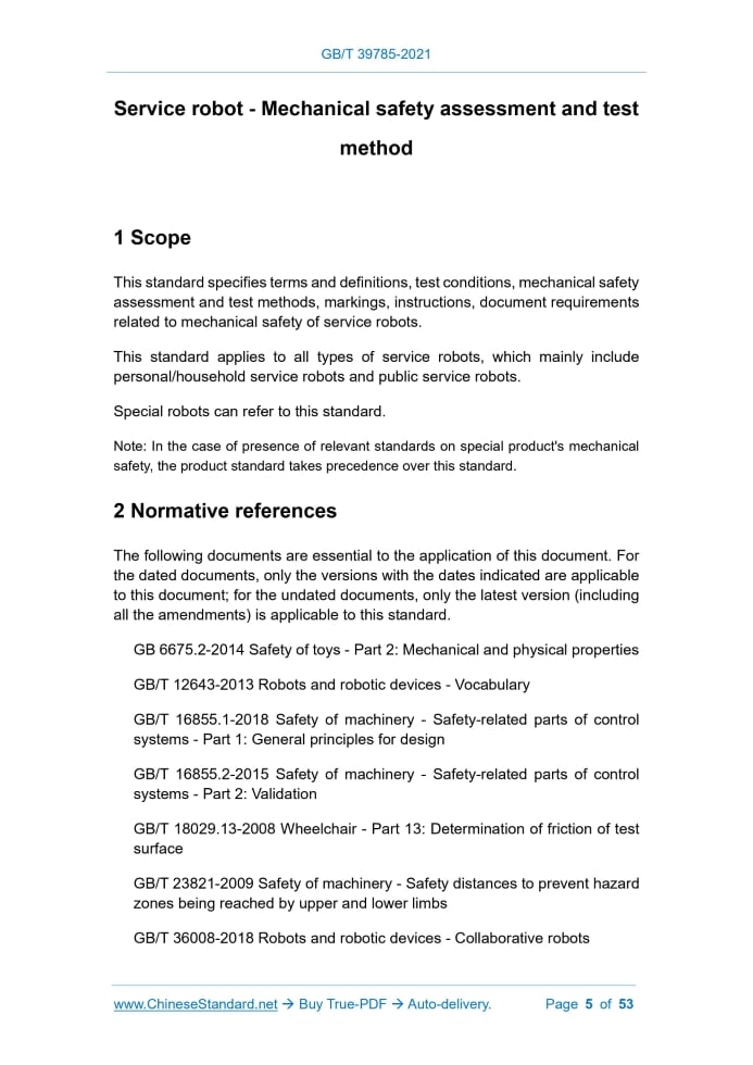 Similar standardsGB/T 39785-2021: Service robot - Mechanical safety assessment and test method---This is an excerpt. Full copy of true-PDF in English version (including equations, symbols, images, flow-chart, tables, and figures etc.), auto-downloaded/delivered in 9 seconds, can be purchased online: https://www.ChineseStandard.net/PDF.aspx/GBT39785-2021GB NATIONAL STANDARD OF THE PEOPLE’S REPUBLIC OF CHINA ICS 25.040.30 J 28 Service robot - Mechanical safety assessment and test method Issued on. MARCH 09, 2021 Implemented on. AUGUST 01, 2021 Issued by. National Health Commission of PRC; State Administration for Market Regulation. Table of ContentsForeword... 3 Introduction... 4 1 Scope... 5 2 Normative references... 5 3 Terms and definitions... 6 4 Test conditions... 7 5 Machinery safety assessment and testing methods... 8 6 Marking and description... 34 7 Documentation requirements... 35 Appendix A (Normative) Determination of accessible parts... 37 Appendix B (Normative) Risk assessment to determine the PLr of relevant safety component... 44 Appendix C (Normative) Static and dynamic stability test of service robot... 47 Appendix D (Normative) Ways to prevent service robots from sliding on test platform... 49 Appendix E (Normative) Evaluation of dynamic response of service robot to test operation... 50 Appendix F (Informative) Hazard source... 51 References... 531 ScopeThis standard specifies terms and definitions, test conditions, mechanical safety assessment and test methods, markings, instructions, document requirements related to mechanical safety of service robots. This standard applies to all types of service robots, which mainly include personal/household service robots and public service robots. Special robots can refer to this standard. Note. In the case of presence of relevant standards on special product's mechanical safety, the product standard takes precedence over this standard.2 Normative referencesThe following documents are essential to the application of this document. For the dated documents, only the versions with the dates indicated are applicable to this document; for the undated documents, only the latest version (including all the amendments) is applicable to this standard. GB 6675.2-2014 Safety of toys - Part 2.Mechanical and physical properties GB/T 12643-2013 Robots and robotic devices - Vocabulary GB/T 16855.1-2018 Safety of machinery - Safety-related parts of control systems - Part 1.General principles for design GB/T 16855.2-2015 Safety of machinery - Safety-related parts of control systems - Part 2.Validation GB/T 18029.13-2008 Wheelchair - Part 13.Determination of friction of test surface GB/T 23821-2009 Safety of machinery - Safety distances to prevent hazard zones being reached by upper and lower limbs GB/T 36008-2018 Robots and robotic devices - Collaborative robots GB/T 36530-2018 Robots and robotic devices - Safety requirements for personal care robots3 Terms and definitionsThe terms and definitions as defined in GB/T 12643-2013, as well as the following terms and definitions apply to this document. For ease of use, some terms and definitions in GB/T 12643-2013 and GB/T 37283-2019 are listed repeatedly below. 3.1 Service robot Robots that, in addition to industrial automation applications, can accomplish useful tasks for humans or equipment. 3.2 Personal/household service robot A service robot, that is used in a home environment or similar environment, to meet the needs of users' lives. 3.3 Public service robot Service robots, which are used for public or commercial tasks. Examples. hotel service robots, banking service robots, venue service robots, catering service robots.4 Test conditions4.1 Test sample Service robots mainly include personal/household service robots AND public service robots. 4.2 Working conditions for test 4.2.1 Operating conditions The installed software shall not be modified or changed during a set of tests. The safety facilities on the test site shall be in normal working condition. 4.2.2 Environmental conditions Unless otherwise specified, the tests are carried out under the following conditions. 4.2.3 Lighting conditions Unless otherwise specified, the test shall be carried out under the following lighting conditions. 4.2.4 Ground conditions All tests in this standard shall be carried out under the ground conditions, which are specified by the manufacturer. If the manufacturer specifies multiple ground materials, the tests shall be carried out under different conditions.5 Machinery safety assessment and testing methods5.1 Inspection method The following (but not limited to) inspection methods can meet the requirements of this standard. 5.2 Verification of structural design 5.2.1 Verification of edge and corner 5.2.1.1 Test procedure If the function of the service robot requires touchable edges and corners, whether they are qualification or not, is determined through actual tests. If the function of the service robot does not require touchable edges and corners, whether they are qualification or not, is determined through the related tests in Appendix A. 5.2.1.2 Qualification criteria If the function of the service robot requires touchable edges and corners, THEN. 5.2.2 Verification of handle and manual control device 5.2.2.1 Test procedure Through visual inspection, actual test and the following axial force, which is applied to the handle, knob or joystick, for 1 min, to try to remove these parts to, thereby determining whether it is qualified. 5.2.3 Gap 5.2.3.1 Test procedure Select the test method according to the product structure, as shown in Appendix A. 5.2.4 Position limit 5.2.4.1 Test procedure Through visual inspection and measurement, the service robot runs to the maximum or minimum stroke position, at rated load and maximum speed, without any braking measures. 5.2.5 Evacuate after failure 5.3 Verification of protection of dangerous moving parts 5.3.1 Test procedure The accessibility of moving parts is checked by v