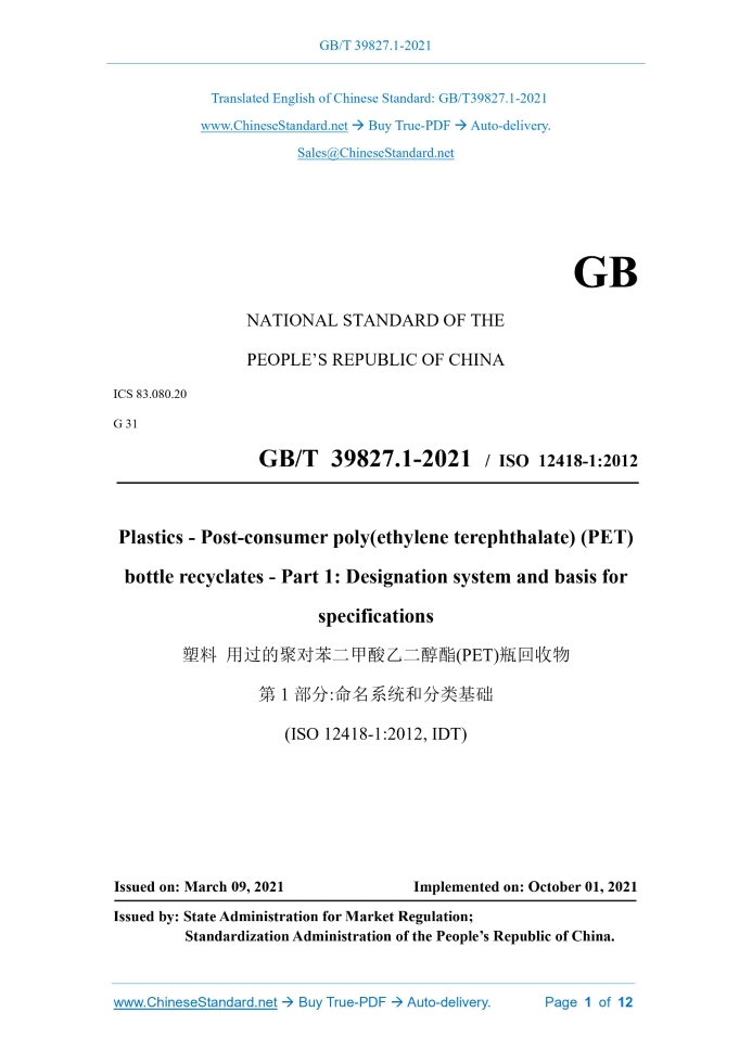 GB/T 39827.1-2021: Plastics - Post-consumer poly(ethylene terephthalate) (PET) bottle recyclates - Part 1: Designation system and basis for specifications Delivery: 9 seconds. True-PDF full-copy in English & invoice will be downloaded + auto-delivered via email. See step-by-step procedure Status: Valid