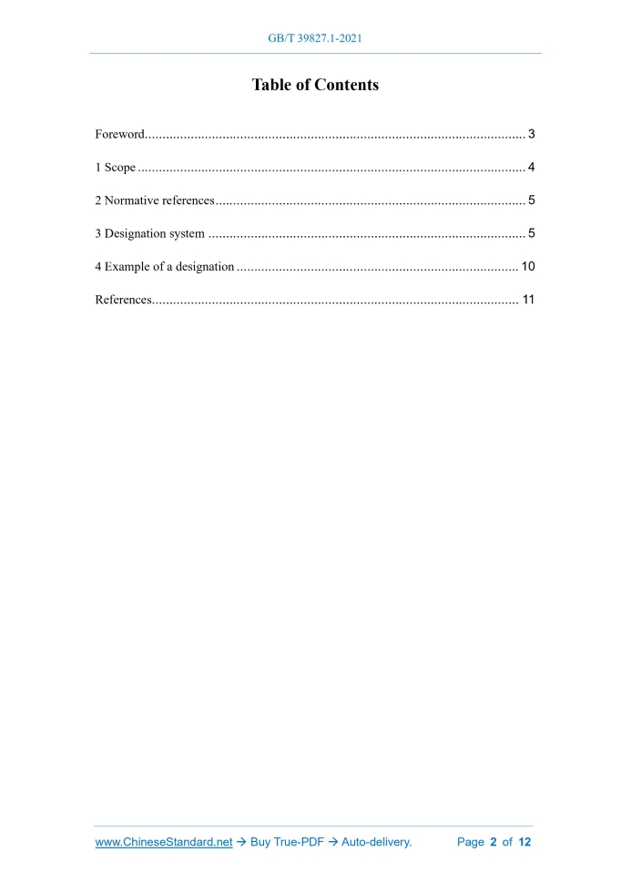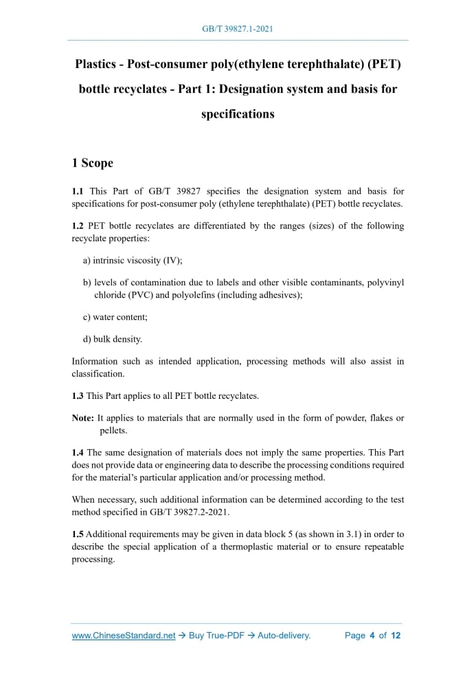 Similar standardsGB/T 39827.1-2021: Plastics - Post-consumer poly(ethylene terephthalate) (PET) bottle recyclates - Part 1: Designation system and basis for specifications---This is an excerpt. Full copy of true-PDF in English version (including equations, symbols, images, flow-chart, tables, and figures etc.), auto-downloaded/delivered in 9 seconds, can be purchased online: https://www.ChineseStandard.net/PDF.aspx/GBT39827.1-2021 NATIONAL STANDARD OF THE PEOPLE’S REPUBLIC OF CHINA ICS 83.080.20 G 31 GB/T 39827.1-2021 / ISO 12418-1:2012 Plastics - Post-consumer poly(ethylene terephthalate) (PET) bottle recyclates - Part 1: Designation system and basis for specifications (ISO 12418-1:2012, IDT) ISSUED ON: MARCH 09, 2021 IMPLEMENTED ON: OCTOBER 01, 2021 Issued by: State Administration for Market Regulation; Standardization Administration of the People’s Republic of China. Table of ContentsForeword ... 3 1 Scope ... 4 2 Normative references ... 5 3 Designation system ... 5 4 Example of a designation ... 10 References ... 11 Plastics - Post-consumer poly(ethylene terephthalate) (PET) bottle recyclates - Part 1: Designation system and basis for specifications1 Scope1.1 This Part of GB/T 39827 specifies the designation system and basis for specifications for post-consumer poly (ethylene terephthalate) (PET) bottle recyclates. 1.2 PET bottle recyclates are differentiated by the ranges (sizes) of the following recyclate properties: a) intrinsic viscosity (IV); b) levels of contamination due to labels and other visible contaminants, polyvinyl chloride (PVC) and polyolefins (including adhesives); c) water content; d) bulk density. Information such as intended application, processing methods will also assist in classification. 1.3 This Part applies to all PET bottle recyclates. Note: It applies to materials that are normally used in the form of powder, flakes or pellets. 1.4 The same designation of materials does not imply the same properties. This Part does not provide data or engineering data to describe the processing conditions required for the material’s particular application and/or processing method. When necessary, such additional information can be determined according to the test method specified in GB/T 39827.2-2021. 1.5 Additional requirements may be given in data block 5 (as shown in 3.1) in order to describe the special application of a thermoplastic material or to ensure repeatable processing. -- Data block 3: Position 1: Intended use and/or processing method information (see 3.4). Position 2: Food packaging information (see 3.4). Position 3: Whether colored or not (see 3.4). -- Data block 4: Designatory properties (see 3.5). -- Data block 5: Additional information added for classification purposes. -- The first character of data block 1 shall be a hyphen; the data blocks shall be separated from each other by a comma. The data block, if not used, shall be separated by two commas (,,). 3.2 Data block 1 3.2.1 General In this data block, poly(ethylene terephthalate) is identified by the symbol “PET” after the hyphen in accordance with ISO 1043-1. Then, in position 2 to position 5 (see 3.2.2 ~ 3.2.5), recycling method, product form and other information are given; the letter code and number code used are shown in Table 1. 3.2.2 Recycling method In position 2 of this data block, the recycling method is represented by the letter code in parentheses, as follows: -- (MRG), mechanical recycling as defined in ISO 15270; -- (MRA), mechanical recycling, plus alkali treatment; -- (MRP), mechanical recycling, plus treatment method other than alkali treatment, such as: solid-phase polymerization or vacuum evaporation. 3.2.3 Product form In position 3 of this data block, the form of the material is represented by F, P, or W. 3.2.4 Size of flakes or pellets in the product In position 4 of this data block, the size of flakes or pellets in the product is represented by S, M or L. 3.2.5 Filter aperture ......Source: Above contents are excerpted from the full-copy PDF -- translated/reviewed by: www.ChineseStandard.net / Wayne Zheng et al. Tips & Frequently Asked Questions:Question 1: How long will the true-PDF of English version of GB/T 39827.1-2021 be delivered?Answer: The full copy PDF of English version of GB/T 39827.1-2021 can be downloaded in 9 seconds, and it will also be emailed to you in 9 seconds (double mechanisms to ensure the delivery reliably), with PDF-invoice.Question 2: Can I share the purchased PDF of GB/T 39827.1-2021_English with my colleagues?Answer: Yes. The purchased PDF of GB/T 39827.1-2021_English will be deemed to be sold to your employer/organization who actually paid for it, including your colleagues and your employer's intranet.Question 3: Does the price include tax/VAT?Answer: Yes. Our tax invoice, downloaded/delivered in 9 seconds, includes all tax/VAT and complies with 100+ countries' tax regulations (tax exempted in 100+ countries) -- See Avoidance of Double Taxation Agreements (DTAs): List of DTAs signed between Singapore and 100+ countriesQuestion 4: Do you accept my currency other than USD?Answer: Yes. www.ChineseStandard.us -- GB/T 39827.1-2021 -- Click this link and select your country/currency to pay, the exact amount in your currency will be printed on the invoice. Full PDF will also be downloaded/emailed in 9 seconds.How to buy and download a true PDF of English version of GB/T 39827.1-2021?A step-by-step guide to download PDF of GB/T 39827.1-2021_EnglishStep 1: Visit website https://www.ChineseStandard.net (Pay in USD), or https://www.ChineseStandard.us (Pay in any currencies such as Euro, KRW, JPY, AUD).Step 2: Search keyword "GB/T 39827.1-2021". Step 3: Click "Add to Cart". If multiple PDFs are required, repeat steps 2 and 3 to add up to 12 PDFs to cart. Step 4: Select payment option (Via payment agents Stripe or PayPal). Step 5: Customize Tax Invoice -- Fill up your email etc. Step 6: Click "Checkout". Step 7: Make payment by credit card, PayPal, Goog