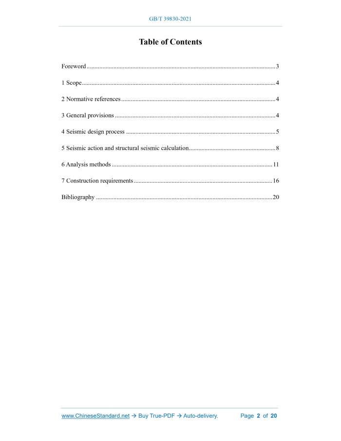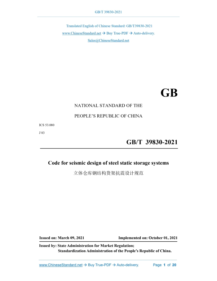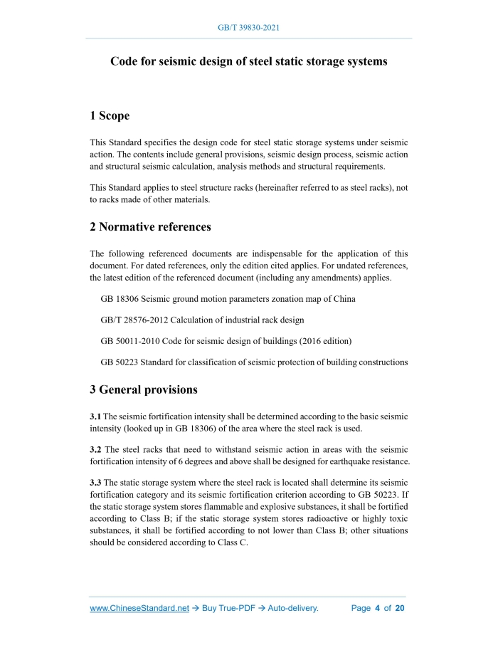 Similar standardsGB/T 39830-2021: Code for seismic design of steel static storage systems---This is an excerpt. Full copy of true-PDF in English version (including equations, symbols, images, flow-chart, tables, and figures etc.), auto-downloaded/delivered in 9 seconds, can be purchased online: https://www.ChineseStandard.net/PDF.aspx/GBT39830-2021GB NATIONAL STANDARD OF THE PEOPLE’S REPUBLIC OF CHINA ICS 53.080 J 83 Code for seismic design of steel static storage systems Issued on. MARCH 09, 2021 Implemented on. OCTOBER 01, 2021 Issued by. State Administration for Market Regulation; Standardization Administration of the People’s Republic of China. Table of ContentsForeword... 3 1 Scope... 4 2 Normative references... 4 3 General provisions... 4 4 Seismic design process... 5 5 Seismic action and structural seismic calculation... 8 6 Analysis methods... 11 7 Construction requirements... 16 Bibliography... 20ForewordThis Standard was drafted in accordance with the rules given in GB/T 1.1-2009. This Standard was proposed by China Machinery Industry Federation. This Standard shall be under the jurisdiction of National Technical Committee on Logistics and Warehousing Equipment of Standardization Administration of China (SAC/TC 499). Drafting organizations of this Standard. Shanghai Jingxing Logistics Equipment Engineering Co., Ltd., Beijing Materials Handling Research Institute Co., Ltd., Donghua University, Shenyang Sinsun Robot & Automation Co., Ltd., Nanjing Inform Storage Equipment (Group) Co., Ltd., Shenzhen KDY Modern Logistics Co., Ltd. Main drafters of this Standard. Li Hongliang, Lv Zhijun, Yang Guanghui, Lu Daming, Huang Xi, Zhou Xiaoxiao, Teng Xuhui, Zheng Fangyong, Chen Dixin, Yang Jianguo, Sun Zhijian, Jin Yueyue, Lu Wen. Code for seismic design of steel static storage systems1 ScopeThis Standard specifies the design code for steel static storage systems under seismic action. The contents include general provisions, seismic design process, seismic action and structural seismic calculation, analysis methods and structural requirements. This Standard applies to steel structure racks (hereinafter referred to as steel racks), not to racks made of other materials.2 Normative referencesThe following referenced documents are indispensable for the application of this document. For dated references, only the edition cited applies. For undated references, the latest edition of the referenced document (including any amendments) applies. GB 18306 Seismic ground motion parameters zonation map of China GB/T 28576-2012 Calculation of industrial rack design GB 50011-2010 Code for seismic design of buildings (2016 edition) GB 50223 Standard for classification of seismic protection of building constructions3 General provisions3.1 The seismic fortification intensity shall be determined according to the basic seismic intensity (looked up in GB 18306) of the area where the steel rack is used. 3.2 The steel racks that need to withstand seismic action in areas with the seismic fortification intensity of 6 degrees and above shall be designed for earthquake resistance. 3.4 This Standard is designed according to the internal force and deformation analysis under the action of frequent earthquakes. The structure and components can be considered according to the elastic working state.4 Seismic design process4.1 Basic parameters of seismic fortification 4.1.1 The site is divided into five categories. I0, I1, II, III, and IV, which shall be determined through site survey. 4.1.4 According to the amax calculated by 4.1.2, look up Table 3 to determine the maximum value of the horizontal seismic influence coefficient αmax. 4.1.5 The damping ratio η of steel rack structures should refer to the damping ratio of steel structures in 8.2.2 of GB 50011-2010.When the height is not more than 50 m, it can be taken as 0.04; when the height is greater than 50 m, it can be taken as 0.03. 4.1.6 The natural vibration period T of steel racks can be calculated according to theory or determined according to empirical formula (2). 4.1.7 For the calculation of the seismic influence coefficient α, it shall be determined according to 5.1.5 in GB 50011-2010. 4.3 Structural seismic calculation The structural seismic calculation shall be carried out according to the analysis model of 4.2 and the seismic analysis method specified in 6.1.The horizontal seismic action shall be determined by 5.2.For the structure shown in Figure 1, the vertical seismic action shall be calculated. 4.4 Determination of load and load combination The various permanent loads and variable loads for seismic design shall be determined according to 5.5.The load combination shall be determined according to 5.6.1.Data such as the internal force of members, the reaction force of upright foot and the node displacement shall be calculated according to the load combination.5 Seismic action and structural seismic calculation5.1 Description of seismic action The seismic action is generally described by response spectrum, which shall follow the design response spectrum of GB 50011-2010, and be represented in the form of seismic influence coefficient curve α, see 5.1.5 in GB 50011-2010. 5.5 Loads considered simultaneously with seismic action 5.5.1 Permanent load PDL Permanent loads of steel racks include. 5.5.3 Wind load PWL For static storage system such as rack-clad building, the wind load shall be considered, and the combined action shall be considered according to the relevant provisions of GB 50011-2010. 5.6 Design and check of bearing capacity limit state 5.6.1 Load combination When calculating the horizontal seismic action, take the most unfavorable load combination, and determine the design value Pmax in the following two cases. 5.6.2 Gravity second order analysis The seismic analysis shall consider the influence of the gravity second order, and refer to the relevant requirements in 5.1.6 of GB 50017-2017. 5.6.3 Sectional seismic check Under the load combination