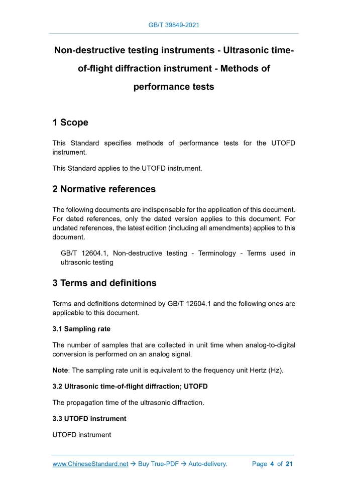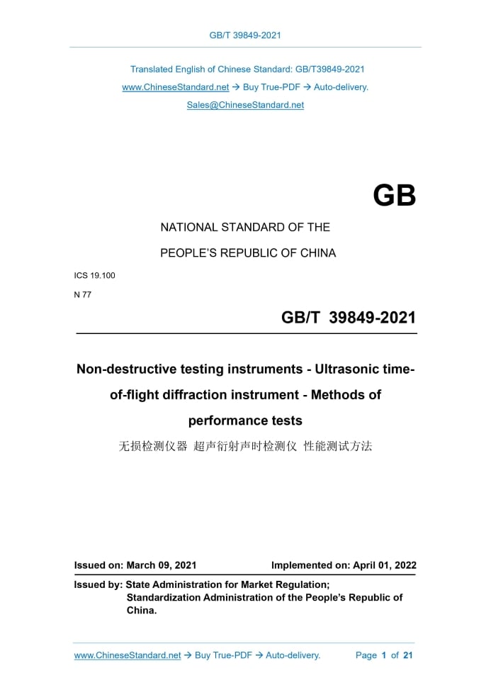 GB/T 39849-2021: Non-destructive testing instruments - Ultrasonic time-of-flight diffraction instrument - Methods of performance tests Delivery: 9 seconds. True-PDF full-copy in English & invoice will be downloaded + auto-delivered via email. See step-by-step procedure Status: Valid