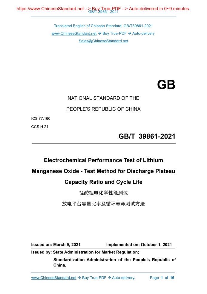 GB/T 39861-2021: Electrochemical Performance Test of Lithium Manganese Oxide - Test Method for Discharge Plateau Capacity Ratio and Cycle Life Delivery: 9 seconds. True-PDF full-copy in English & invoice will be downloaded + auto-delivered via email. See step-by-step procedure Status: Valid