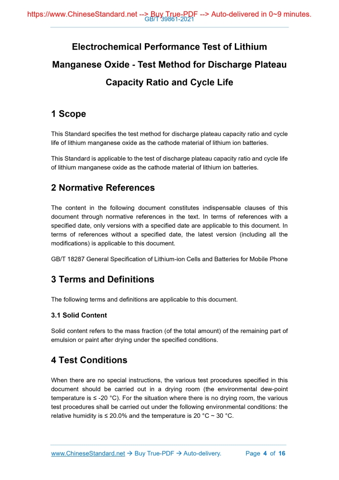 Similar standardsGB/T 39861-2021: Electrochemical Performance Test of Lithium Manganese Oxide - Test Method for Discharge Plateau Capacity Ratio and Cycle Life---This is an excerpt. Full copy of true-PDF in English version (including equations, symbols, images, flow-chart, tables, and figures etc.), auto-downloaded/delivered in 9 seconds, can be purchased online: https://www.ChineseStandard.net/PDF.aspx/GBT39861-2021 GB NATIONAL STANDARD OF THE PEOPLE’S REPUBLIC OF CHINA ICS 77.160 CCS H 21 Electrochemical Performance Test of Lithium Manganese Oxide - Test Method for Discharge Plateau Capacity Ratio and Cycle Life ISSUED ON: MARCH 9, 2021 IMPLEMENTED ON: OCTOBER 1, 2021 Issued by: State Administration for Market Regulation; Standardization Administration of the People’s Republic of China. Table of ContentsForeword ... 3 1 Scope ... 4 2 Normative References ... 4 3 Terms and Definitions ... 4 4 Test Conditions ... 4 5 Reagents or Materials ... 5 6 Instruments and Equipment ... 6 7 Test Procedures ... 7 8 Test Data Processing ... 15 9 Test Report ... 16 Electrochemical Performance Test of Lithium Manganese Oxide - Test Method for Discharge Plateau Capacity Ratio and Cycle Life1 ScopeThis Standard specifies the test method for discharge plateau capacity ratio and cycle life of lithium manganese oxide as the cathode material of lithium ion batteries. This Standard is applicable to the test of discharge plateau capacity ratio and cycle life of lithium manganese oxide as the cathode material of lithium ion batteries.2 Normative ReferencesThe content in the following document constitutes indispensable clauses of this document through normative references in the text. In terms of references with a specified date, only versions with a specified date are applicable to this document. In terms of references without a specified date, the latest version (including all the modifications) is applicable to this document. GB/T 18287 General Specification of Lithium-ion Cells and Batteries for Mobile Phone3 Terms and DefinitionsThe following terms and definitions are applicable to this document. 3.1 Solid Content Solid content refers to the mass fraction (of the total amount) of the remaining part of emulsion or paint after drying under the specified conditions.4 Test ConditionsWhen there are no special instructions, the various test procedures specified in this document should be carried out in a drying room (the environmental dew-point temperature is ≤ -20 °C). For the situation where there is no drying room, the various test procedures shall be carried out under the following environmental conditions: the relative humidity is ≤ 20.0% and the temperature is 20 °C ~ 30 °C. 160 μm; the thickness of the aluminum foil coated on the surface of the aluminum- plastic film is: 30 μm ~ 40 μm. 5.17 Insulating glue: with a length of 53.0 mm ± 1.0 mm. 5.18 Nitrogen: purity (volume fraction) ≥ 99.9%. 5.19 Electrolyte for lithium ion batteries: composed of a solution (with a concentration of 1 mol/L) of lithium hexafluorophosphate (LiPF6) dissolved in an organic solvent (the volume ratio of ethylene carbonate EC, dimethyl carbonate DMC, ethyl methyl carbonate EMC is 1 : 1 : 1); moisture content ≤ 0.0015%; free acid (HF) ≤ 0.003%; density: 1.23 g/cm3 ± 0.02 g/cm3; chroma ≤ 50 Hazen.6 Instruments and Equipment6.1 Electronic balance: with a measuring range of 3,000 g and a division value of 0.01 g. 6.2 Electronic balance: with a measuring range of 100 g and a division value of 0.0001 g. 6.3 Drying oven. 6.4 Desiccator. 6.5 Sanding machine. 6.6 Planetary stirrer. 6.7 Coating machine: the length of drying tunnel is > 2.0 m. 6.8 Vacuum oven. 6.9 Cutting machine. 6.10 Banister brush. 6.11 Adjustable slitting machine. 6.12 Sheet-punching machine: the mold is a square with a side length of 10 cm or a circle with a diameter of 10 cm. 6.13 Desktop digital thickness gauge: with a resolution of 1 μm. 6.14 Roller machine: exclusive to lithium batteries. 6.15 Ruler: stainless-steel; with a measuring range of 100 cm, accurate to 0.5 mm. Add the weighed NMP (5.4) into the stirring tank in the sanding machine (6.5); gradually add the weighed polyvinylidene fluoride (5.3) and perform dispersive stirring, until it is completely dissolved. Afterwards, add the weighed conductive agent (5.2) and perform dispersive stirring. After the dispersion is uniform, add the weighed lithium manganese oxide (5.1) and perform dispersive stirring, until the dispersion is uniform. 7.2.3 Coating Use the coating machine (6.7) to evenly coat the stirred cathode paste on both sides of the aluminum foil (5.5). The coating speed parameter of the coating machine (6.7) is set to 800 mm/min; the blast baking temperature is set to 130 °C. Control the single surface areal density within the range of 200 g/m2 ~ 230 g/m2, the thickness difference ≤ 3 μm and the areal density deviation of the front and back surfaces < 5.0 g/m2. After the coating is completed, transfer the preliminarily dried and winded cathode sheet to the vacuum oven (6.8) for secondary drying. The baking temperature is controlled at 110 °C ~ 120 °C; bake for 12 h; cool down under nitrogen (5.18) atmosphere. 7.2.4 Preparation Take the cathode sheet in 7.2.3, which is dried and reaches the requirements of being processed; use the sheet-punching machine (6.12) to punch out a circular or square cathode sheet with an area of Sc. Use the electronic balance (6.2) and the desktop digital thickness gauge (6.13) to perform mass measurement mc and thickness measurement dc on the punched cathode sheet. Use the sheet-punching machine (6.12) to punch out an aluminum foil substrate with an area of Sc. Use the electronic balance (6.2) and the desktop digital thickness gauge (6.13) to perform mass measurement mAl and thickness measurement dAl on the punched aluminum foil substrate. The compaction density c of the cathode sheet shall be calculated in accordance with Formula (1): Where, c