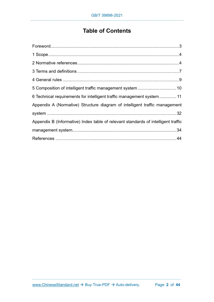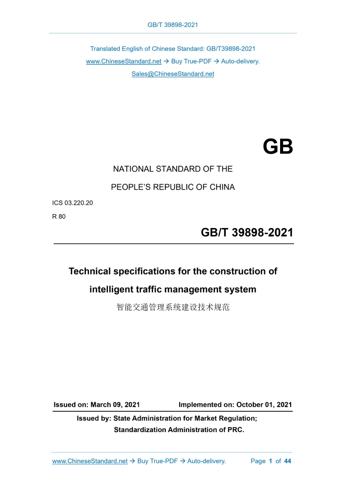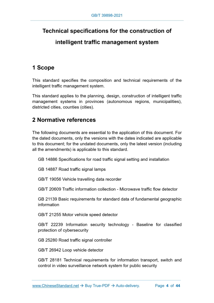 Similar standardsGB/T 39898-2021: Technical specifications for the construction of intelligent traffic management system---This is an excerpt. Full copy of true-PDF in English version (including equations, symbols, images, flow-chart, tables, and figures etc.), auto-downloaded/delivered in 9 seconds, can be purchased online: https://www.ChineseStandard.net/PDF.aspx/GBT39898-2021 GB NATIONAL STANDARD OF THE PEOPLE’S REPUBLIC OF CHINA ICS 03.220.20 R 80 Technical specifications for the construction of intelligent traffic management system ISSUED ON: MARCH 09, 2021 IMPLEMENTED ON: OCTOBER 01, 2021 Issued by: State Administration for Market Regulation; Standardization Administration of PRC. Table of ContentsForeword ... 3 1 Scope ... 4 2 Normative references ... 4 3 Terms and definitions ... 7 4 General rules ... 9 5 Composition of intelligent traffic management system ... 10 6 Technical requirements for intelligent traffic management system ... 11 Appendix A (Normative) Structure diagram of intelligent traffic management system ... 32 Appendix B (Informative) Index table of relevant standards of intelligent traffic management system ... 34 References ... 44 Technical specifications for the construction of intelligent traffic management system1 ScopeThis standard specifies the composition and technical requirements of the intelligent traffic management system. This standard applies to the planning, design, construction of intelligent traffic management systems in provinces (autonomous regions, municipalities), districted cities, counties (cities).2 Normative referencesThe following documents are essential to the application of this document. For the dated documents, only the versions with the dates indicated are applicable to this document; for the undated documents, only the latest version (including all the amendments) is applicable to this standard. GB 14886 Specifications for road traffic signal setting and installation GB 14887 Road traffic signal lamps GB/T 19056 Vehicle travelling data recorder GB/T 20609 Traffic information collection - Microwave traffic flow detector GB 21139 Basic requirements for standard data of fundamental geographic information GB/T 21255 Motor vehicle speed detector GB/T 22239 Information security technology - Baseline for classified protection of cybersecurity GB 25280 Road traffic signal controller GB/T 26942 Loop vehicle detector GB/T 28181 Technical requirements for information transport, switch and control in video surveillance network system for public security security GA/T 1403 Guidelines for intelligent traffic management system planning GA/T 1426 General technical specifications for automatic recording system for illegal parking of motor vehicles GA/T 1494 General technical specifications for pavement icing monitoring system JT/T 714 Road weather environment - The visibility meter JT/T 794 GNSS system for operating vehicles - Technical specification for vehicle terminals JT/T 809 GNSS system for operating vehicles - General specifications for data exchange between platforms JT/T 1032 Guiding device for highway traffic safety in fog weather GH [1987] No.78 Reply of the State Council on the Use of the "1985 National Elevation Benchmark"3 Terms and definitionsThe following terms and definitions apply to this document. 3.1 Intelligent traffic management system Public security traffic command system It is a system, which uses intelligent traffic technology and methods to manage road traffic; has the function of traffic command, traffic control, traffic law enforcement, traffic information service. 3.2 Integrated application platform An application software system, which integrates road traffic monitoring, decision-making, control, service. 3.3 Application support system of the sub-command center, the front-end supporting fundamental facilities. 3.7 Front end Equipment and related ancillary facilities, which are installed on roads and other places, for traffic control, traffic law enforcement, traffic information collection and release.4 General rules4.1 Classification of intelligent traffic management system The intelligent traffic management system is divided into two types: provincial (autonomous region) intelligent traffic management system AND urban intelligent traffic management system, according to the different central management authority and core tasks. The structure diagram is as shown in Appendix A. For expressways directly managed by municipalities, counties (cities) and provinces (autonomous regions), it should be constructed with reference to the urban intelligent traffic management systems. 4.2 General rules The construction rules of the intelligent traffic management system are as follows: a) The planning shall meet the requirements of GA/T 1403; b) The design shall meet the requirements of GA/T 515; c) The project construction process shall meet the requirements of GA/T 651; d) The front-end settings shall meet the requirements of GB 14886, GA/T 993, GA/T 1047, etc.; e) Front-end maintenance shall meet the requirements of GA/T 1043; f) For other construction content, please refer to the relevant standards in Appendix B. The construction rules of the traffic management data resource management system are as follows: a) It should use big data and cloud computing technology framework; b) It shall construct a unified and standardized basic hardware resource, that meets the requirements of data volume and computing power; c) There shall be standardized interfaces and interactive protocols, which are suitable for different systems; d) It shall adopt standard data format and exchange interface; e) Data shall be cleaned, repaired, classified, correlated, stored, etc., to ensure data specification and data quality; f) Classified preprocessing and storage of traffic management data resources, including structured data, unstructured data, semi-structured data; g) Unified planning of information resources and classified construction of various them