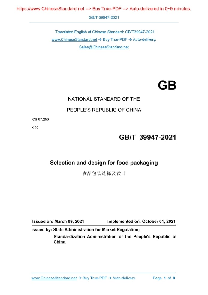 GB/T 39947-2021: Selection and design for food packaging Delivery: 9 seconds. True-PDF full-copy in English & invoice will be downloaded + auto-delivered via email. See step-by-step procedure Status: Valid
