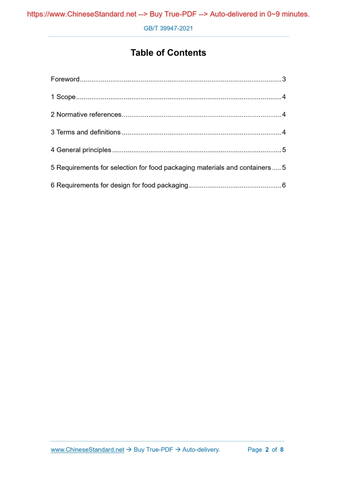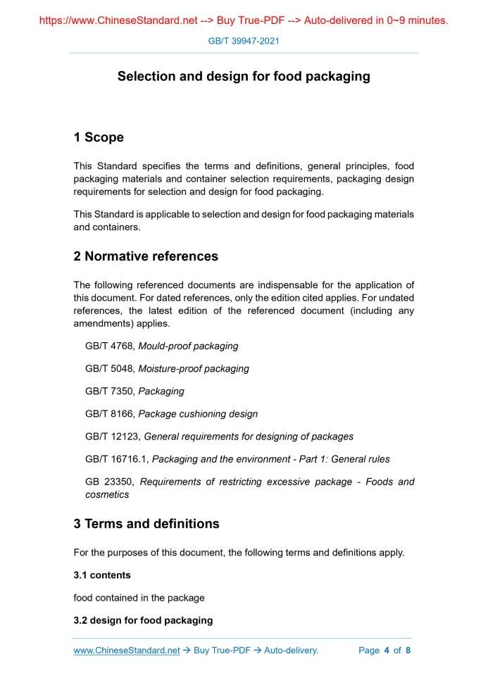 Similar standardsGB/T 39947-2021: Selection and design for food packaging---This is an excerpt. Full copy of true-PDF in English version (including equations, symbols, images, flow-chart, tables, and figures etc.), auto-downloaded/delivered in 9 seconds, can be purchased online: https://www.ChineseStandard.net/PDF.aspx/GBT39947-2021GB NATIONAL STANDARD OF THE PEOPLE’S REPUBLIC OF CHINA ICS 67.250 X 02 Selection and design for food packaging ISSUED ON: MARCH 09, 2021 IMPLEMENTED ON: OCTOBER 01, 2021 Issued by: State Administration for Market Regulation; Standardization Administration of the People's Republic of China. Table of ContentsForeword ... 3 1 Scope ... 4 2 Normative references ... 4 3 Terms and definitions ... 4 4 General principles ... 5 5 Requirements for selection for food packaging materials and containers ... 5 6 Requirements for design for food packaging ... 6 Selection and design for food packaging1 ScopeThis Standard specifies the terms and definitions, general principles, food packaging materials and container selection requirements, packaging design requirements for selection and design for food packaging. This Standard is applicable to selection and design for food packaging materials and containers.2 Normative referencesThe following referenced documents are indispensable for the application of this document. For dated references, only the edition cited applies. For undated references, the latest edition of the referenced document (including any amendments) applies. GB/T 4768, Mould-proof packaging GB/T 5048, Moisture-proof packaging GB/T 7350, Packaging GB/T 8166, Package cushioning design GB/T 12123, General requirements for designing of packages GB/T 16716.1, Packaging and the environment - Part 1: General rules GB 23350, Requirements of restricting excessive package - Foods and cosmetics3 Terms and definitionsFor the purposes of this document, the following terms and definitions apply. 3.1 contents food contained in the package 3.2 design for food packaging 6.2.1 Design for food packaging shall meet the protection requirements of the contents during production, storage, circulation. 6.2.2 It shall, according to factors such as food characteristics, forms, methods of use, sales targets, select packaging methods and packaging patterns such as bags, bottles, drums, vacuum packaging, and inflatable packaging. 6.2.3 Design for food packaging shall meet mechanical requirements. Reasonably protect against external shocks. Compressive strength, impact strength, drop strength shall meet the requirements of food production, storage, circulation and other processes. 6.2.4 Design for food packaging shall reduce the loss of contents during transportation, storage and sales. Consider factors such as the strength and brittleness of the contents. 6.2.5 Food anti-mold design shall meet the requirements of GB/T 4768. Food moisture-proof design shall meet the requirements of GB/T 5048. Food waterproof design shall meet the requirements of GB/T 7350. Food buffer packaging design shall meet the requirements of GB/T 8166. 6.3 Requirements for being economical 6.3.1 Design for food packaging shall adopt packaging methods and packaging patterns that facilitate the maximum use of food. 6.3.2 According to food consumption characteristics, food packaging can be used to store food in separate packaging, repeated opening. 6.3.3 Design for food packaging shall reduce the amount of stickiness on the food packaging after the food is eaten. 6.3.4 It shall select design for food packaging methods that extend the shelf life of food. 6.3.5 It shall, according to different food consumption rates, consider the per capita serving size and other factors for design for food packaging. 6.3.6 Design for food packaging can consider factors including consumer group, age, gender, location. 6.4 Requirements for environmental protection 6.4.1 Design for food packaging shall meet the requirements of GB 23350. 6.4.2 Under the premise of ensuring the volume and strength of food packaging, it shall save materials and reduce packaging volume and weight. 6.4.3 It shall, according to food production, storage, circulation, and consumption methods, including but not limited to factors such as saving transportation space and recycling materials, carry out design for food packaging. 6.4.4 Design for food packaging shall reduce the number of types of materials. The packaging that uses composite material structure shall be designed as a detachable structure. 6.4.5 Multi-purpose design for food packaging shall consider its reuse value. 6.4.6 Design for food packaging shall consider the treatment of food packaging waste and shall meet the requirements of GB/T 16716.1. 6.5 Requirements for convenience 6.5.1 Design for food packaging shall consider its convenience in the process of production, storage, circulation, consumption. 6.5.2 Design for food packaging shall conform to the principles of ergonomics and be convenient for consumers to carry, open. __________ END __________ ......Source: Above contents are excerpted from the full-copy PDF -- translated/reviewed by: www.ChineseStandard.net / Wayne Zheng et al. Tips & Frequently Asked Questions:Question 1: How long will the true-PDF of English version of GB/T 39947-2021 be delivered?Answer: The full copy PDF of English version of GB/T 39947-2021 can be downloaded in 9 seconds, and it will also be emailed to you in 9 seconds (double mechanisms to ensure the delivery reliably), with PDF-invoice.Question 2: Can I share the purchased PDF of GB/T 39947-2021_English with my colleagues?Answer: Yes. The purchased PDF of GB/T 39947-2021_English will be deemed to be sold to your employer/organization who actually paid for it, including your colleagues and your employer's intranet.Question 3: Does the price include tax/VAT?Answer: Yes. Our tax invoice, downloaded/delivered in 9 seconds, includes all tax/VAT and complies with 100+ countries' tax regulations (tax exempted in 100+ countri