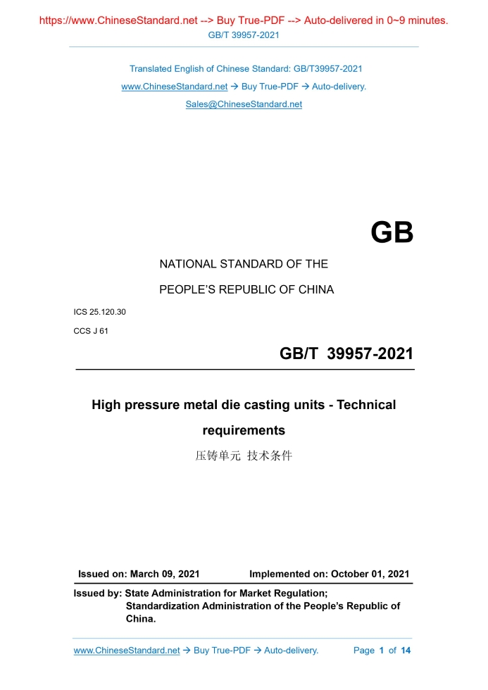 GB/T 39957-2021: High pressure metal die casting units - Technical requirements Delivery: 9 seconds. True-PDF full-copy in English & invoice will be downloaded + auto-delivered via email. See step-by-step procedure Status: Valid