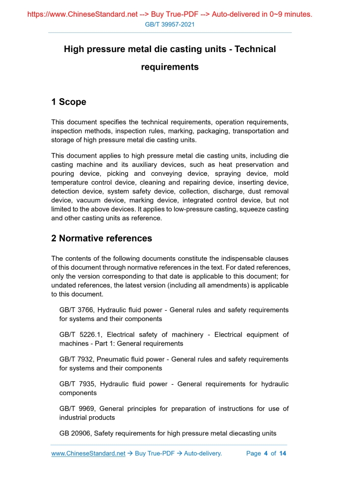 Similar standardsGB/T 39957-2021: High pressure metal die casting units - Technical requirements---This is an excerpt. Full copy of true-PDF in English version (including equations, symbols, images, flow-chart, tables, and figures etc.), auto-downloaded/delivered in 9 seconds, can be purchased online: https://www.ChineseStandard.net/PDF.aspx/GBT39957-2021GB NATIONAL STANDARD OF THE PEOPLE’S REPUBLIC OF CHINA ICS 25.120.30 CCS J 61 High pressure metal die casting units - Technical requirements ISSUED ON: MARCH 09, 2021 IMPLEMENTED ON: OCTOBER 01, 2021 Issued by: State Administration for Market Regulation; Standardization Administration of the People’s Republic of China. Table of ContentsForeword ... 3 1 Scope ... 4 2 Normative references ... 4 3 Terms and definitions ... 5 4 Technical requirements ... 5 5 Idle running requirements ... 11 6 Load running requirements ... 12 7 Inspection methods ... 12 8 Inspection rules ... 13 9 Marking, packaging, transportation and storage ... 13 High pressure metal die casting units - Technical requirements1 ScopeThis document specifies the technical requirements, operation requirements, inspection methods, inspection rules, marking, packaging, transportation and storage of high pressure metal die casting units. This document applies to high pressure metal die casting units, including die casting machine and its auxiliary devices, such as heat preservation and pouring device, picking and conveying device, spraying device, mold temperature control device, cleaning and repairing device, inserting device, detection device, system safety device, collection, discharge, dust removal device, vacuum device, marking device, integrated control device, but not limited to the above devices. It applies to low-pressure casting, squeeze casting and other casting units as reference.2 Normative referencesThe contents of the following documents constitute the indispensable clauses of this document through normative references in the text. For dated references, only the version corresponding to that date is applicable to this document; for undated references, the latest version (including all amendments) is applicable to this document. GB/T 3766, Hydraulic fluid power - General rules and safety requirements for systems and their components GB/T 5226.1, Electrical safety of machinery - Electrical equipment of machines - Part 1: General requirements GB/T 7932, Pneumatic fluid power - General rules and safety requirements for systems and their components GB/T 7935, Hydraulic fluid power - General requirements for hydraulic components GB/T 9969, General principles for preparation of instructions for use of industrial products GB 20906, Safety requirements for high pressure metal diecasting units 4.1.6 The working fluid medium of the high pressure metal die casting unit shall meet the requirements of the technical documents; the cleanliness of the hydraulic system of the die casting unit shall meet the requirements of 6.4 in GB/T 31562-2015; the cleanliness code is 22/19. 4.1.7 The regulating valve stem of each control mechanism of the high pressure metal die casting unit shall be flexible, reliable and positioned correctly after assembly. 4.1.8 The safety of the high pressure metal die casting unit shall meet the requirements of GB 20906. 4.1.9 There shall be a safety interlock function between the die casting machine and the picking, spraying, heat preservation and pouring devices, so as to prevent mechanical damage which is caused by malfunction. 4.1.10 In abnormal situations such as power failure, each device shall have a mechanical anti-drop function. 4.1.11 The technical documents that are provided with the high pressure metal die casting unit shall at least include operation instruction manual, certificate of conformity, and packing list. The operation instruction manual shall meet the requirements of GB/T 9969. 4.2 Die casting machine 4.2.1 The die casting machine shall have manual, semi-automatic and automatic working modes. 4.2.2 The cold chamber die casting machine shall meet the requirements of GB/T 21269. 4.2.3 The hot-chamber die casting machine shall meet the requirements of JB/T 6309.3. 4.3 Heat preservation and pouring device 4.3.1 The melting furnace shall meet the requirements of JB/T 13238. 4.3.2 The holding furnace shall meet the working range of the die casting machine and the heat preservation and pouring device. 4.3.3 The holding furnace shall have the operating parameter information transmission function, to feed back information such as temperature to the integrated control system. 4.3.4 The heat preservation and pouring device shall meet the requirements of JB/T 11554.2. shall return to the original position of the robot after completing a spraying cycle instead of manually. 4.6 Mold temperature control device 4.6.1 The mold temperature control device shall have a medium recovery function. 4.6.2 The mold temperature control device shall have heating, cooling and constant-temperature functions. 4.6.3 The working pressure of the mold temperature control device shall be less than or equal to 1.0 MPa. 4.6.4 The temperature of the water circulation mold temperature control device shall be less than or equal to 180 °C. 4.6.5 The temperature of the oil circulation mold temperature control device shall be less than or equal to 320 °C. 4.6.6 The temperature control accuracy of the mold temperature control device should be ±1 °C. 4.7 Cleaning and repairing device 4.7.1 The cleaning and repairing device shall not cause damage to the die casting body. 4.7.2 The cycle period of the cleaning and repairing device shall be less than the die casting cycle period. 4.7.3 The cleaning and repairing device shall have a debris recovery function. 4.7.4 The cleaning and repairing device shall be equipped with a waste container underneath. 4.8 Inserting device 4.8.1 The inserting device shall have manual, semi-automatic and automatic feeding functions. 4.8.2 The inser