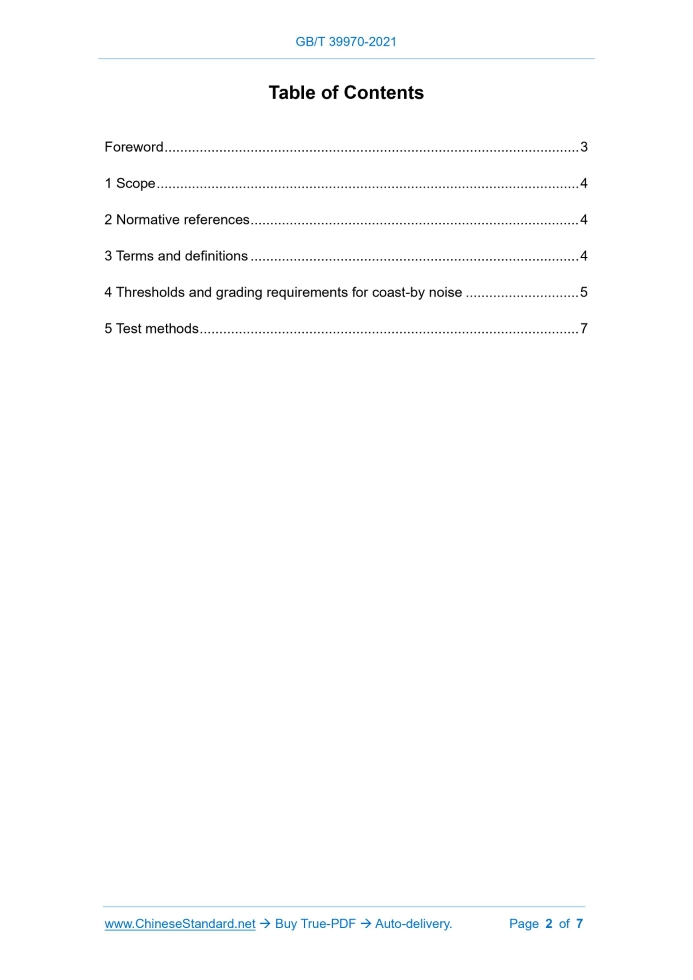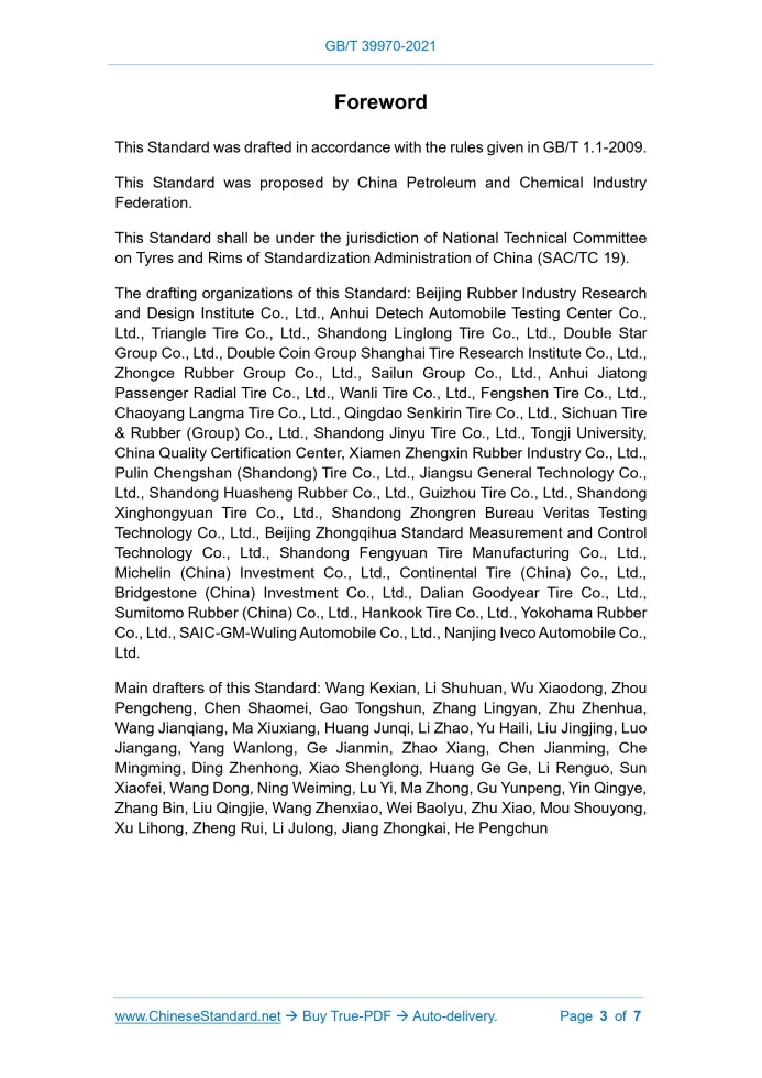 Similar standardsGB/T 39970-2021: Thresholds and grading of coast-by noise for motor vehicle tyres---This is an excerpt. Full copy of true-PDF in English version (including equations, symbols, images, flow-chart, tables, and figures etc.), auto-downloaded/delivered in 9 seconds, can be purchased online: https://www.ChineseStandard.net/PDF.aspx/GBT39970-2021GB NATIONAL STANDARD OF THE PEOPLE’S REPUBLIC OF CHINA ICS 83.160.10 G 41 Thresholds and grading of coast-by noise for motor vehicle tyres ISSUED ON: MAY 21, 2021 IMPLEMENTED ON: DECEMBER 01, 2021 Issued by: State Administration for Market Regulation; Standardization Administration of the People's Republic of China. Table of ContentsForeword ... 3 1 Scope ... 4 2 Normative references ... 4 3 Terms and definitions ... 4 4 Thresholds and grading requirements for coast-by noise ... 5 5 Test methods ... 7ForewordThis Standard was drafted in accordance with the rules given in GB/T 1.1-2009. This Standard was proposed by China Petroleum and Chemical Industry Federation. This Standard shall be under the jurisdiction of National Technical Committee on Tyres and Rims of Standardization Administration of China (SAC/TC 19). The drafting organizations of this Standard: Beijing Rubber Industry Research and Design Institute Co., Ltd., Anhui Detech Automobile Testing Center Co., Ltd., Triangle Tire Co., Ltd., Shandong Linglong Tire Co., Ltd., Double Star Group Co., Ltd., Double Coin Group Shanghai Tire Research Institute Co., Ltd., Zhongce Rubber Group Co., Ltd., Sailun Group Co., Ltd., Anhui Jiatong Passenger Radial Tire Co., Ltd., Wanli Tire Co., Ltd., Fengshen Tire Co., Ltd., Chaoyang Langma Tire Co., Ltd., Qingdao Senkirin Tire Co., Ltd., Sichuan Tire & Rubber (Group) Co., Ltd., Shandong Jinyu Tire Co., Ltd., Tongji University, China Quality Certification Center, Xiamen Zhengxin Rubber Industry Co., Ltd., Pulin Chengshan (Shandong) Tire Co., Ltd., Jiangsu General Technology Co., Ltd., Shandong Huasheng Rubber Co., Ltd., Guizhou Tire Co., Ltd., Shandong Xinghongyuan Tire Co., Ltd., Shandong Zhongren Bureau Veritas Testing Technology Co., Ltd., Beijing Zhongqihua Standard Measurement and Control Technology Co., Ltd., Shandong Fengyuan Tire Manufacturing Co., Ltd., Michelin (China) Investment Co., Ltd., Continental Tire (China) Co., Ltd., Bridgestone (China) Investment Co., Ltd., Dalian Goodyear Tire Co., Ltd., Sumitomo Rubber (China) Co., Ltd., Hankook Tire Co., Ltd., Yokohama Rubber Co., Ltd., SAIC-GM-Wuling Automobile Co., Ltd., Nanjing Iveco Automobile Co., Ltd. Main drafters of this Standard: Wang Kexian, Li Shuhuan, Wu Xiaodong, Zhou Pengcheng, Chen Shaomei, Gao Tongshun, Zhang Lingyan, Zhu Zhenhua, Wang Jianqiang, Ma Xiuxiang, Huang Junqi, Li Zhao, Yu Haili, Liu Jingjing, Luo Jiangang, Yang Wanlong, Ge Jianmin, Zhao Xiang, Chen Jianming, Che Mingming, Ding Zhenhong, Xiao Shenglong, Huang Ge Ge, Li Renguo, Sun Xiaofei, Wang Dong, Ning Weiming, Lu Yi, Ma Zhong, Gu Yunpeng, Yin Qingye, Zhang Bin, Liu Qingjie, Wang Zhenxiao, Wei Baolyu, Zhu Xiao, Mou Shouyong, Xu Lihong, Zheng Rui, Li Julong, Jiang Zhongkai, He Pengchun Thresholds and grading of coast-by noise for motor vehicle tyres1 ScopeThis Standard specifies the thresholds and grading requirements and test methods for coast-by noise for motor vehicle tyres. This Standard is applicable to new vehicle radial tyres and new mini, light truck radial tyres and new truck radial tyres, excluding tyres with nominal rim diameter ≤10 inches and nominal rim diameter ≥25 inches, T-type spare tyres for temporary use only, special ST metric tyres for road trailers, high-passability radial tyres for light truck vehicle, heavy truck tyres with a speed capability of 80km/h (not included), racing tyres, studded tyres and professional off-road tyres.2 Normative referencesThe following referenced documents are indispensable for the application of this document. For dated references, only the edition cited applies. For undated references, the latest edition of the referenced document (including any amendments) applies. GB/T 6326, Tyre terms and definitions GB/T 22036, Coast-by methods for measurement of tyre-to-road sound emission3 Terms and definitionsFor the purposes of this document, the terms and definitions defined in GB/T 6326 as well as the followings apply. 3.1 traction tyre Tyres that are mainly designed for driving wheels of vehicles. Compared with ordinary tyres, this type of tyre has better gripping performance and can transmit the power of the vehicle to the maximum extent. The tyre tread has at least 2 circumferential strip patterns. Each pattern contains no less than 30 pattern blocks. These blocks are separated by grooves and small sipes that are ......Source: Above contents are excerpted from the full-copy PDF -- translated/reviewed by: www.ChineseStandard.net / Wayne Zheng et al. Tips & Frequently Asked Questions:Question 1: How long will the true-PDF of English version of GB/T 39970-2021 be delivered?Answer: The full copy PDF of English version of GB/T 39970-2021 can be downloaded in 9 seconds, and it will also be emailed to you in 9 seconds (double mechanisms to ensure the delivery reliably), with PDF-invoice.Question 2: Can I share the purchased PDF of GB/T 39970-2021_English with my colleagues?Answer: Yes. The purchased PDF of GB/T 39970-2021_English will be deemed to be sold to your employer/organization who actually paid for it, including your colleagues and your employer's intranet.Question 3: Does the price include tax/VAT?Answer: Yes. Our tax invoice, downloaded/delivered in 9 seconds, includes all tax/VAT and complies with 100+ countries' tax regulations (tax exempted in 100+ countries) -- See Avoidance of Double Taxation Agreements (DTAs): List of DTAs signed between Singapore and 100+ countriesQuestion 4: Do you accept my currency other than USD?Answer: Yes. www.ChineseStandard.us -- GB/T 39970-2021 -- Click this link and select your country/currency to pay, the exact amount in